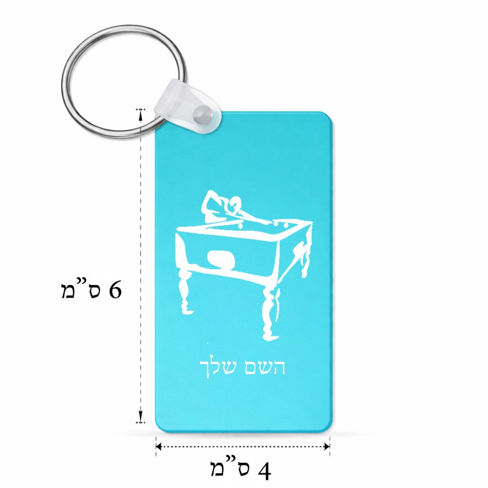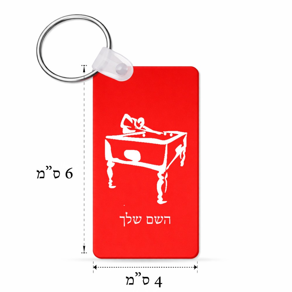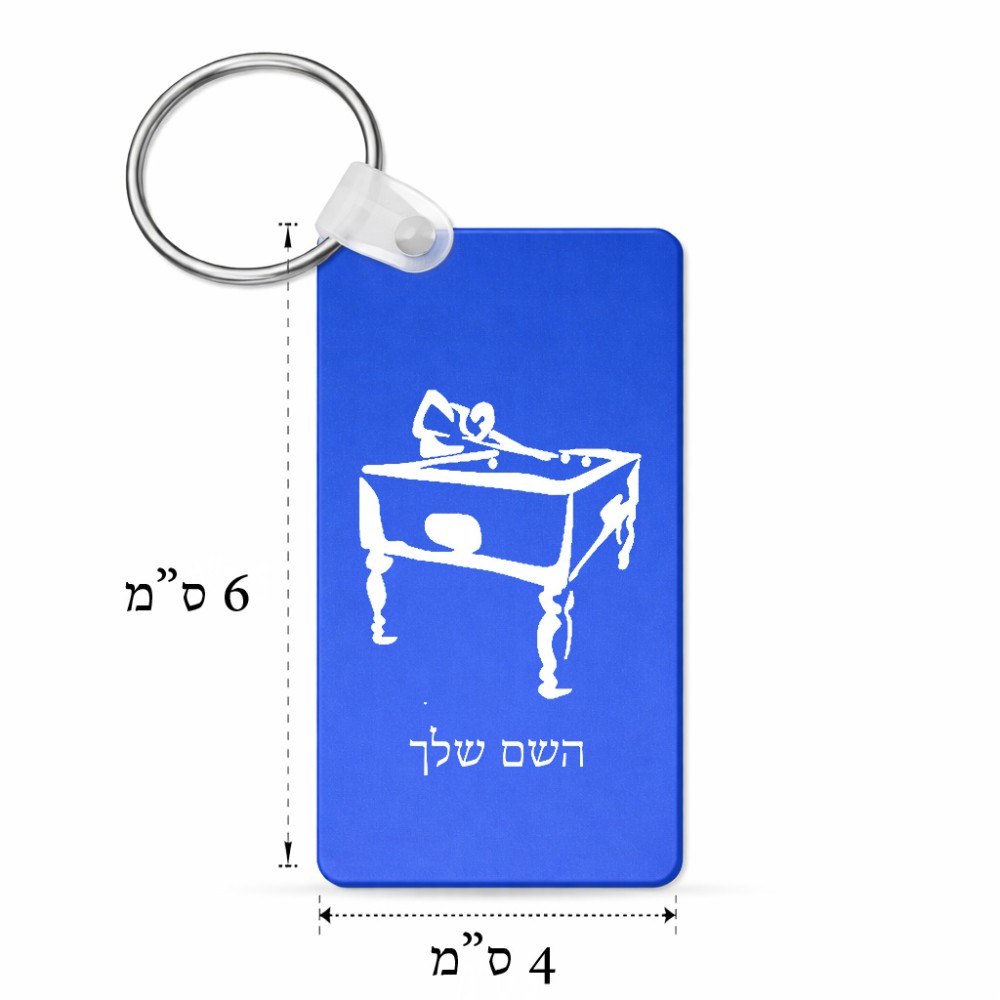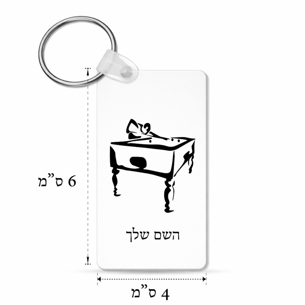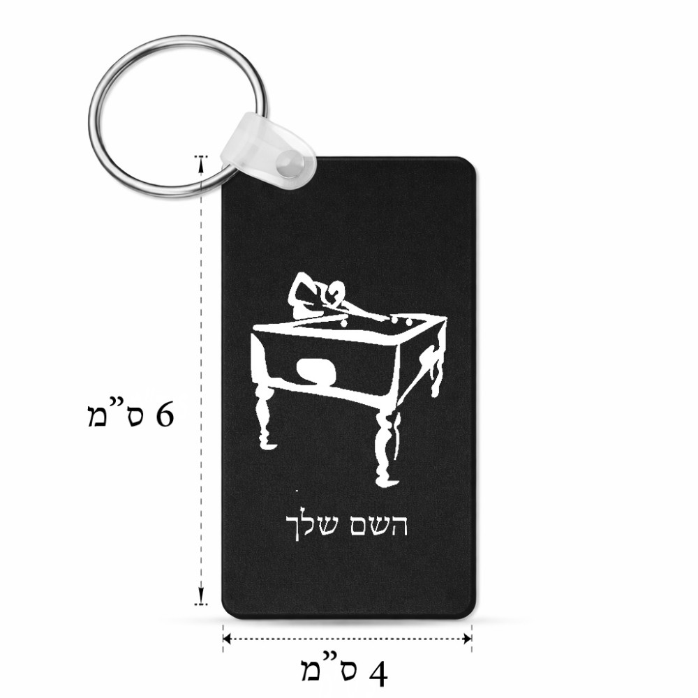 מחזיק מפתחות בצורת מלבן בעיצוב אישי עם השם שלך בעיצוב שחקן ביליארד גודל המחזיק 6 × 4 ס"מ. את השם המבוקש ניתן לציין בהזמנה, אם לא צויין אנחנו ניצור קשר לבירור.