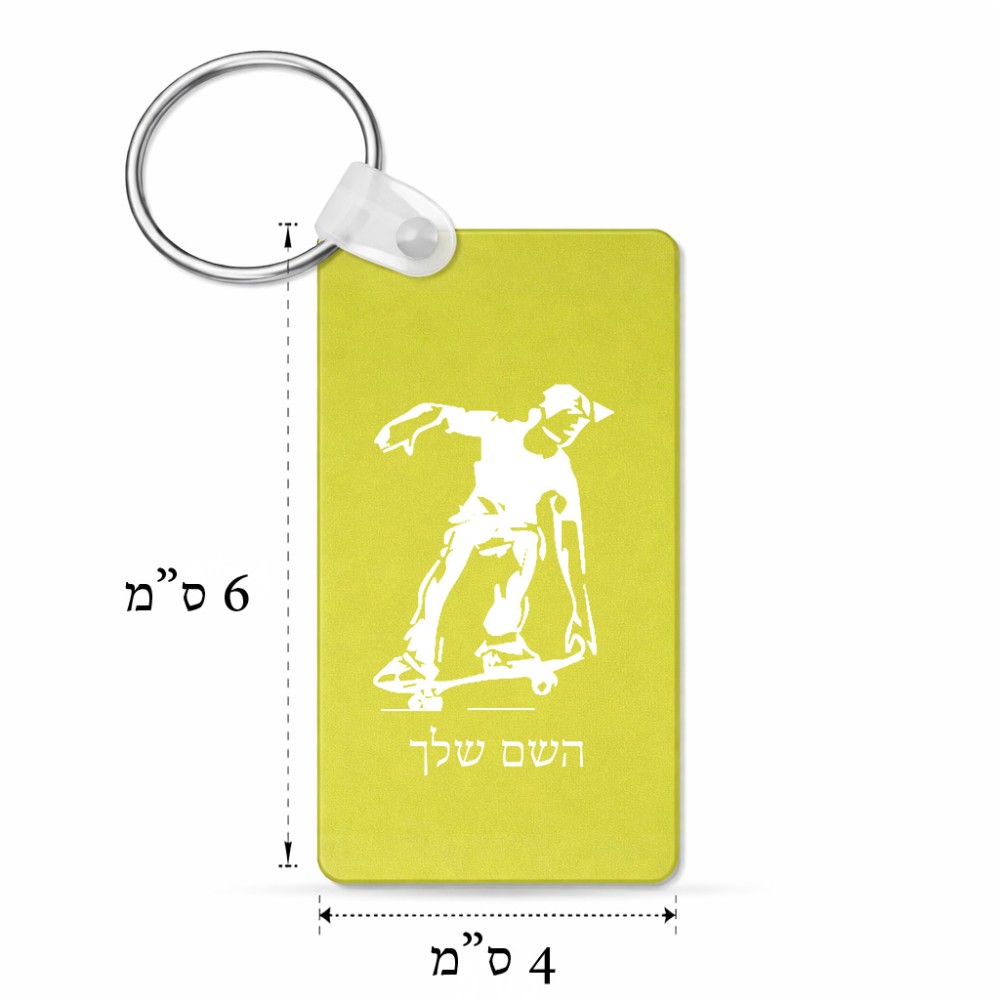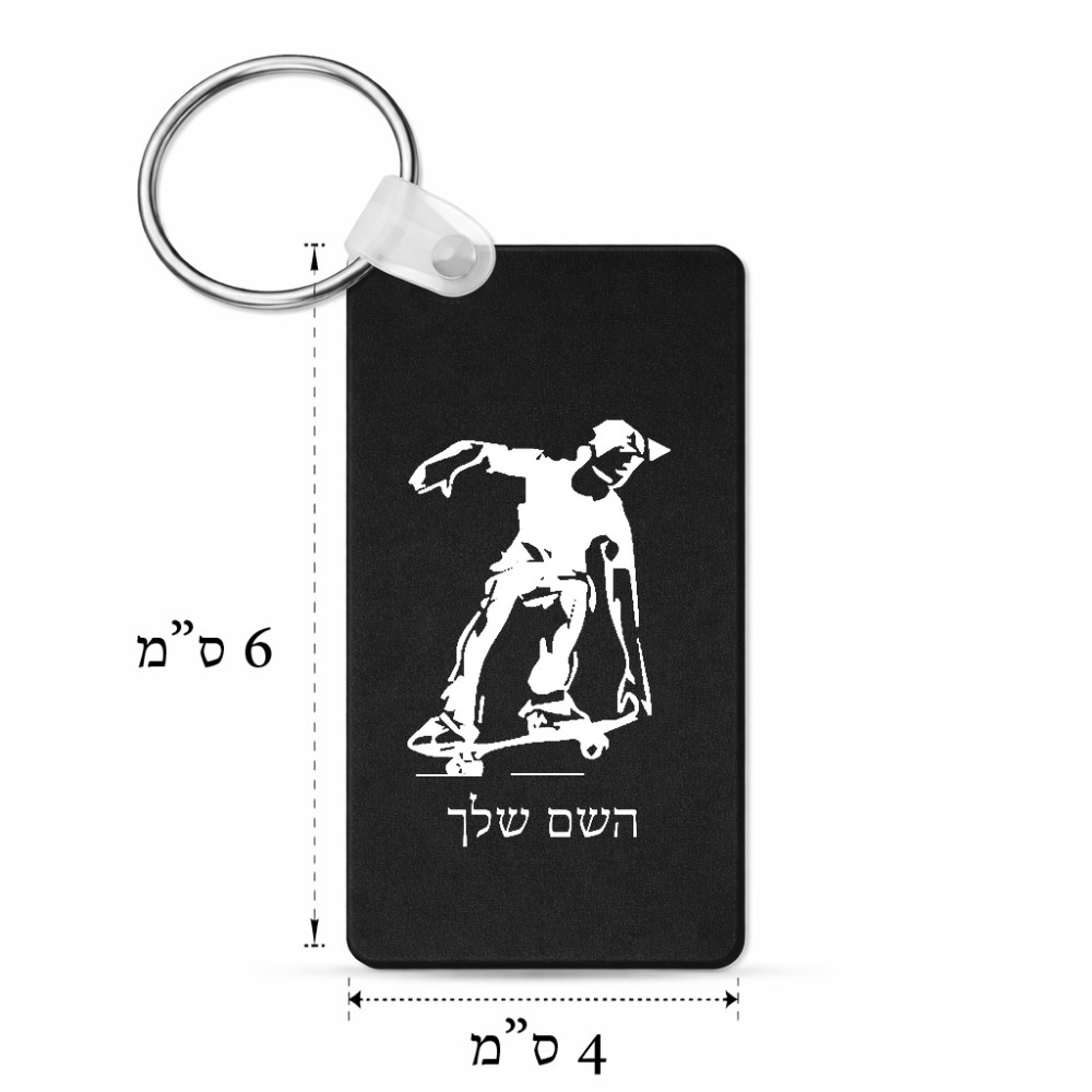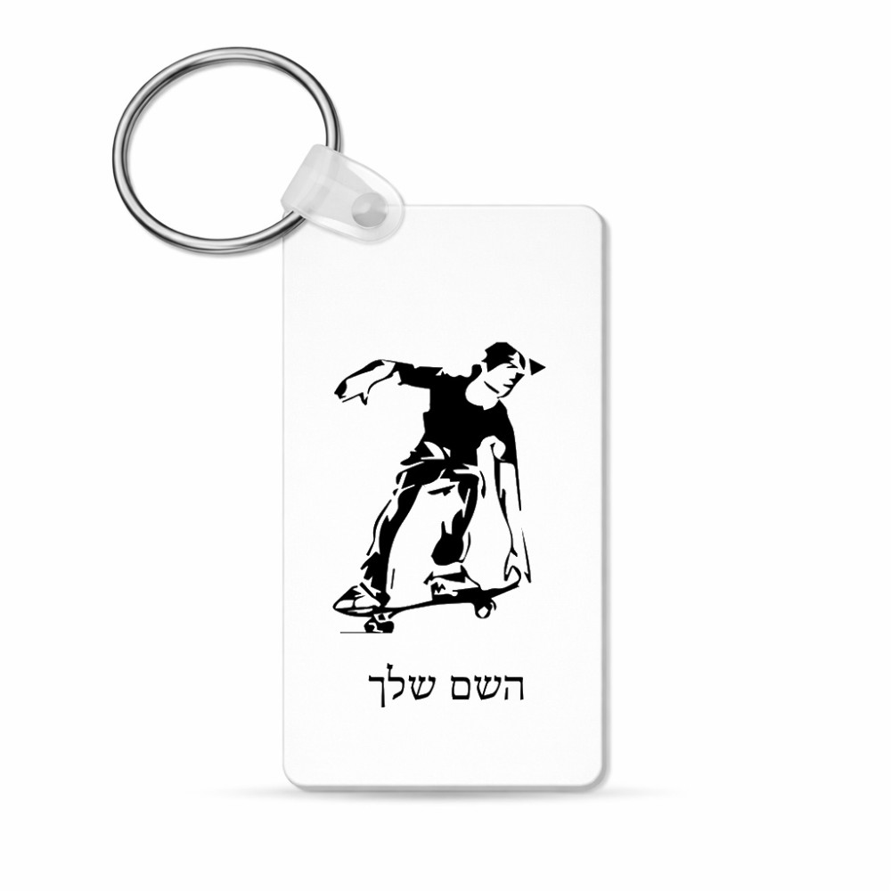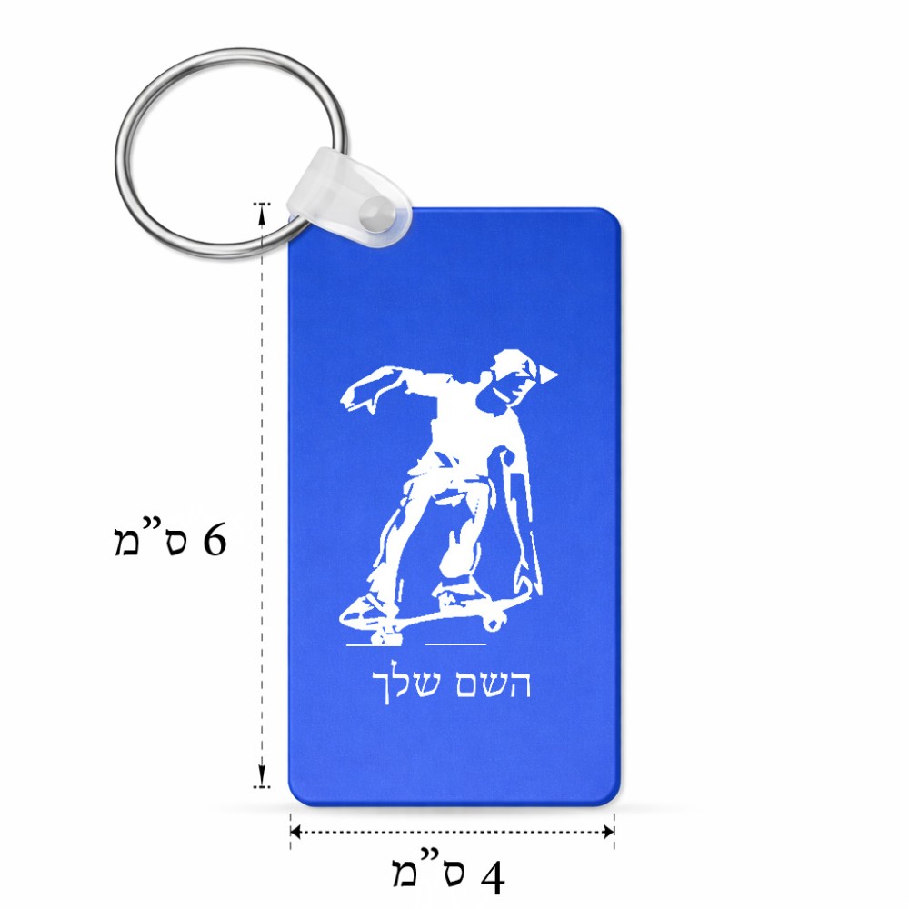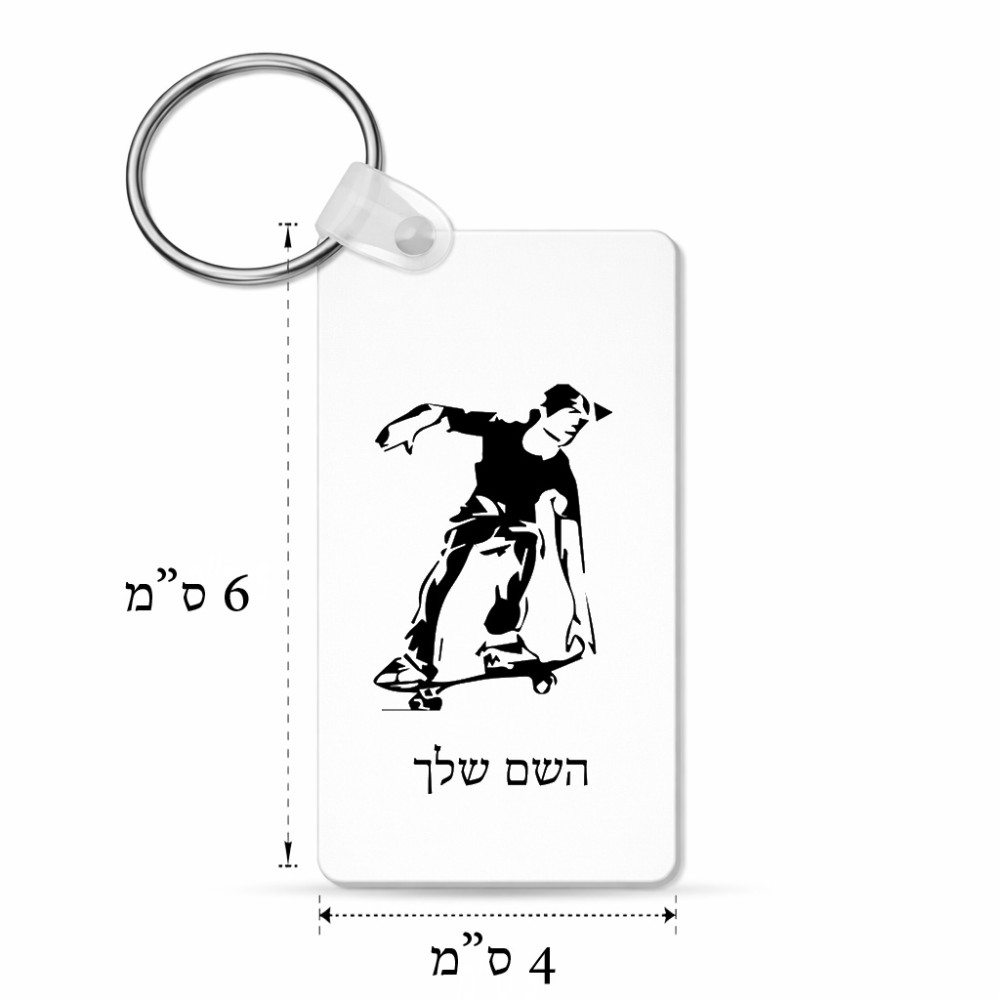 מחזיק מפתחות בצורת מלבן בעיצוב אישי עם השם שלך בעיצוב ילד סקייטבורד גודל המחזיק 6 × 4 ס"מ. את השם המבוקש ניתן לציין בהזמנה, אם לא צויין אנחנו ניצור קשר לבירור.