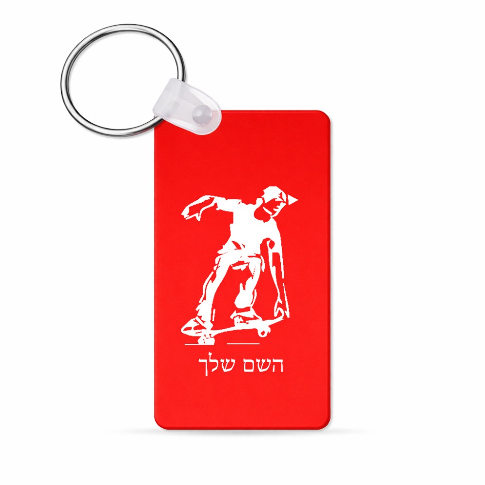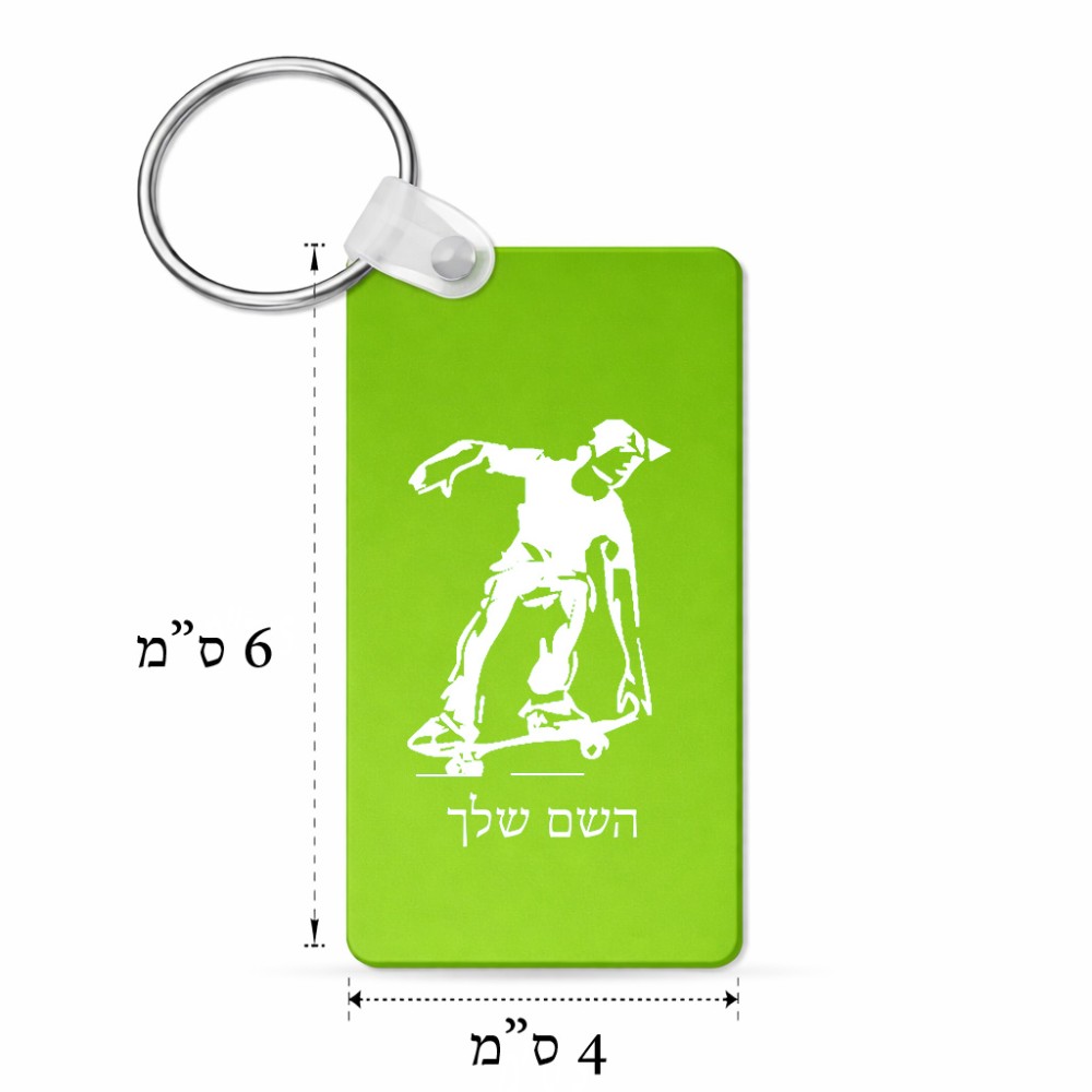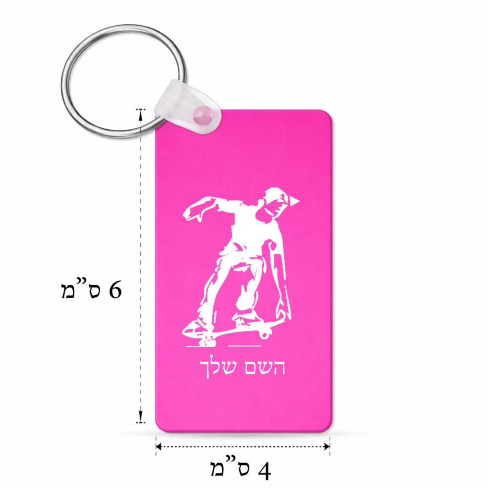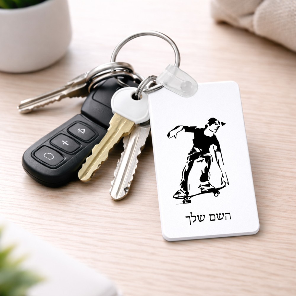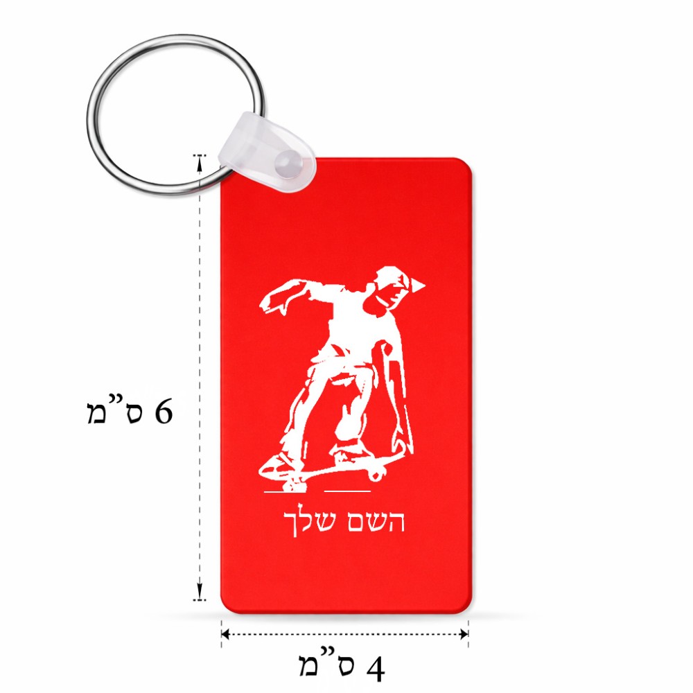 מחזיק מפתחות בצורת מלבן בעיצוב אישי עם השם שלך בעיצוב ילד סקייטבורד גודל המחזיק 6 × 4 ס"מ. את השם המבוקש ניתן לציין בהזמנה, אם לא צויין אנחנו ניצור קשר לבירור.