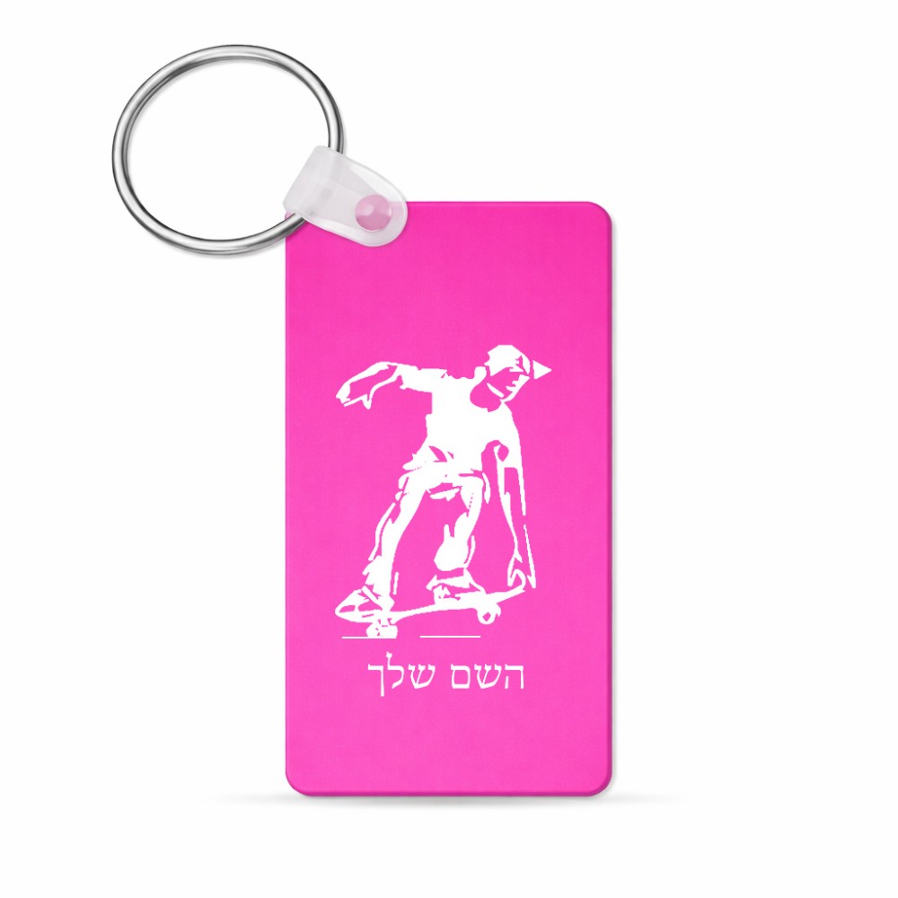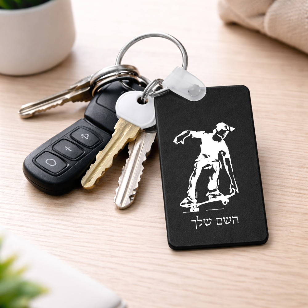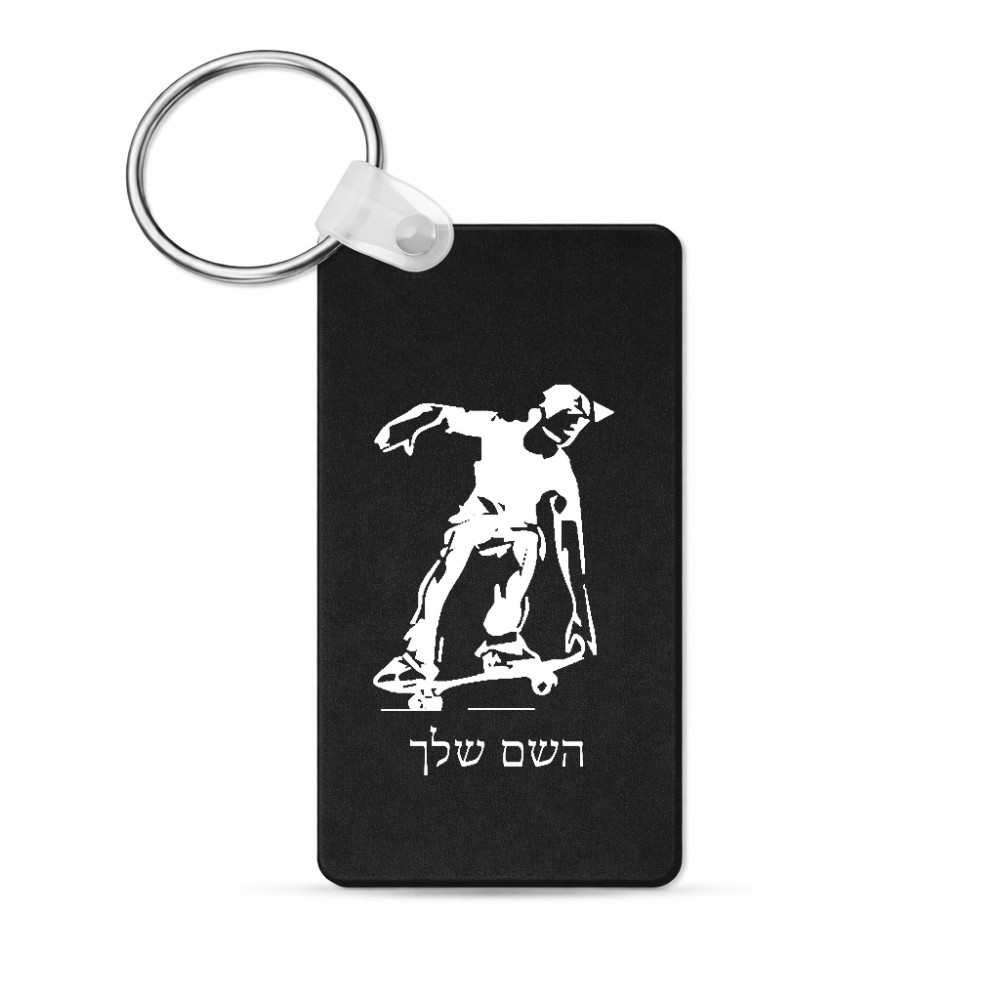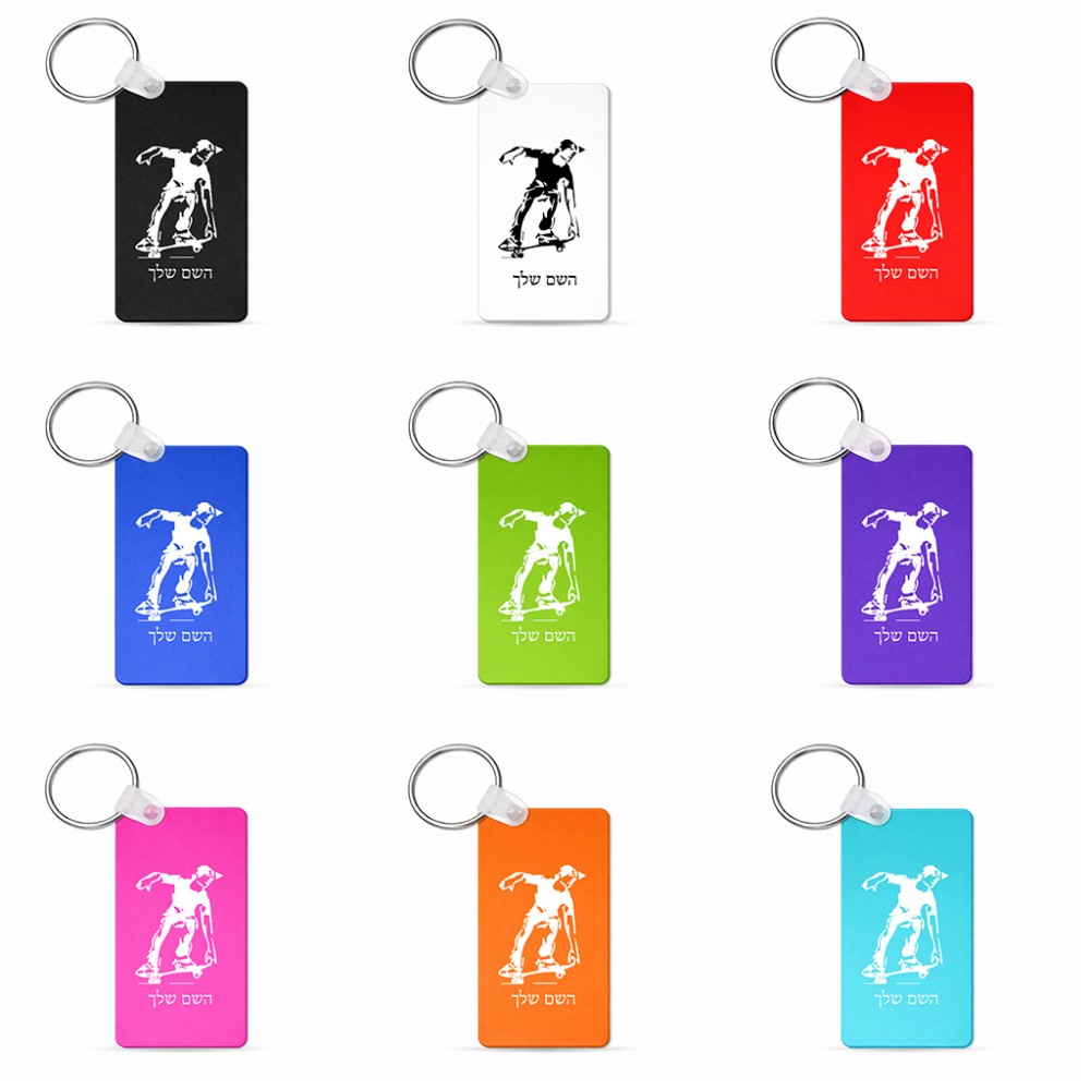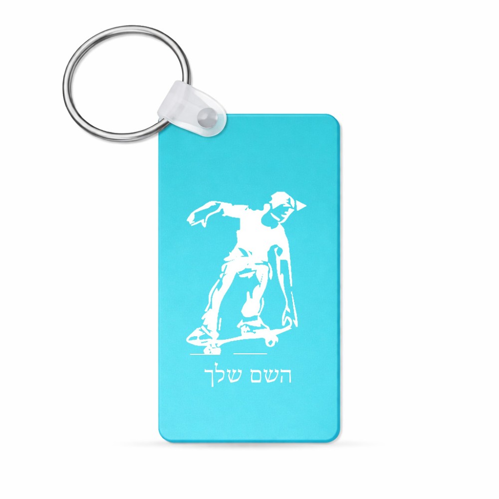 מחזיק מפתחות בצורת מלבן בעיצוב אישי עם השם שלך בעיצוב ילד סקייטבורד גודל המחזיק 6 × 4 ס"מ. את השם המבוקש ניתן לציין בהזמנה, אם לא צויין אנחנו ניצור קשר לבירור.