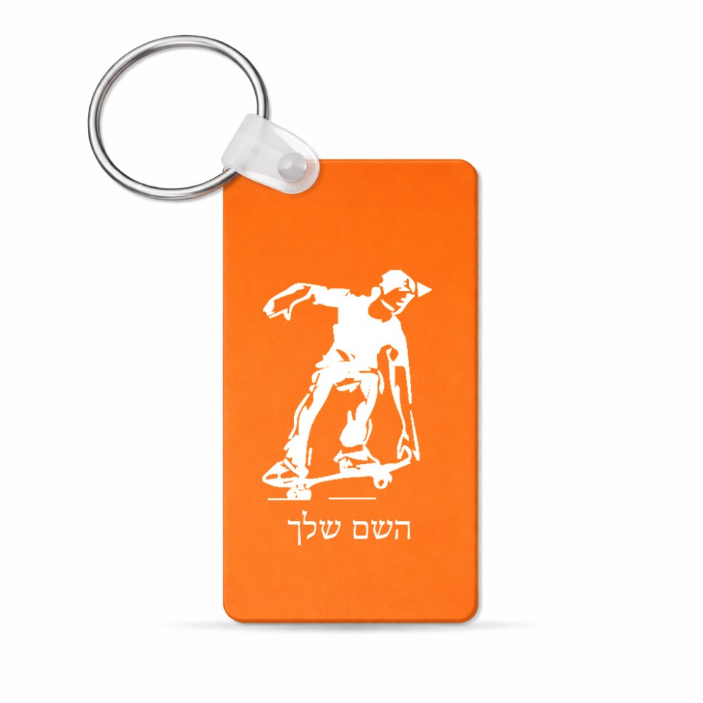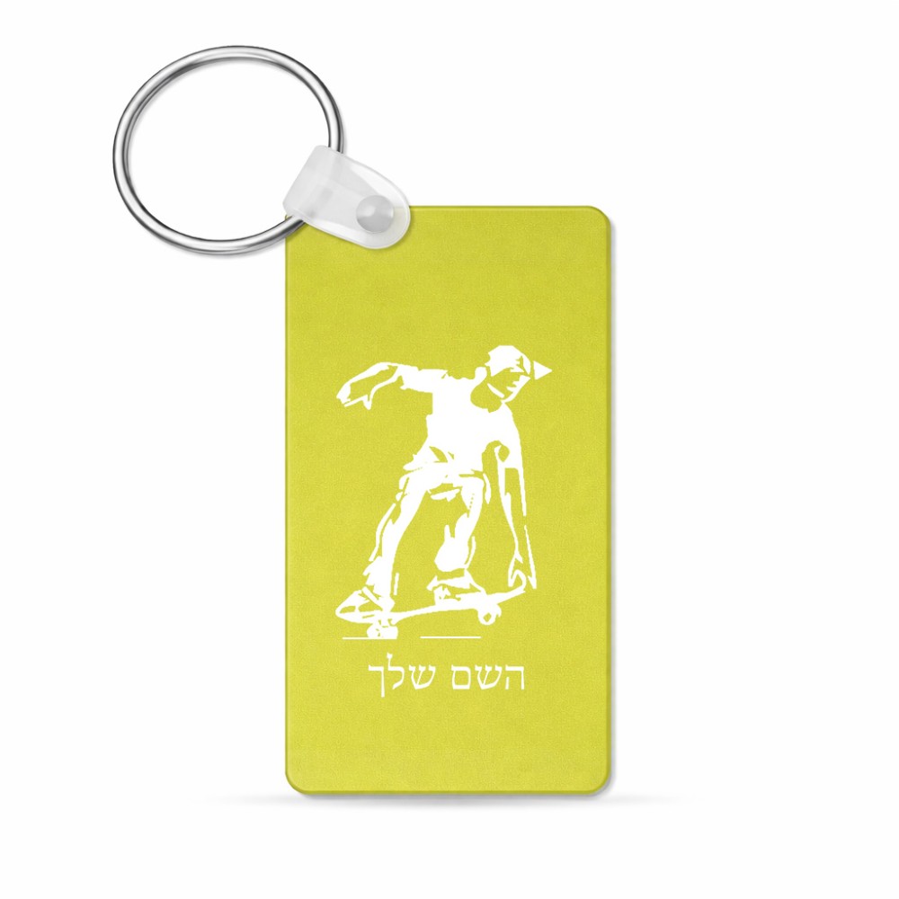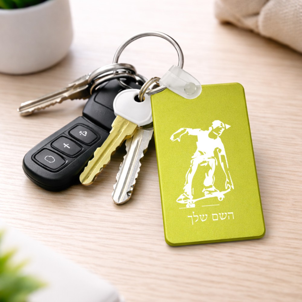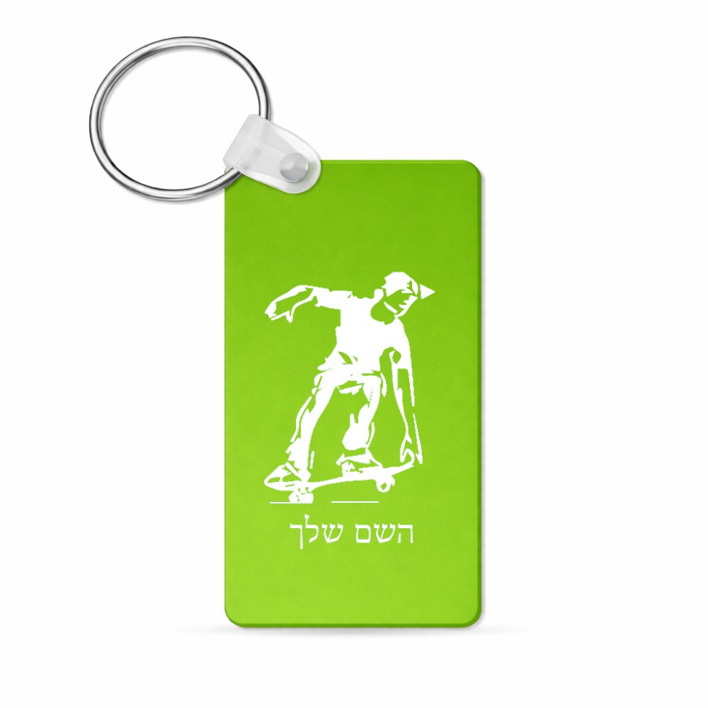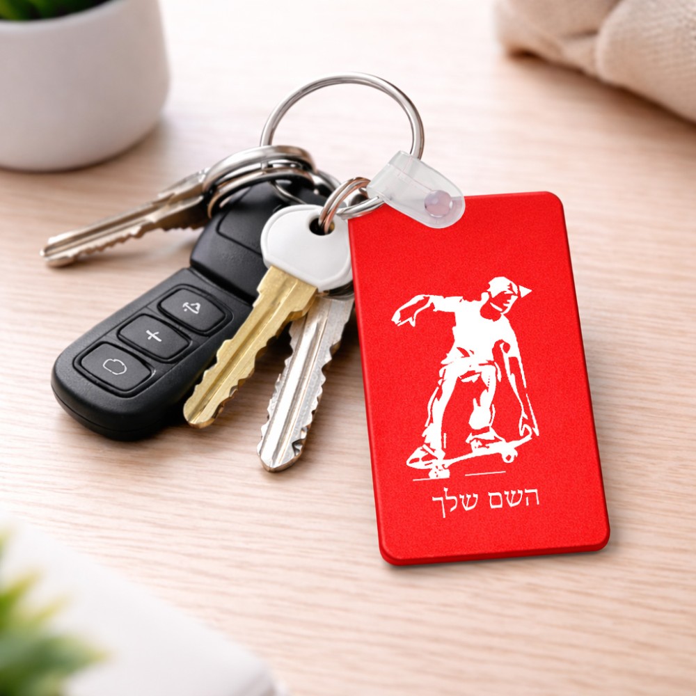 מחזיק מפתחות בצורת מלבן בעיצוב אישי עם השם שלך בעיצוב ילד סקייטבורד גודל המחזיק 6 × 4 ס"מ. את השם המבוקש ניתן לציין בהזמנה, אם לא צויין אנחנו ניצור קשר לבירור.