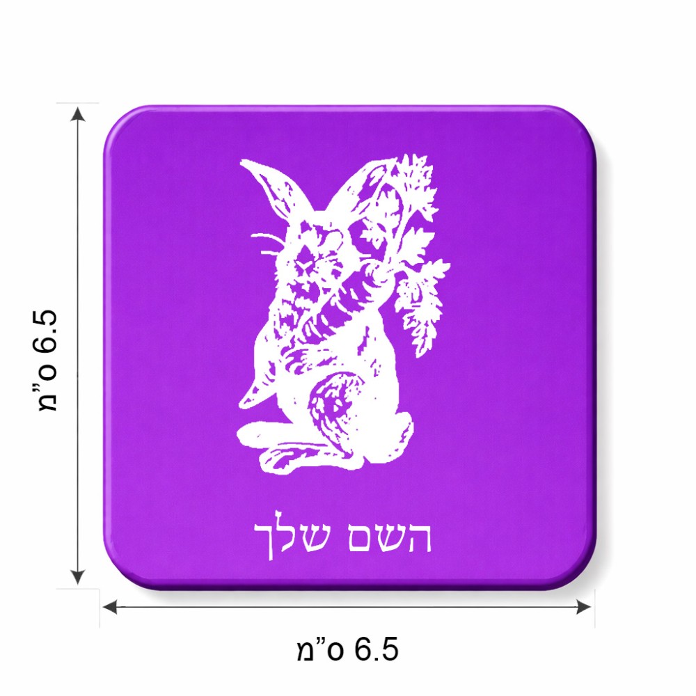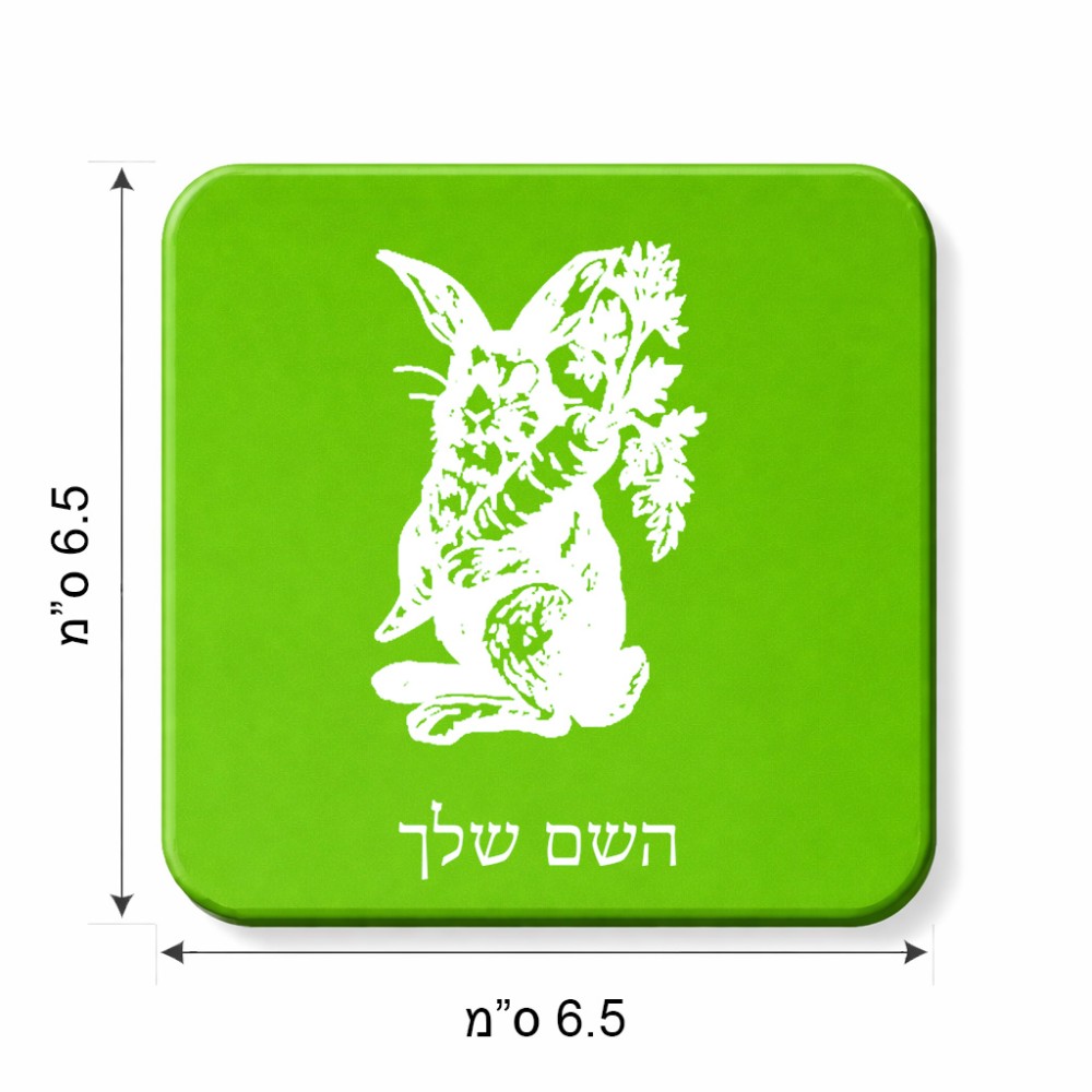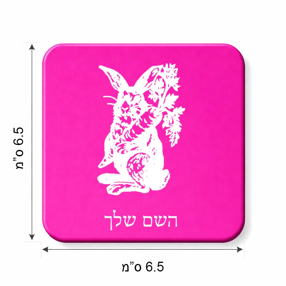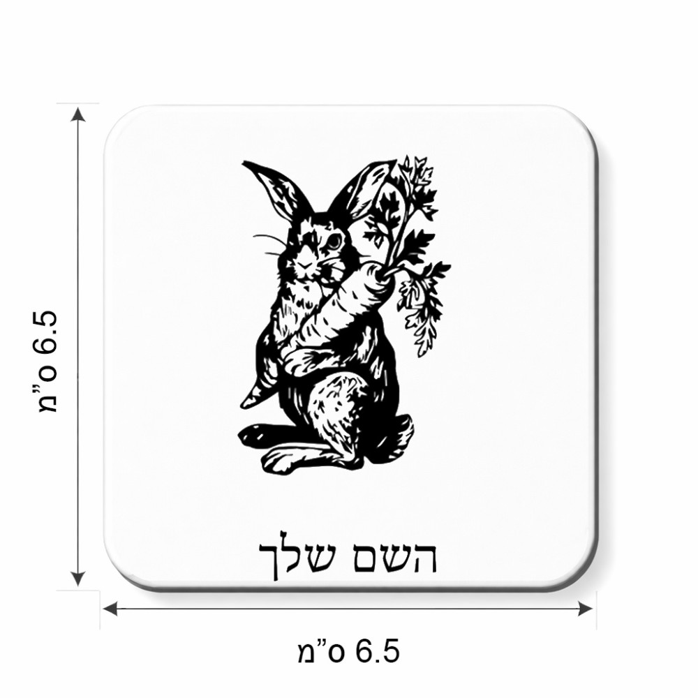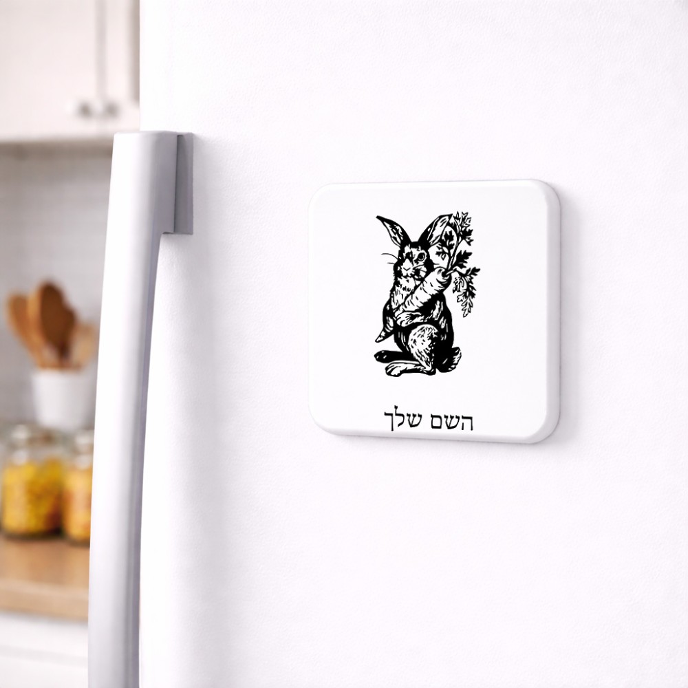מגנט למקרר בעיצוב אישי עם השם שלך בעיצוב ארנב מחזיק גזר גודל המגנט 6.5 × 6.5 ס"מ. את השם המבוקש ניתן לציין בהזמנה, אם לא צויין אנחנו ניצור קשר לבירור.