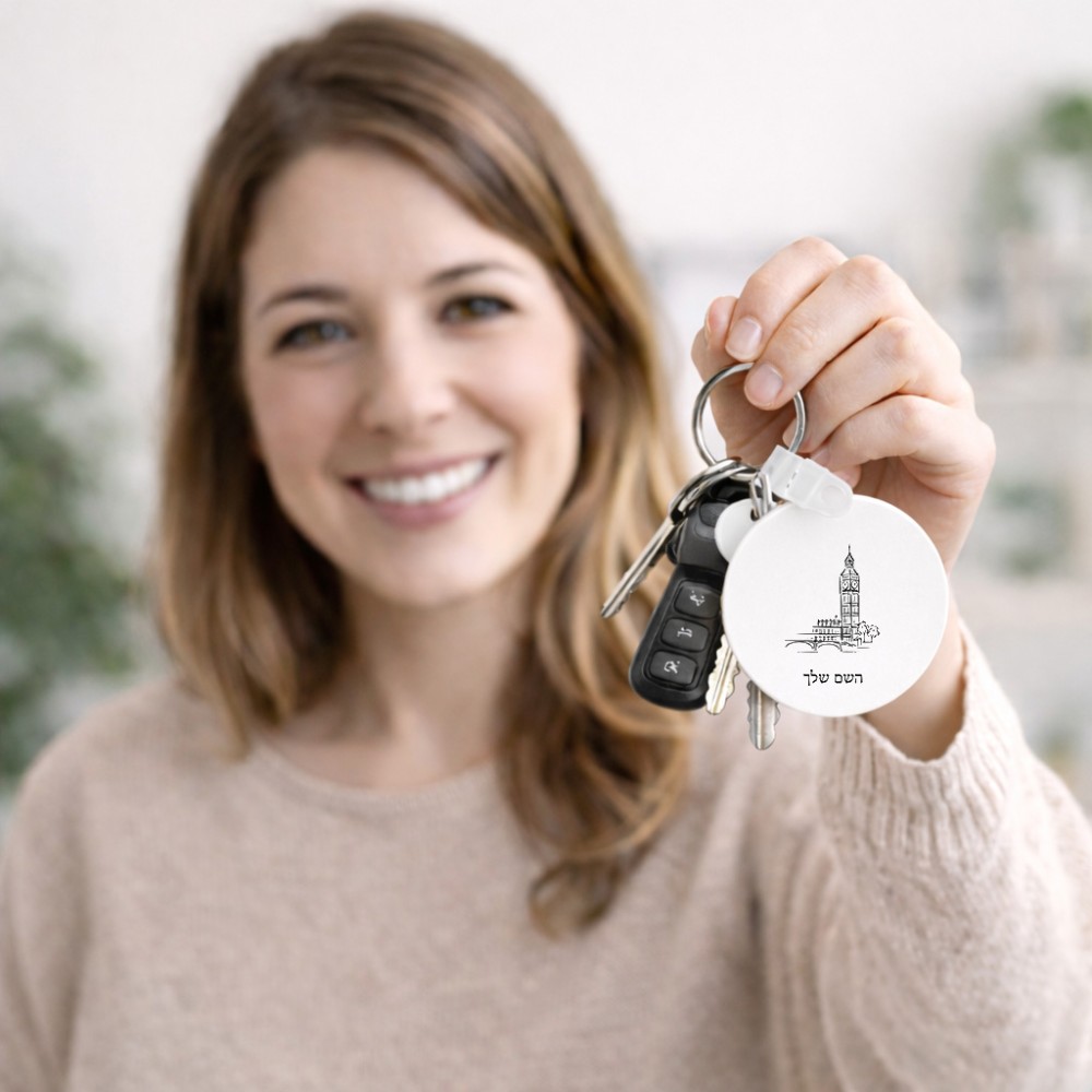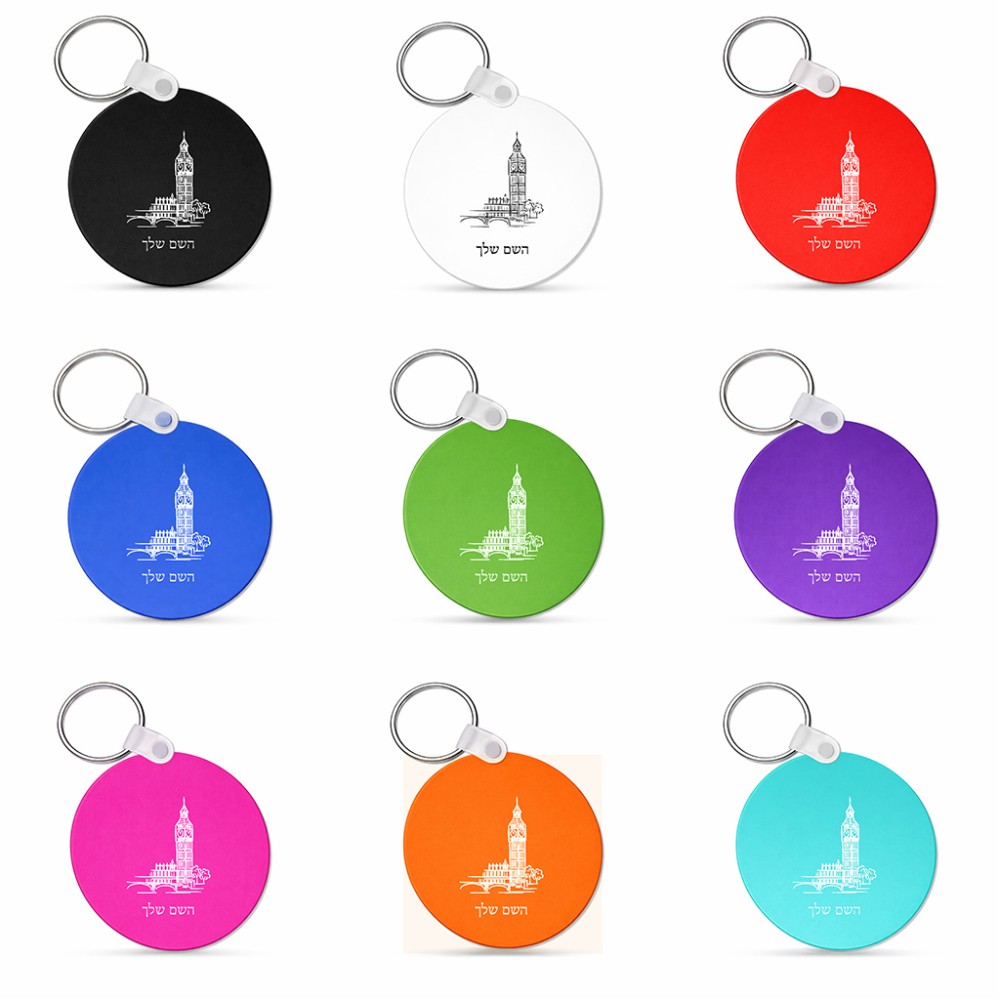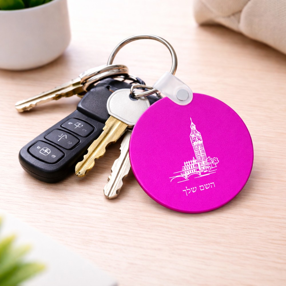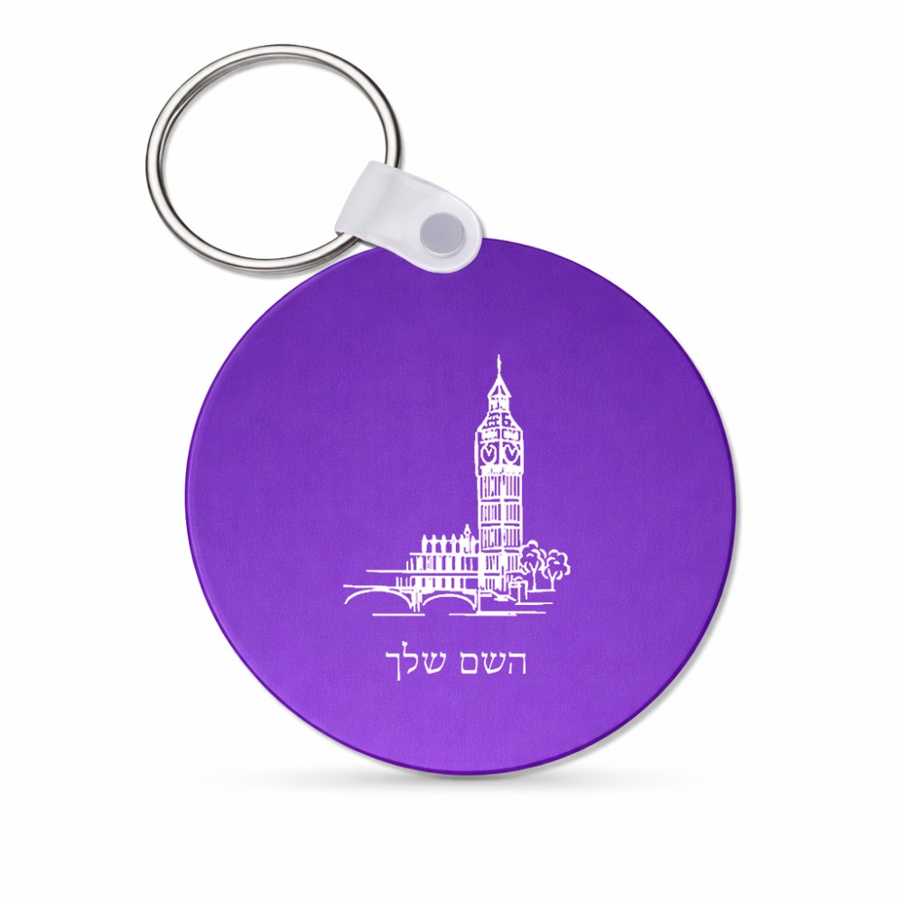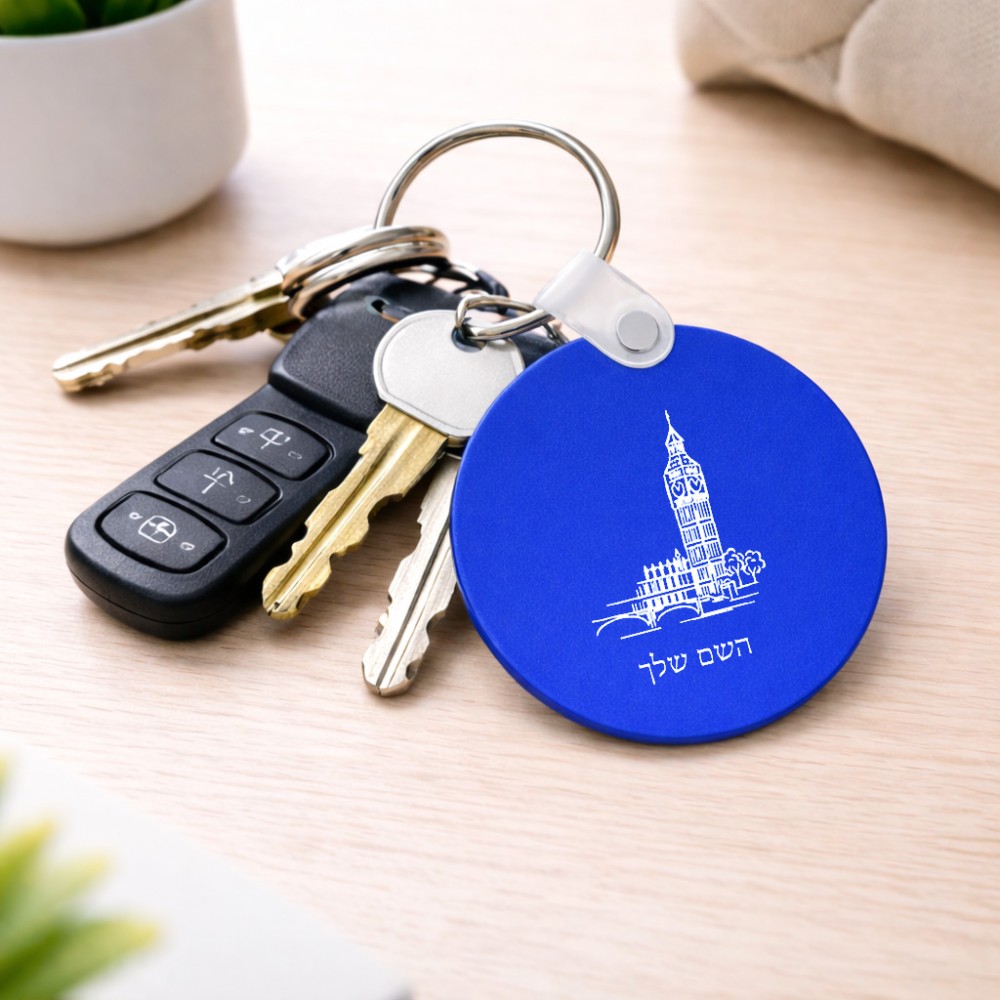 מחזיק מפתחות בצורת עיגול בעיצוב אישי עם השם שלך בעיצוב ביג בן גודל המחזיק 5 × 5 ס"מ. את השם המבוקש ניתן לציין בהזמנה, אם לא צויין אנחנו ניצור קשר לבירור.