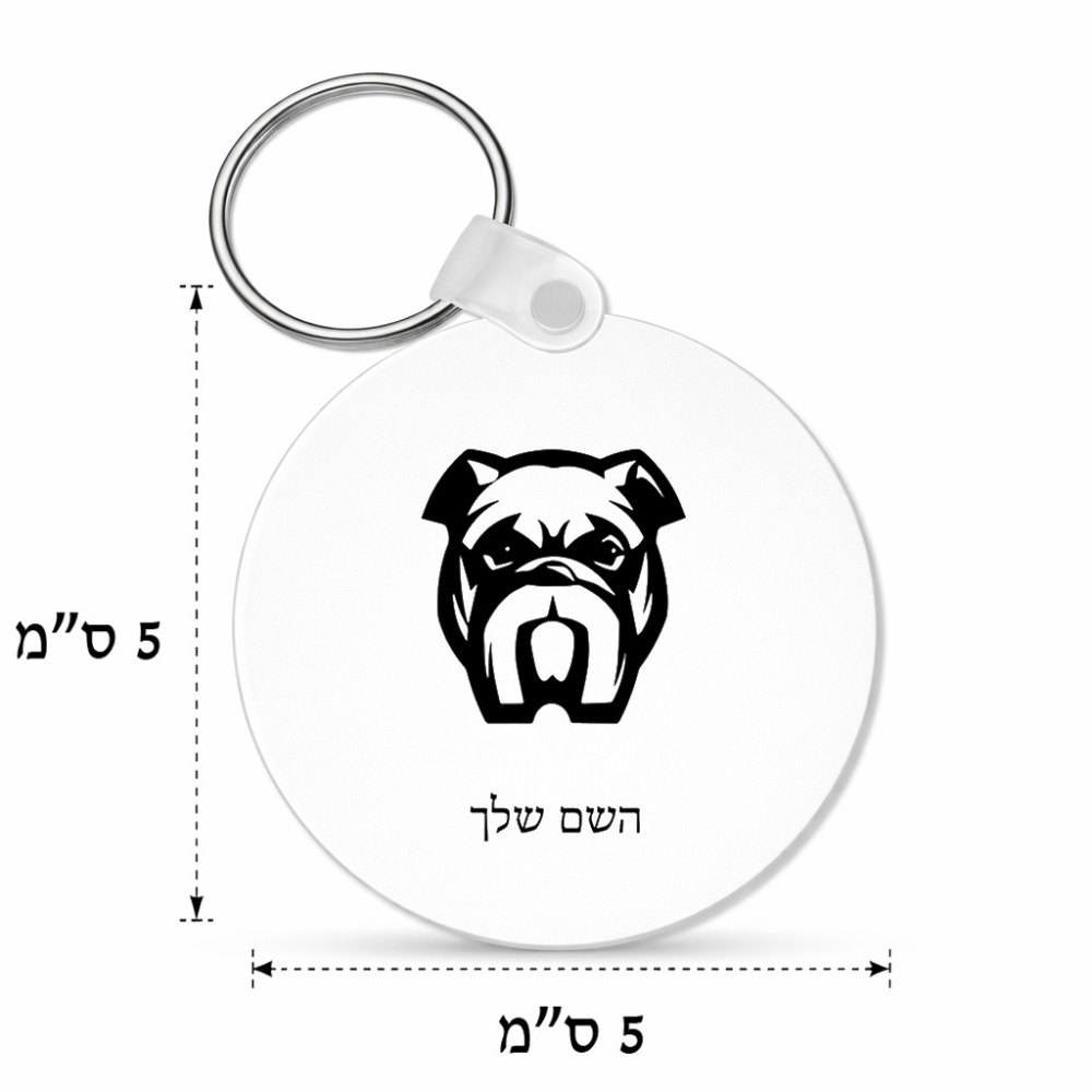 מחזיק מפתחות בצורת עיגול בעיצוב אישי עם השם שלך בעיצוב פרצוף בולדוג גודל המחזיק 5 × 5 ס"מ. את השם המבוקש ניתן לציין בהזמנה, אם לא צויין אנחנו ניצור קשר לבירור.