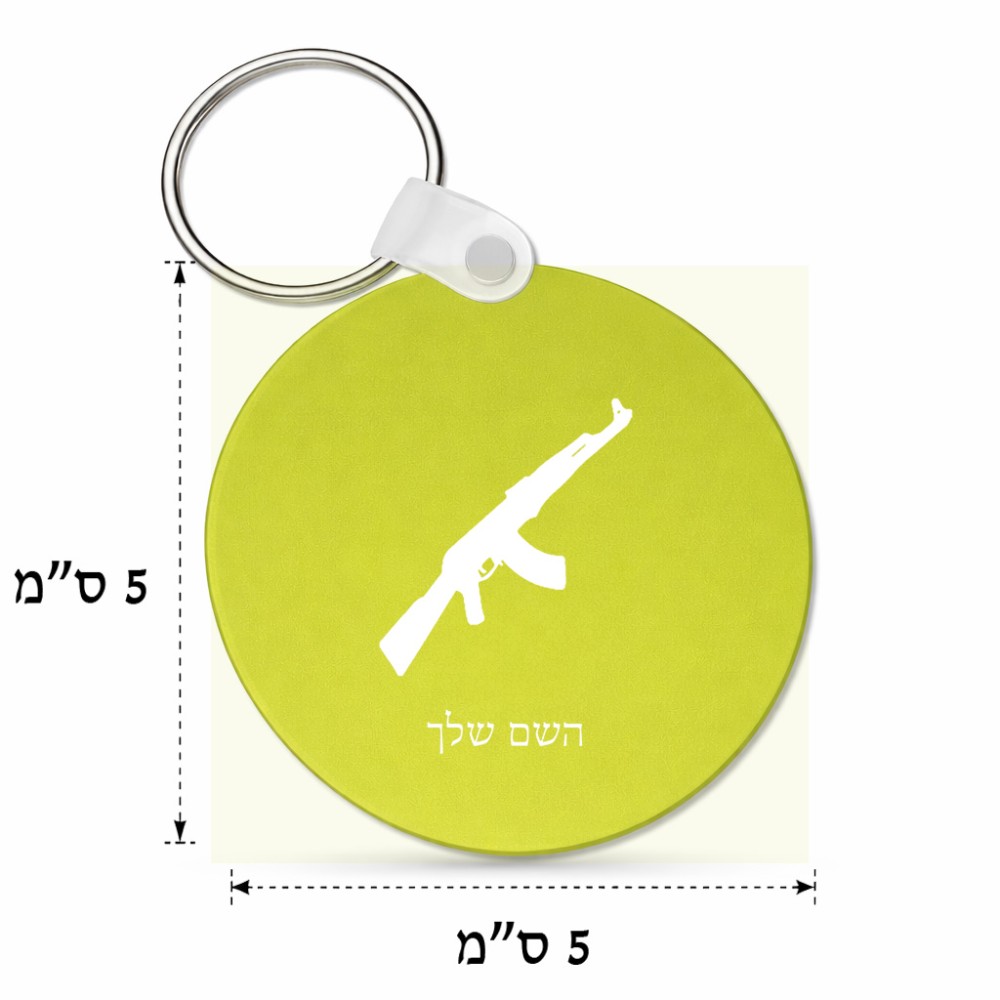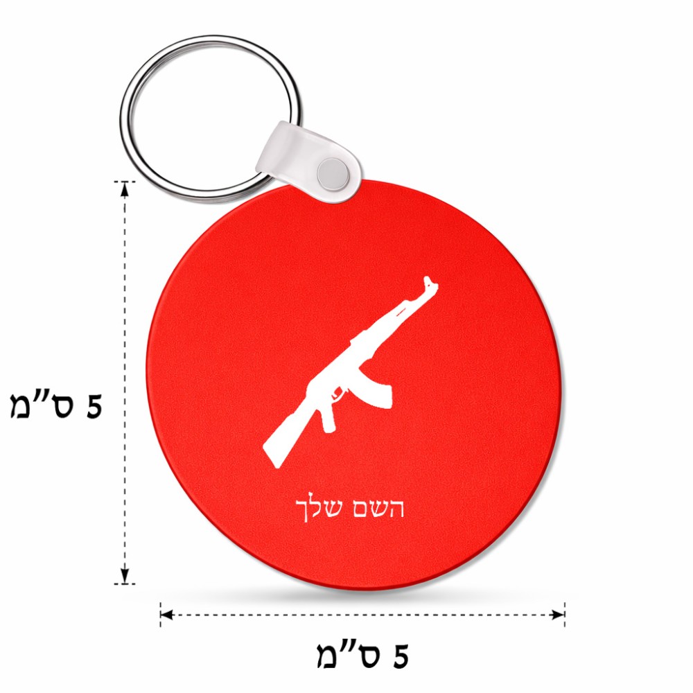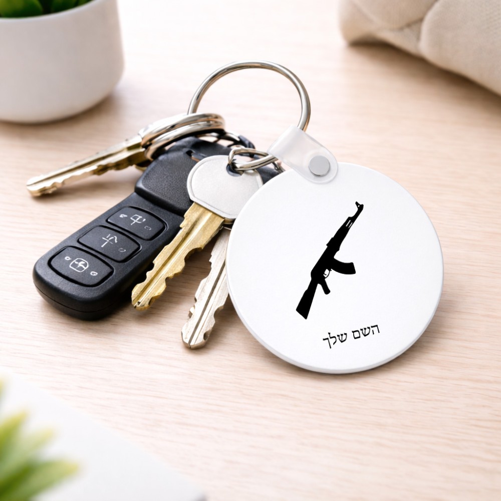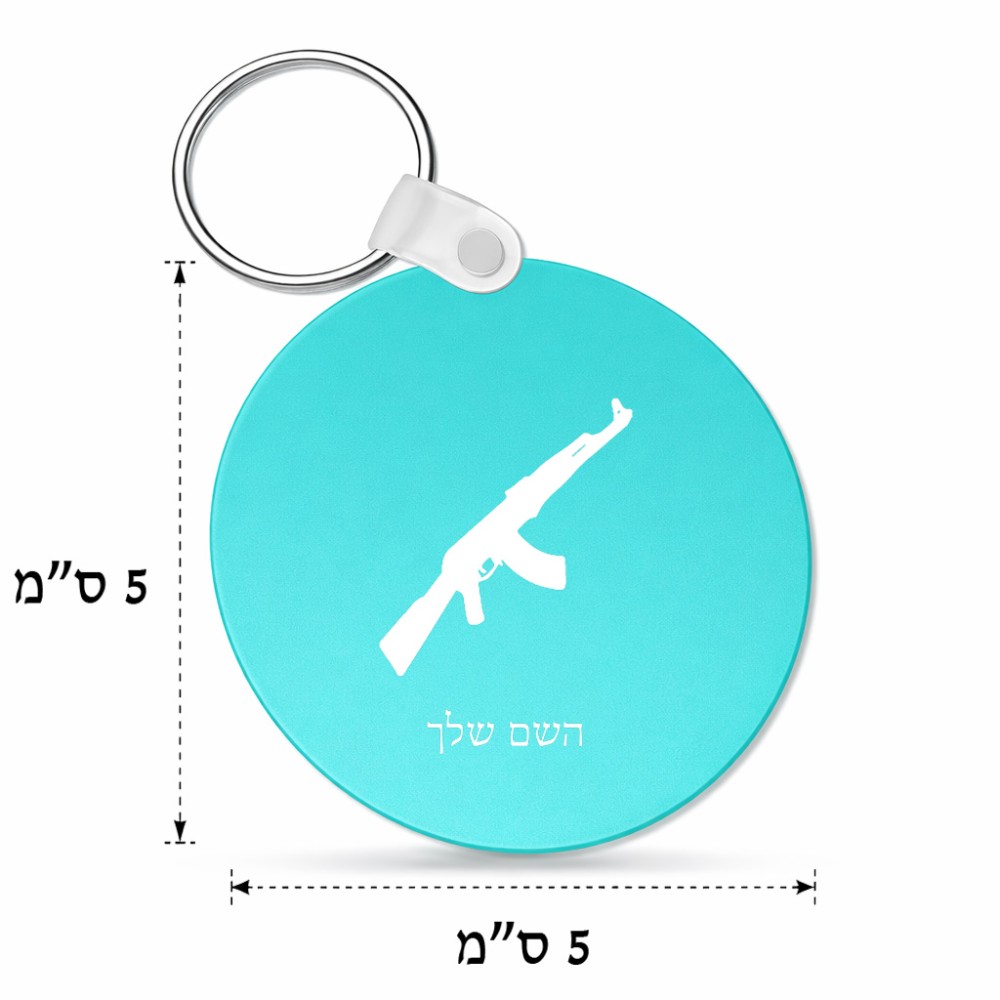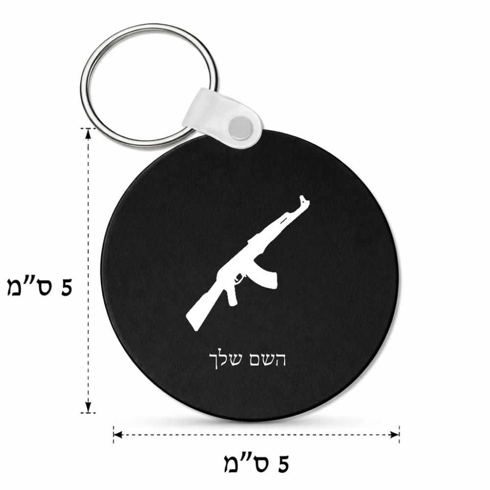 מחזיק מפתחות בצורת עיגול בעיצוב אישי עם השם שלך בעיצוב אק 47 גודל המחזיק 5 × 5 ס"מ. את השם המבוקש ניתן לציין בהזמנה, אם לא צויין אנחנו ניצור קשר לבירור.