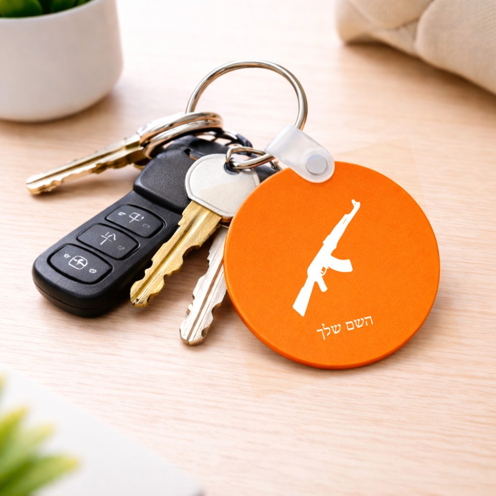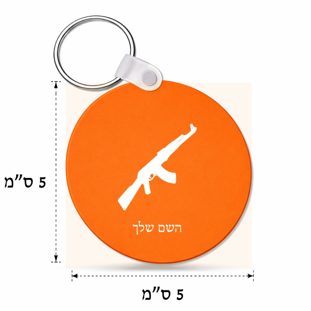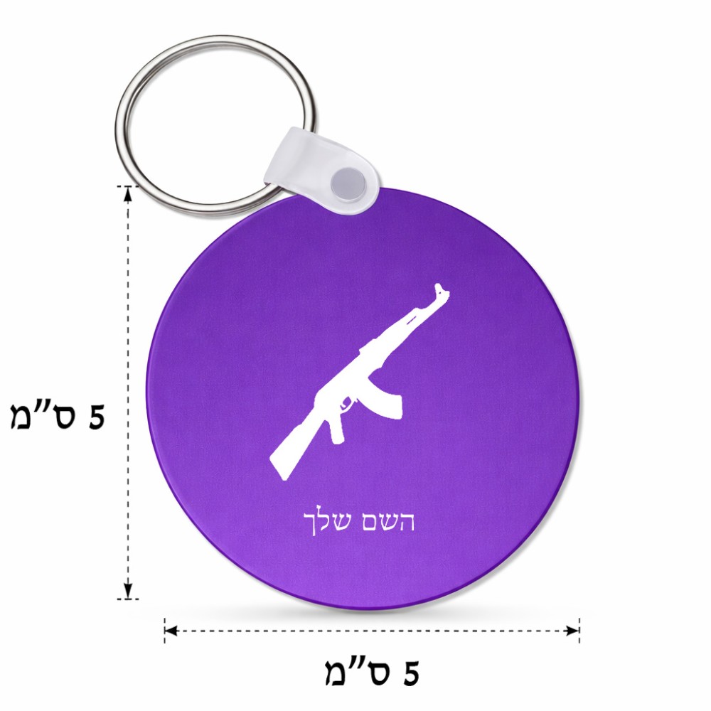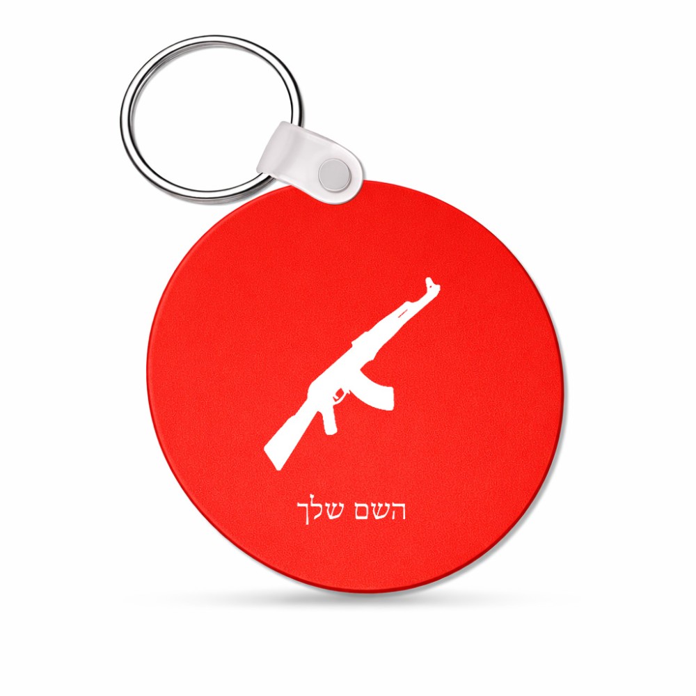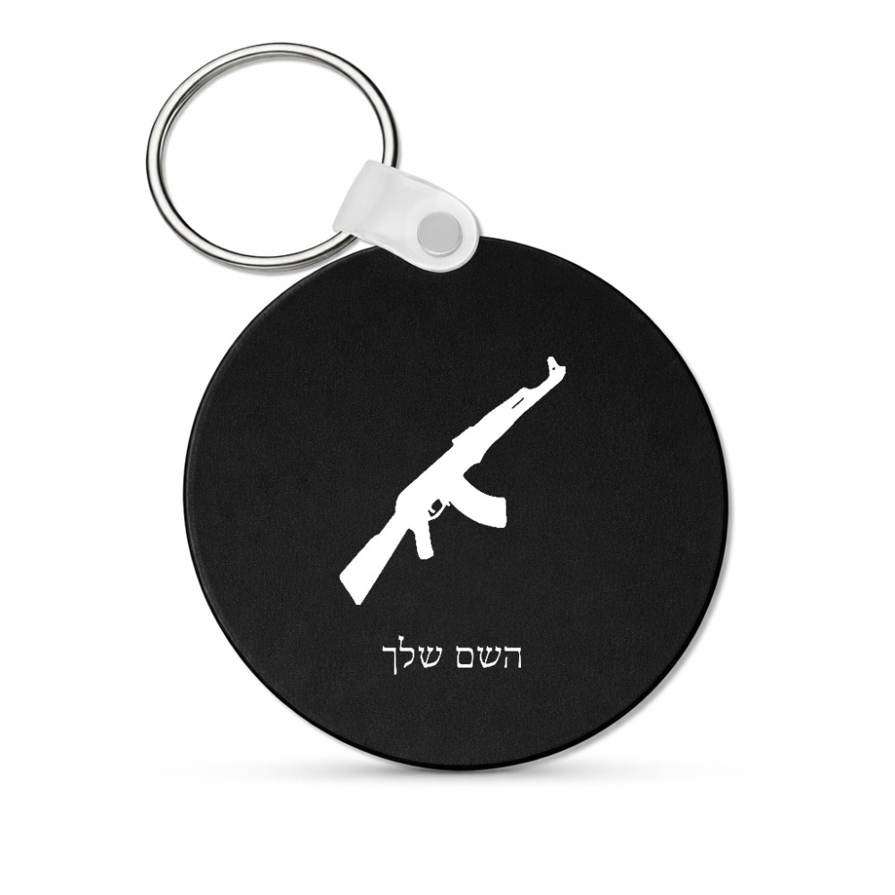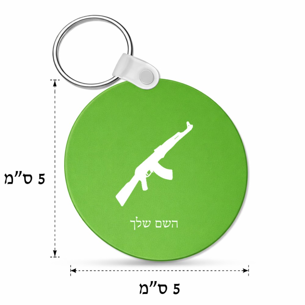 מחזיק מפתחות בצורת עיגול בעיצוב אישי עם השם שלך בעיצוב אק 47 גודל המחזיק 5 × 5 ס"מ. את השם המבוקש ניתן לציין בהזמנה, אם לא צויין אנחנו ניצור קשר לבירור.