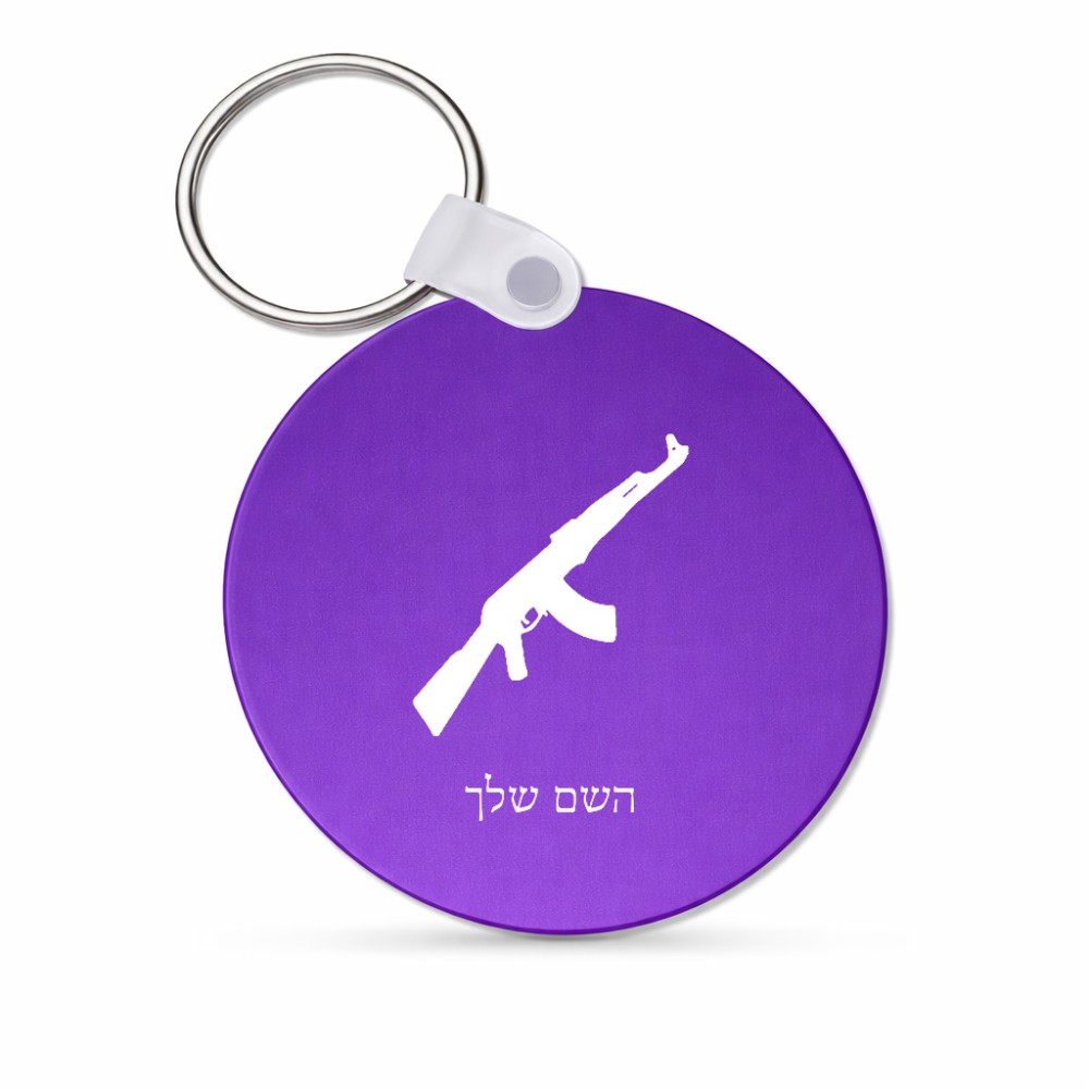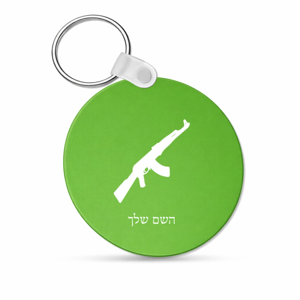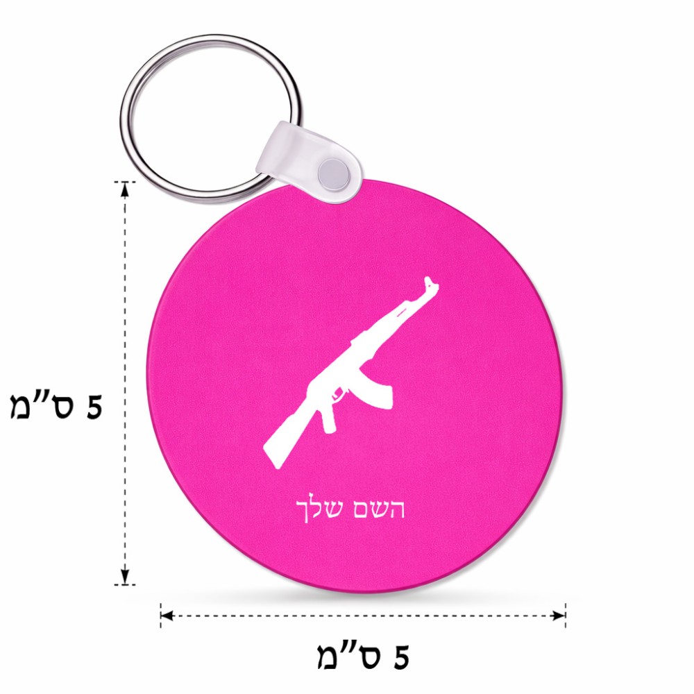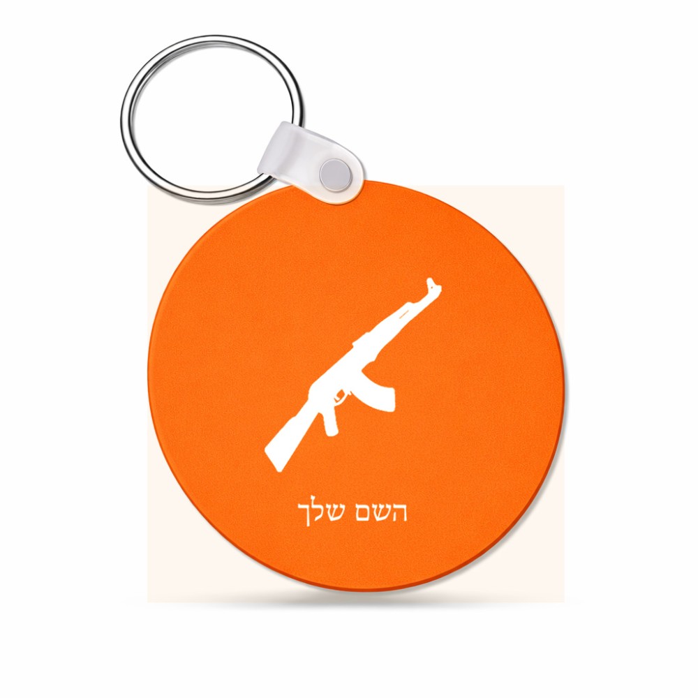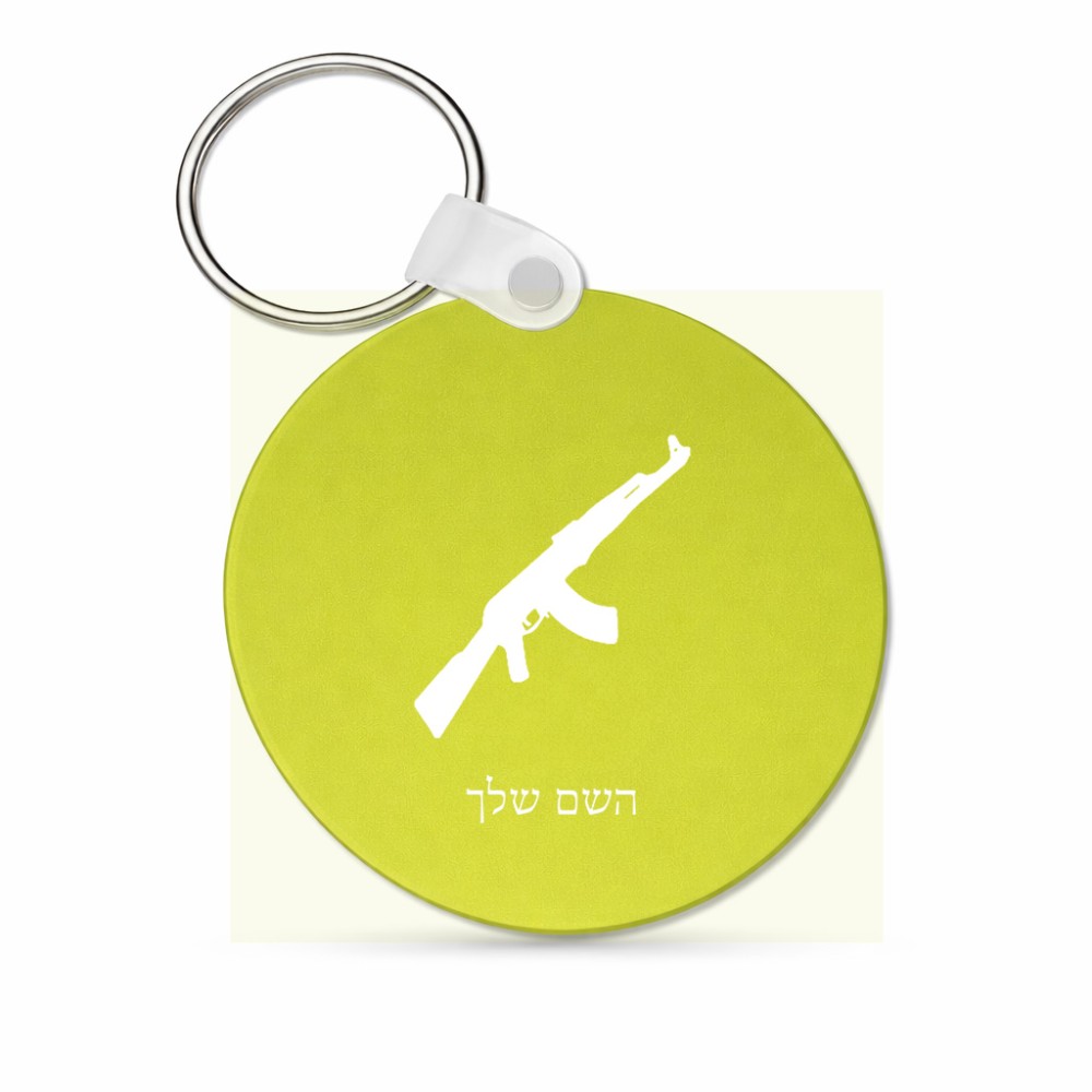 מחזיק מפתחות בצורת עיגול בעיצוב אישי עם השם שלך בעיצוב אק 47 גודל המחזיק 5 × 5 ס"מ. את השם המבוקש ניתן לציין בהזמנה, אם לא צויין אנחנו ניצור קשר לבירור.