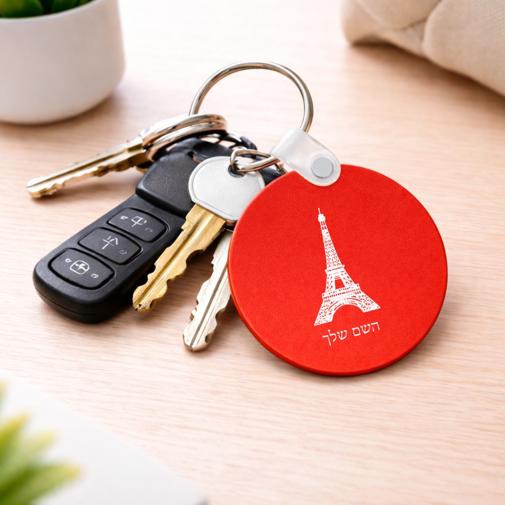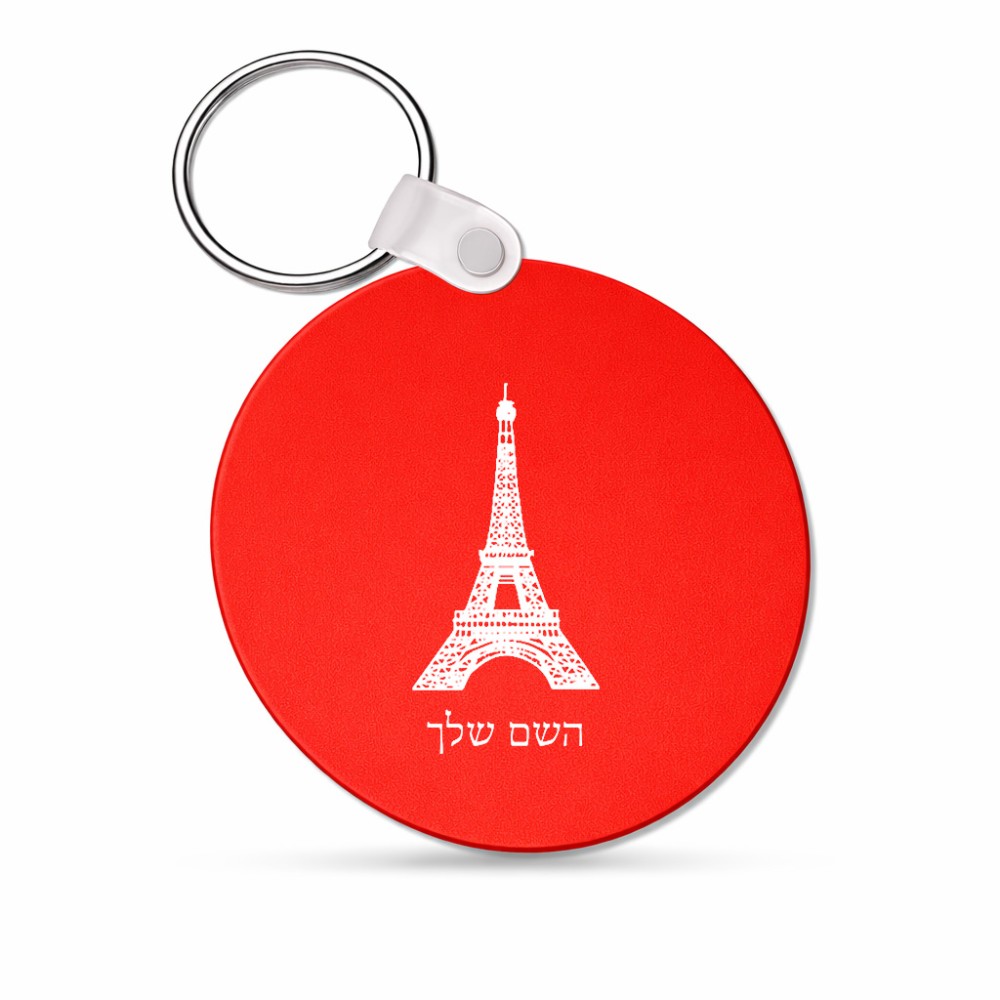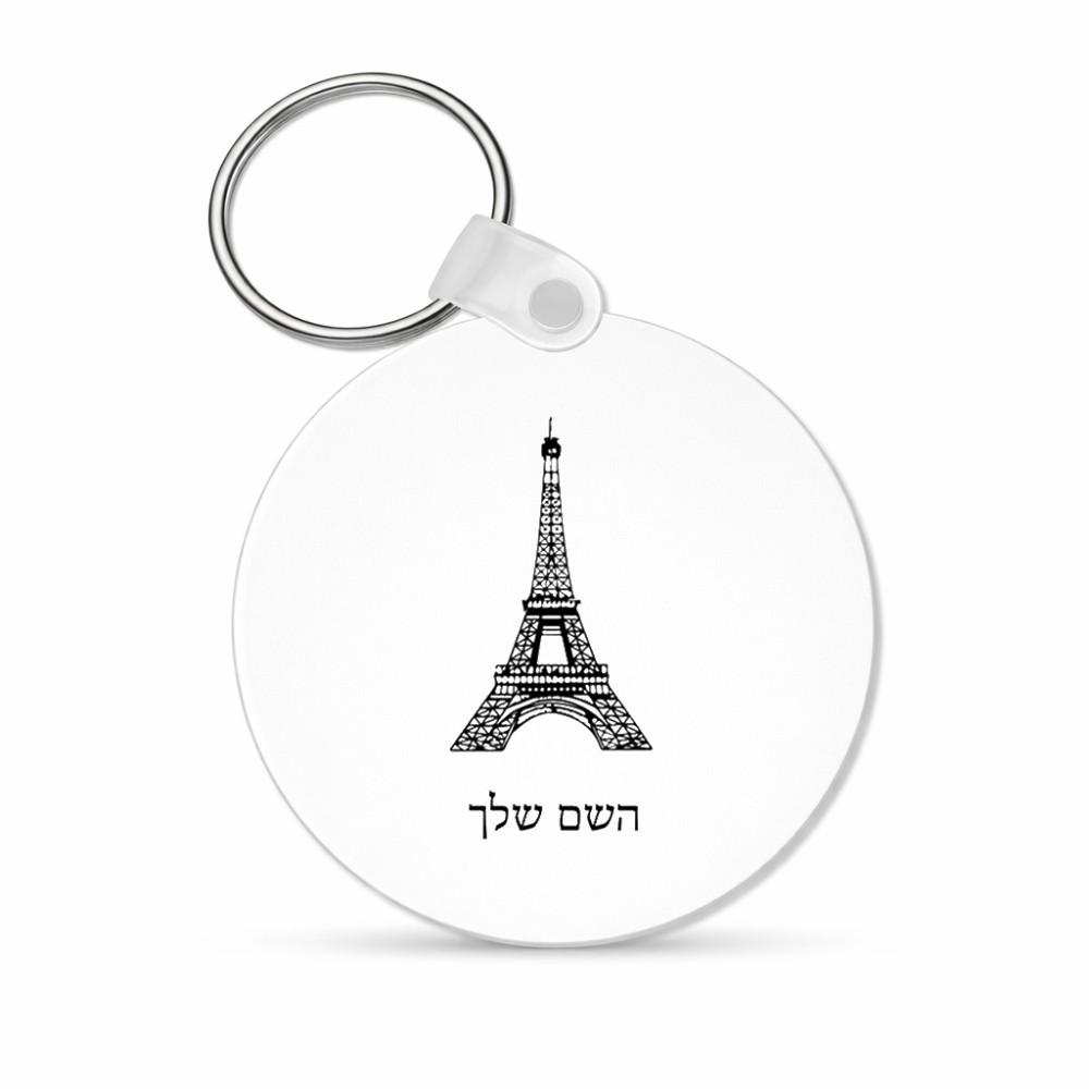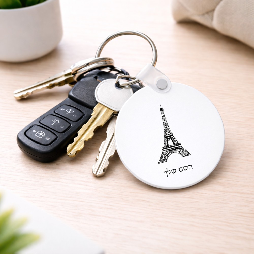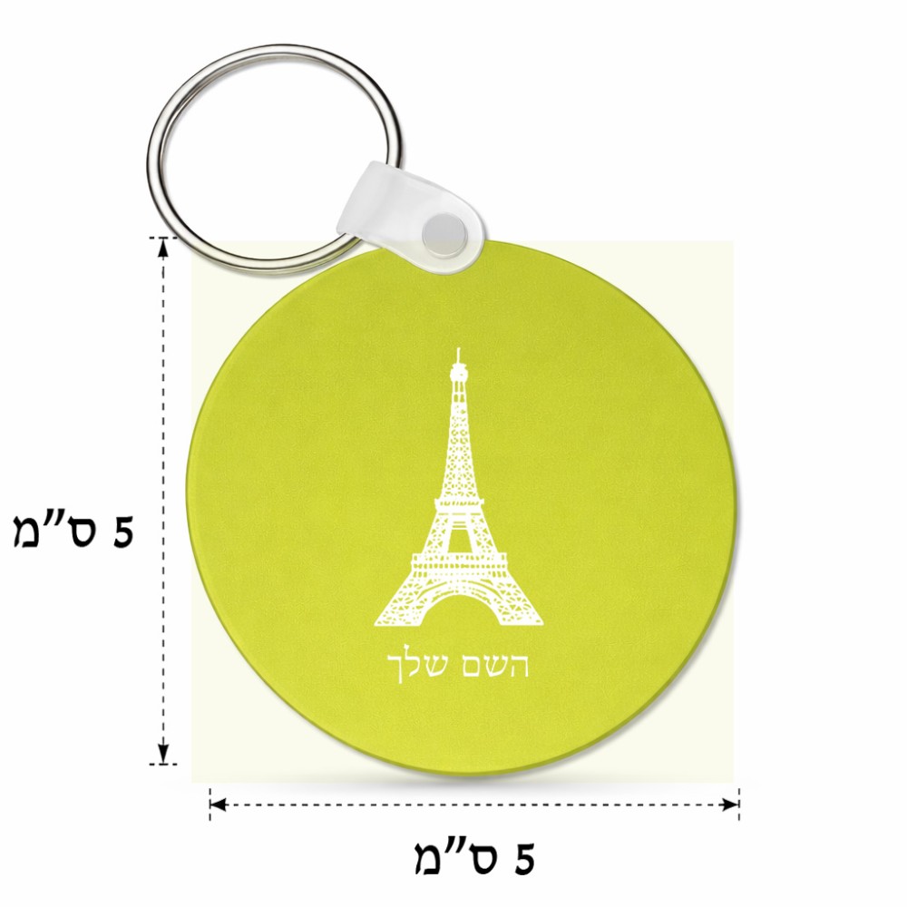 מחזיק מפתחות בצורת עיגול בעיצוב אישי עם השם שלך בעיצוב מגדל אייפל גודל המחזיק 5 × 5 ס"מ. את השם המבוקש ניתן לציין בהזמנה, אם לא צויין אנחנו ניצור קשר לבירור.