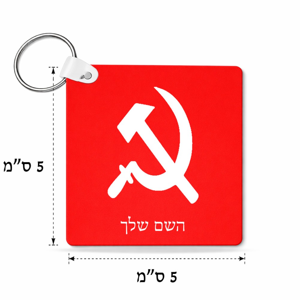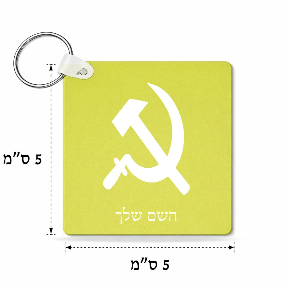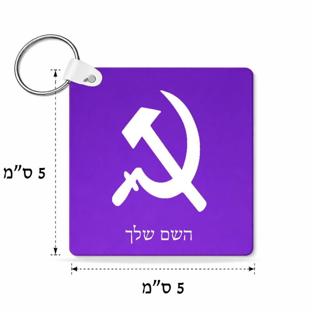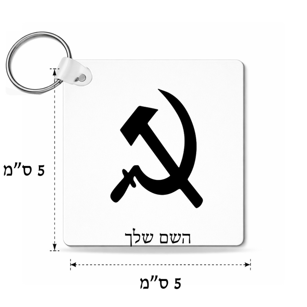 מחזיק מפתחות בצורת ריבוע בעיצוב אישי עם השם שלך בעיצוב פטיש ומגל גודל המחזיק 5 × 5 ס"מ. את השם המבוקש ניתן לציין בהזמנה, אם לא צויין אנחנו ניצור קשר לבירור.