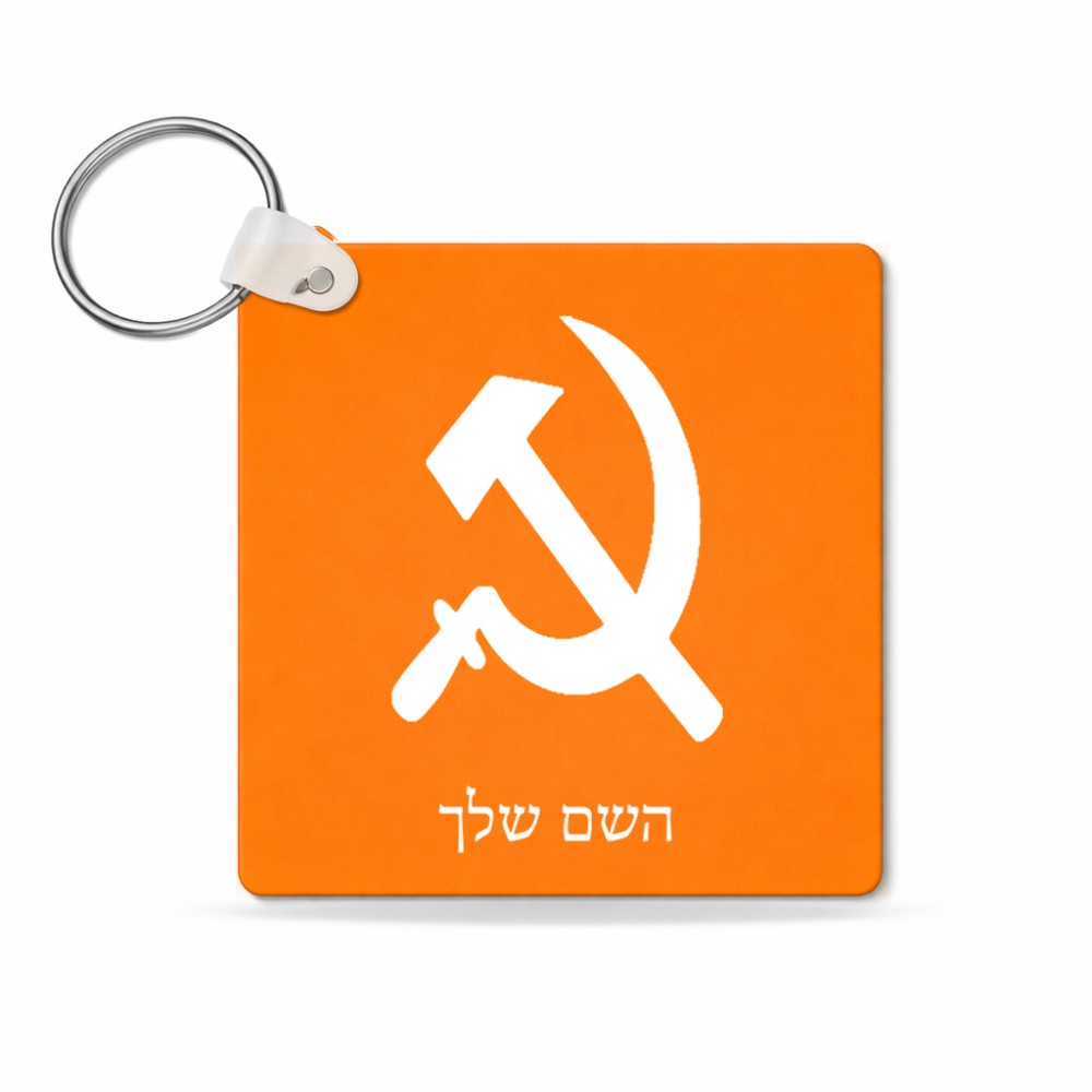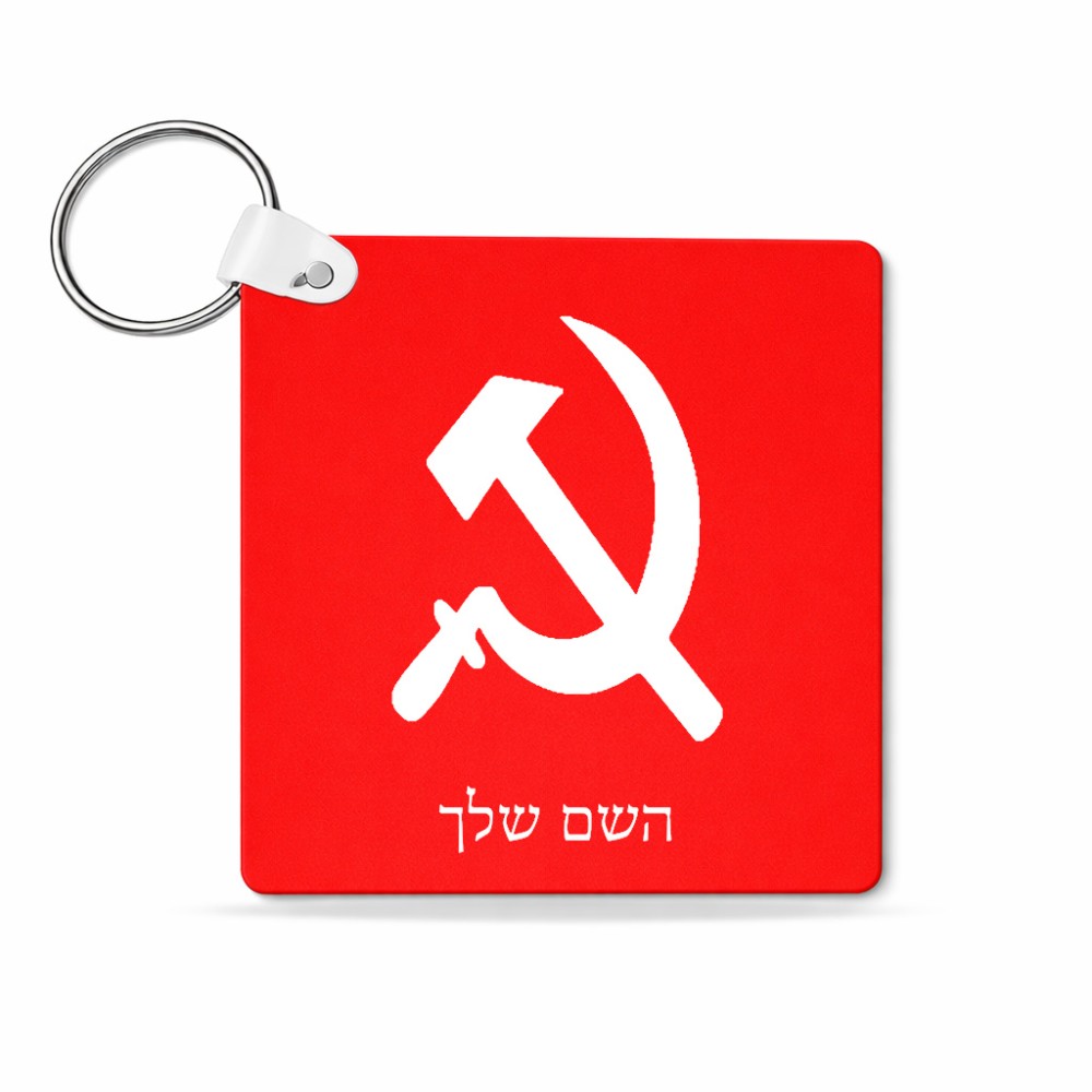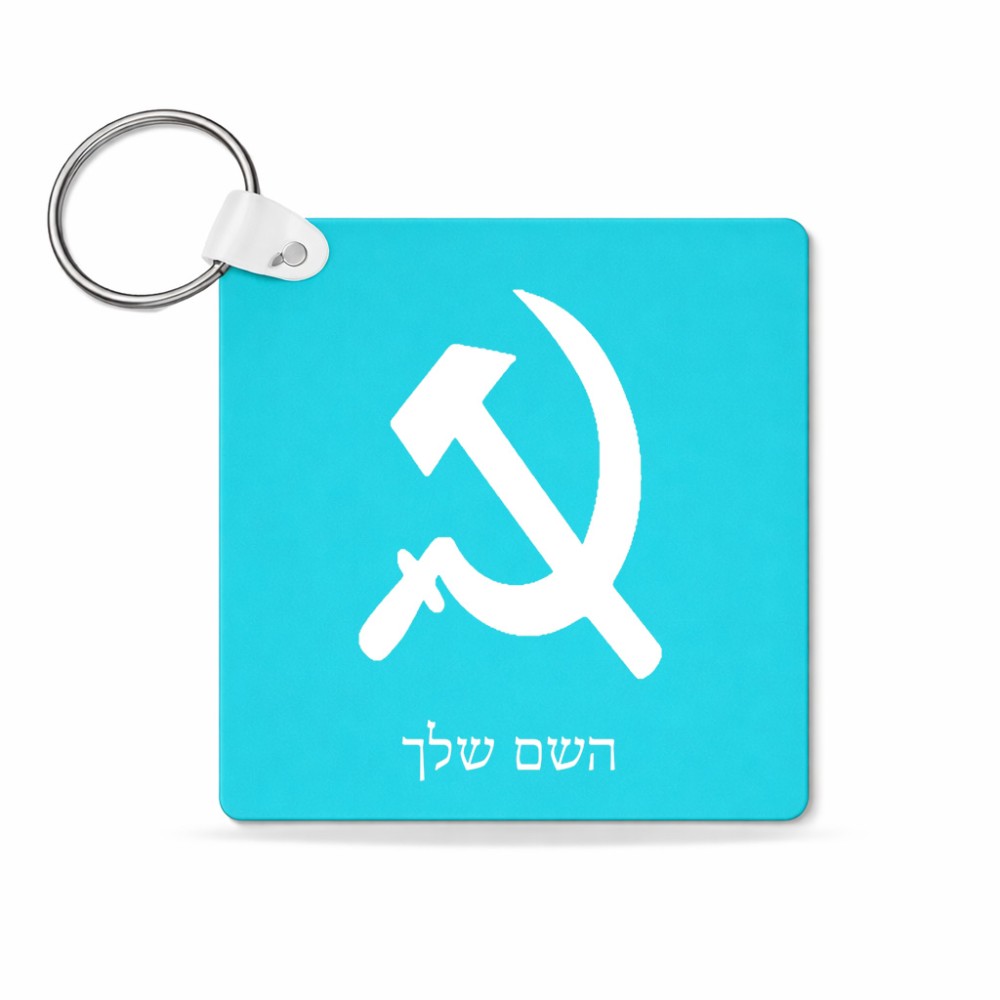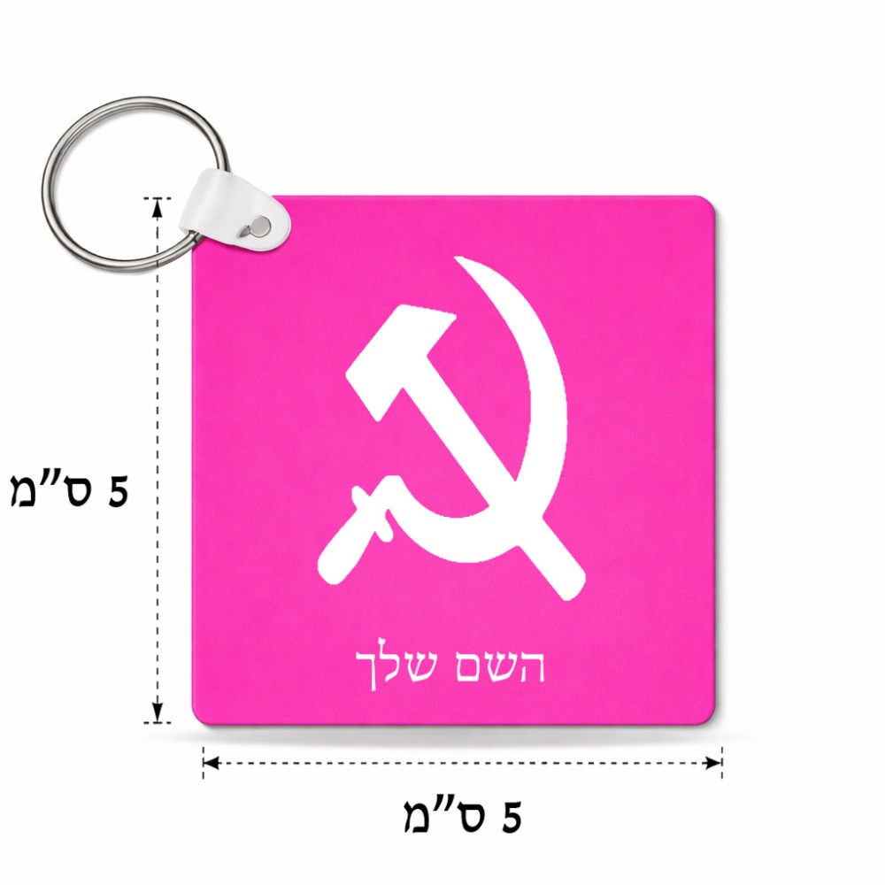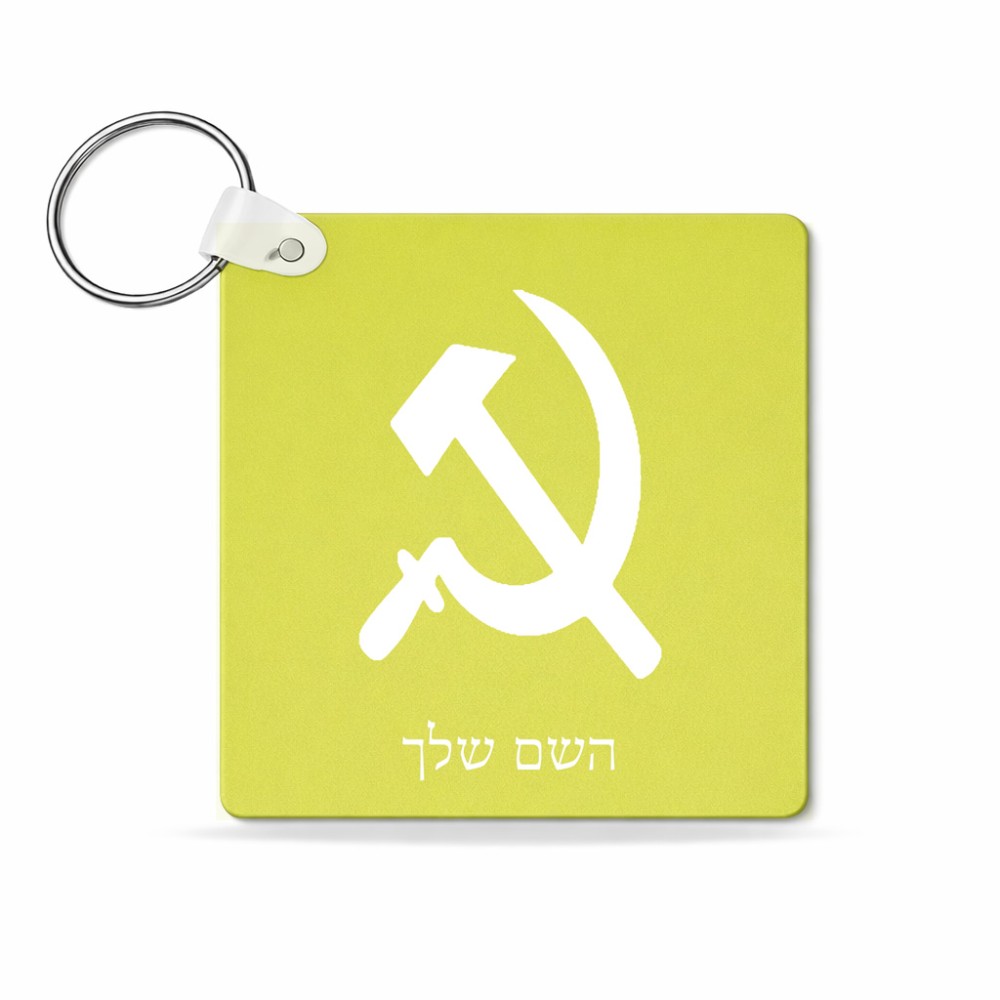 מחזיק מפתחות בצורת ריבוע בעיצוב אישי עם השם שלך בעיצוב פטיש ומגל גודל המחזיק 5 × 5 ס"מ. את השם המבוקש ניתן לציין בהזמנה, אם לא צויין אנחנו ניצור קשר לבירור.