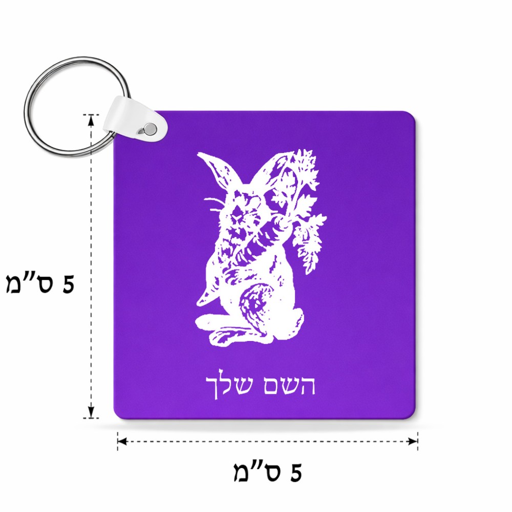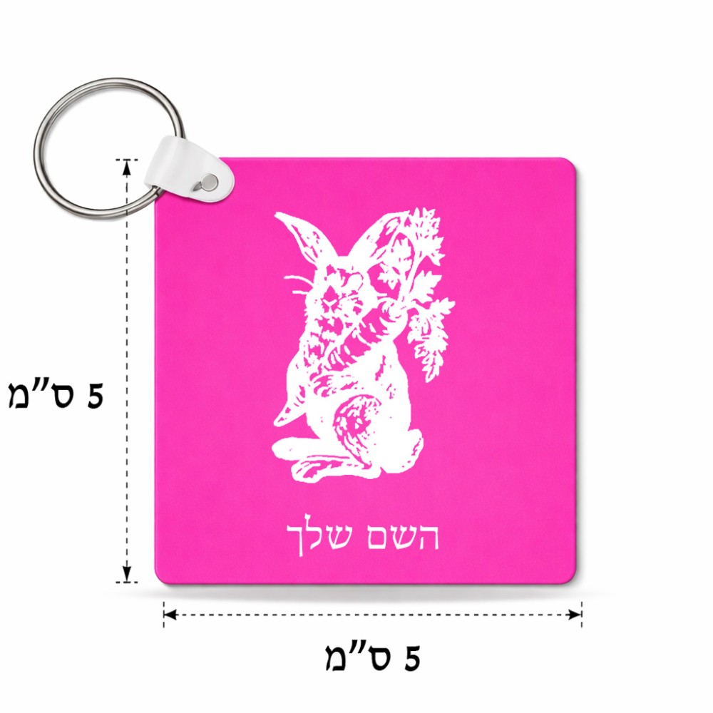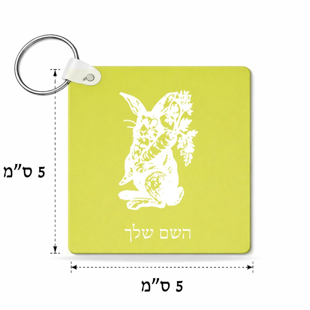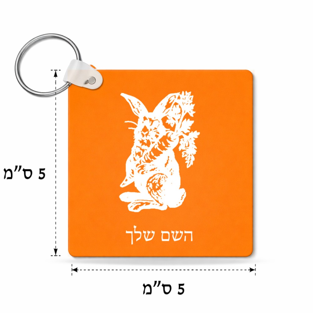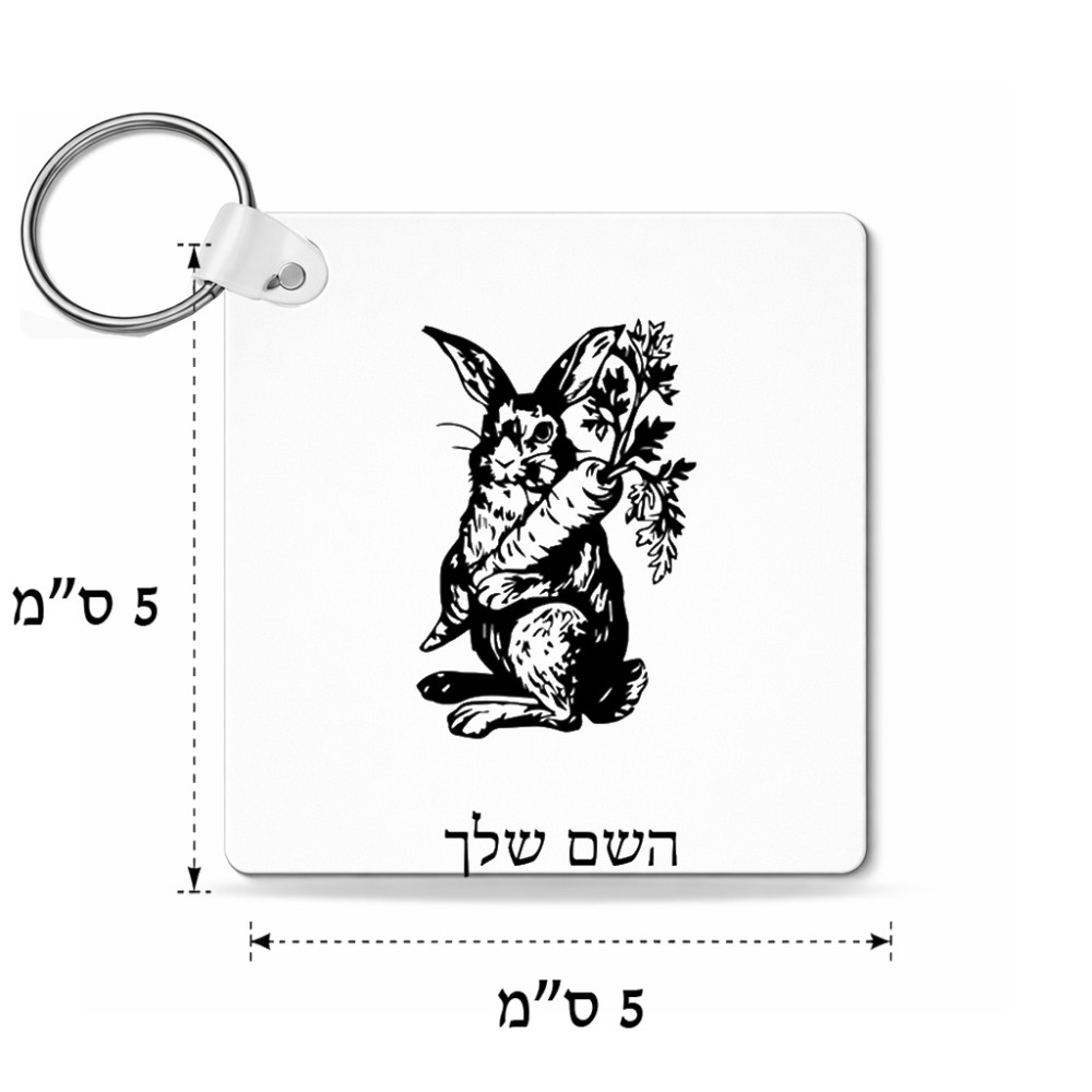 מחזיק מפתחות בצורת ריבוע בעיצוב אישי עם השם שלך בעיצוב ארנב מחזיק גזר גודל המחזיק 5 × 5 ס"מ. את השם המבוקש ניתן לציין בהזמנה, אם לא צויין אנחנו ניצור קשר לבירור.