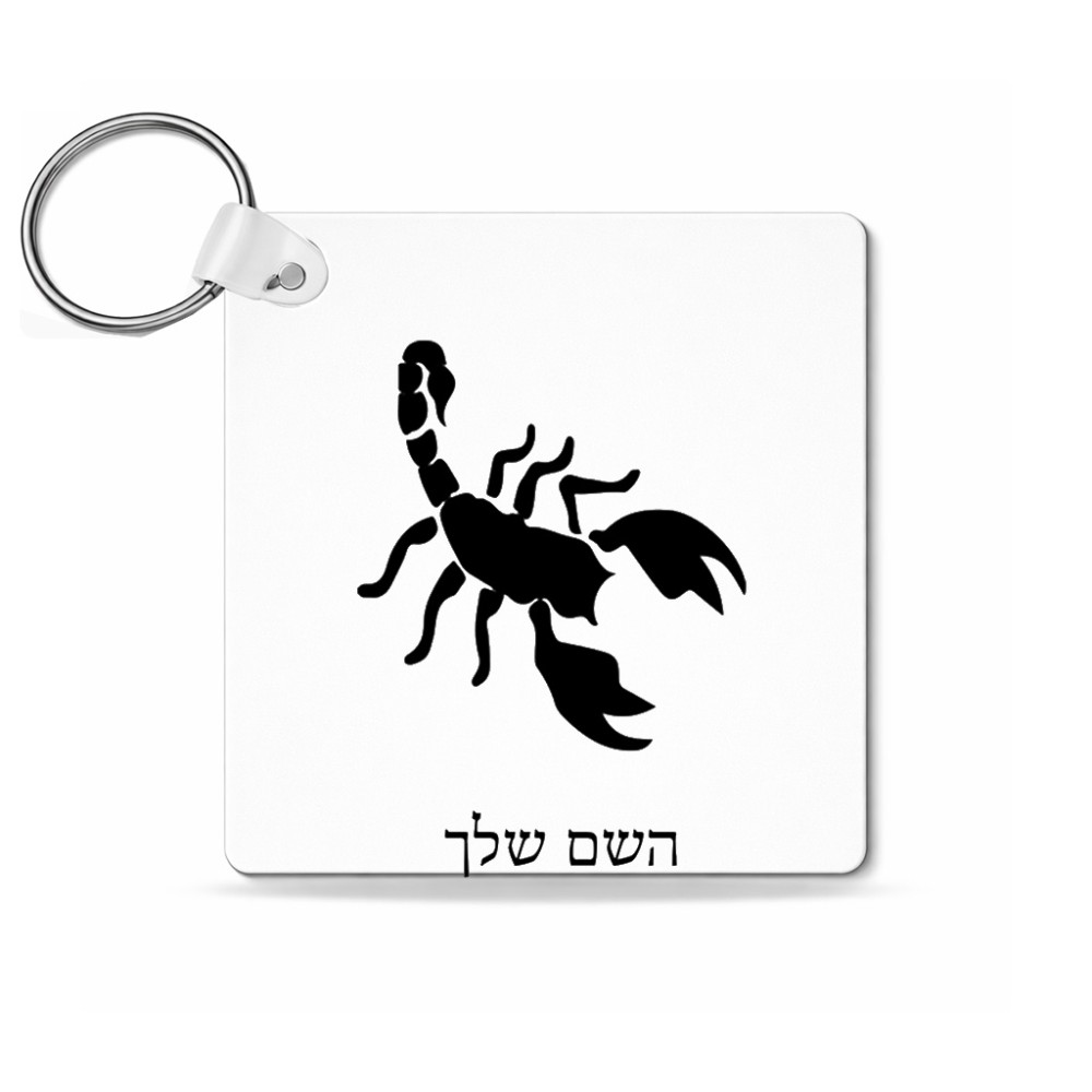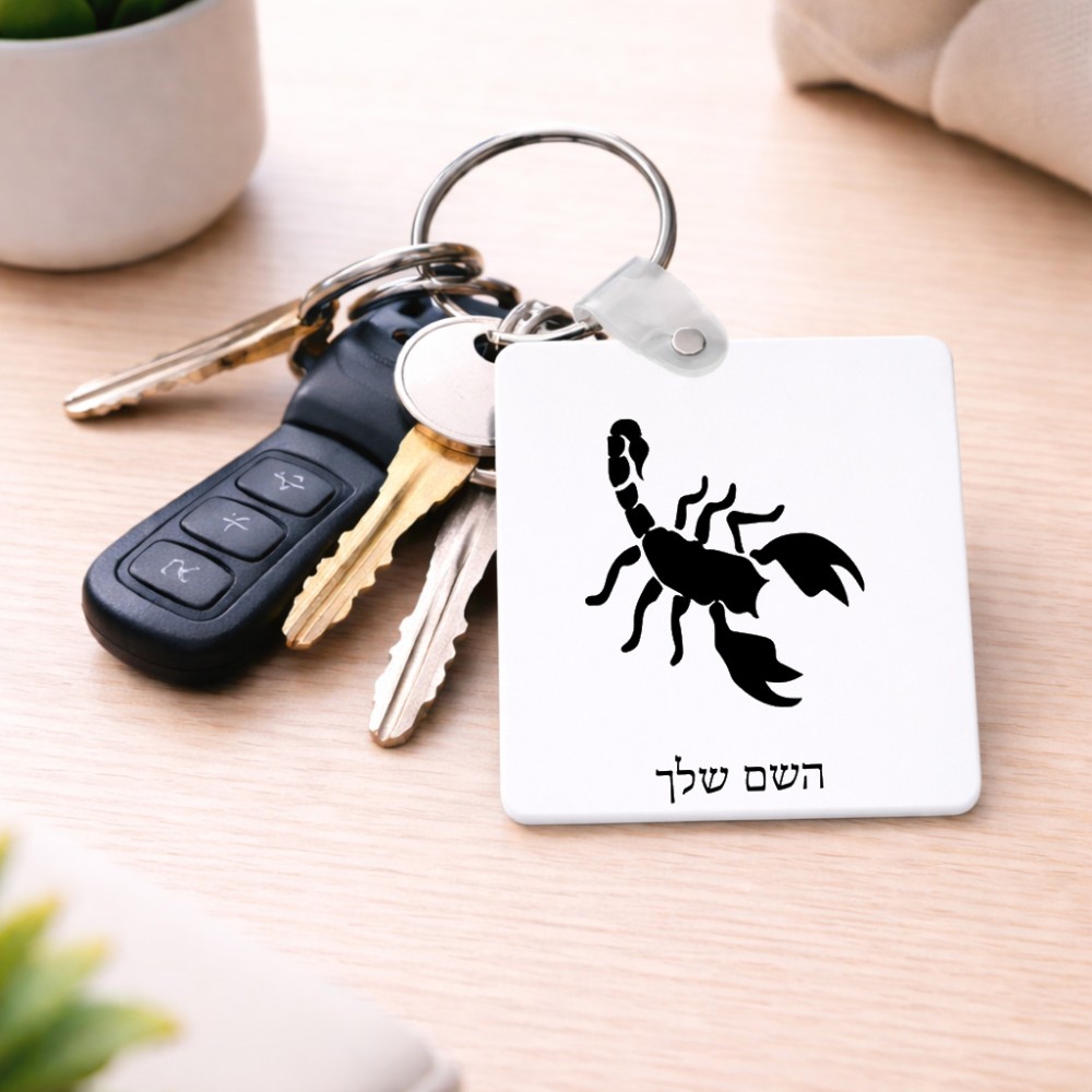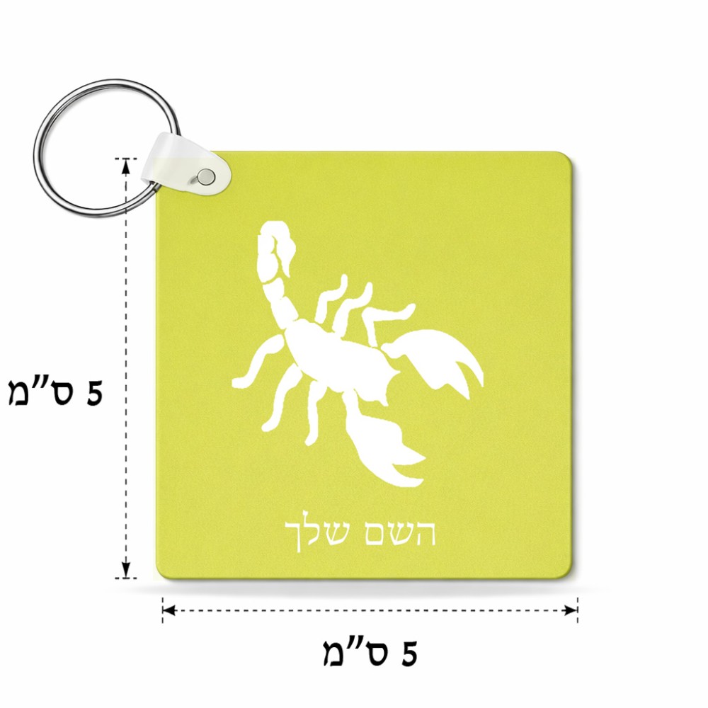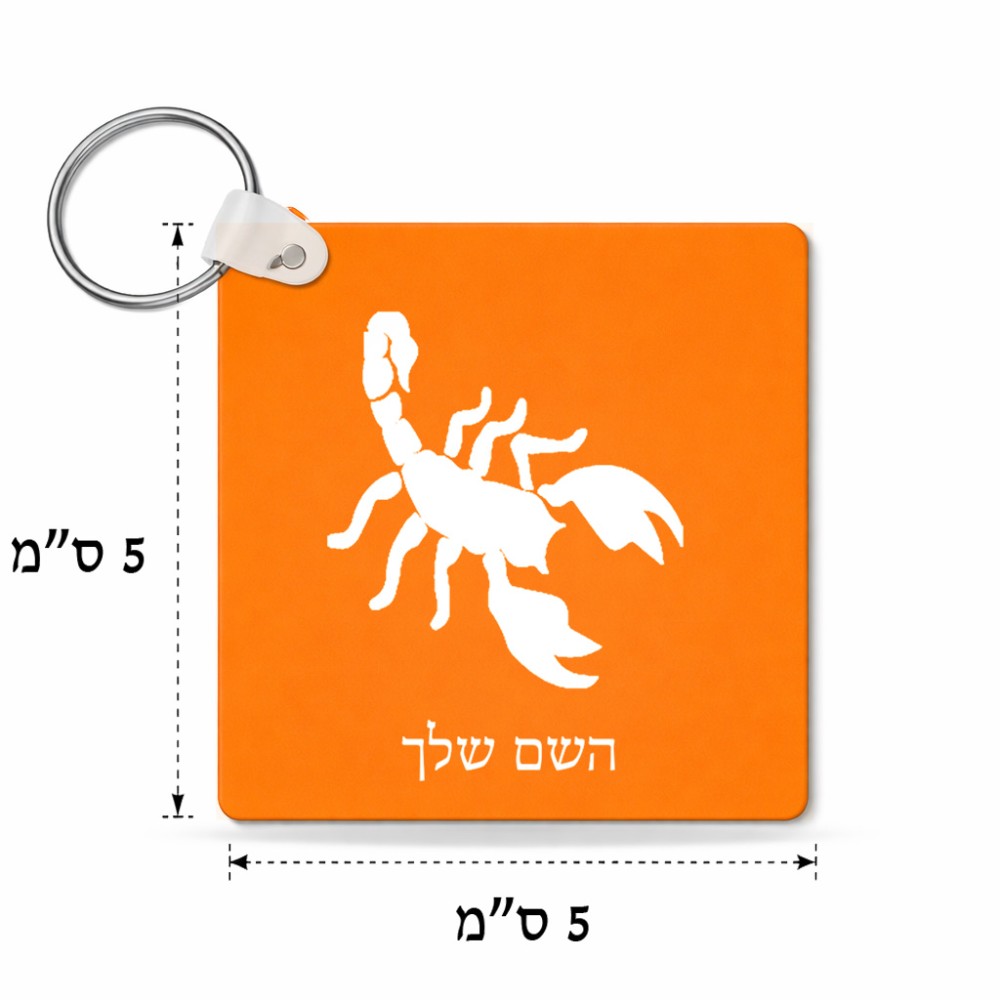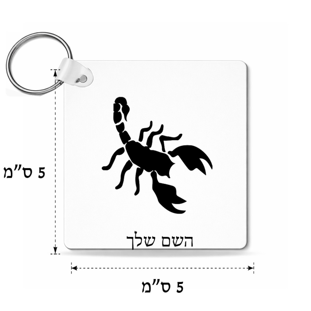 מחזיק מפתחות בצורת ריבוע בעיצוב אישי עם השם שלך בעיצוב עקרב גודל המחזיק 5 × 5 ס"מ. את השם המבוקש ניתן לציין בהזמנה, אם לא צויין אנחנו ניצור קשר לבירור.