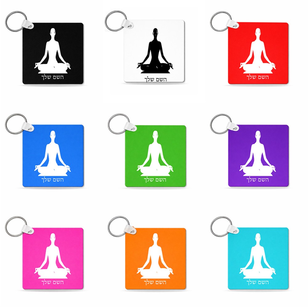מחזיק מפתחות בצורת ריבוע בעיצוב אישי עם השם שלך בעיצוב אימון יוגה גודל המחזיק 5 × 5 ס"מ