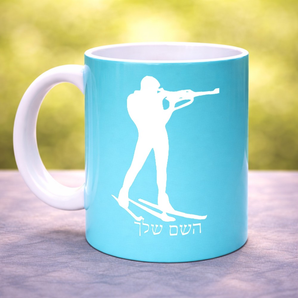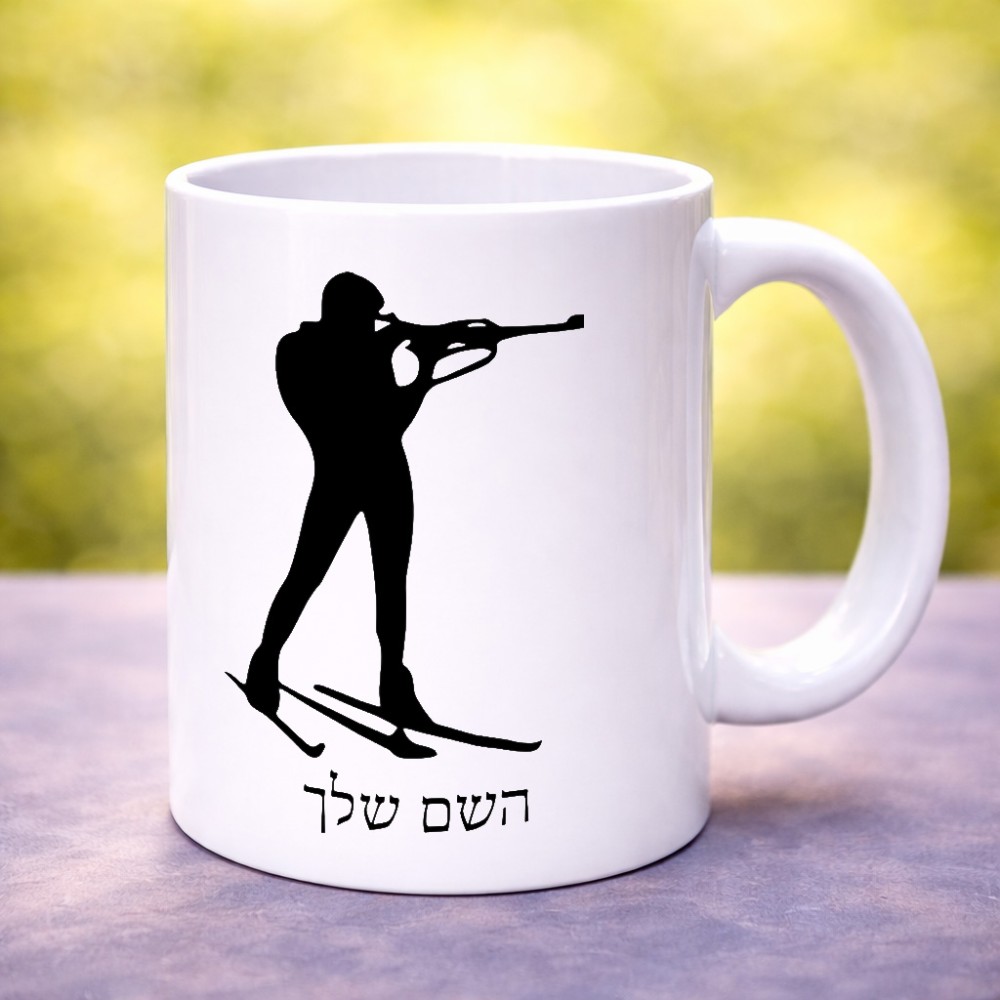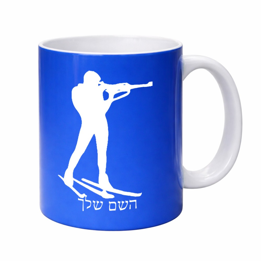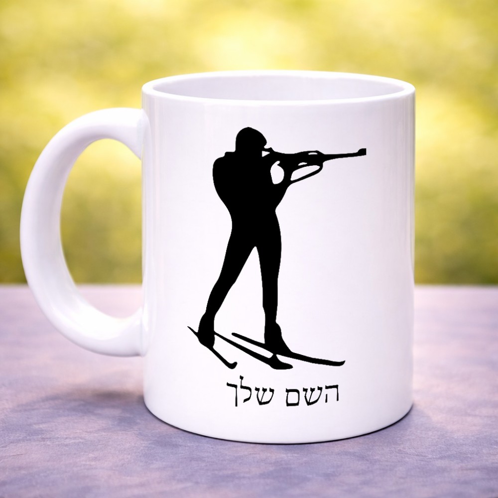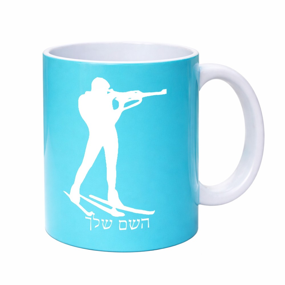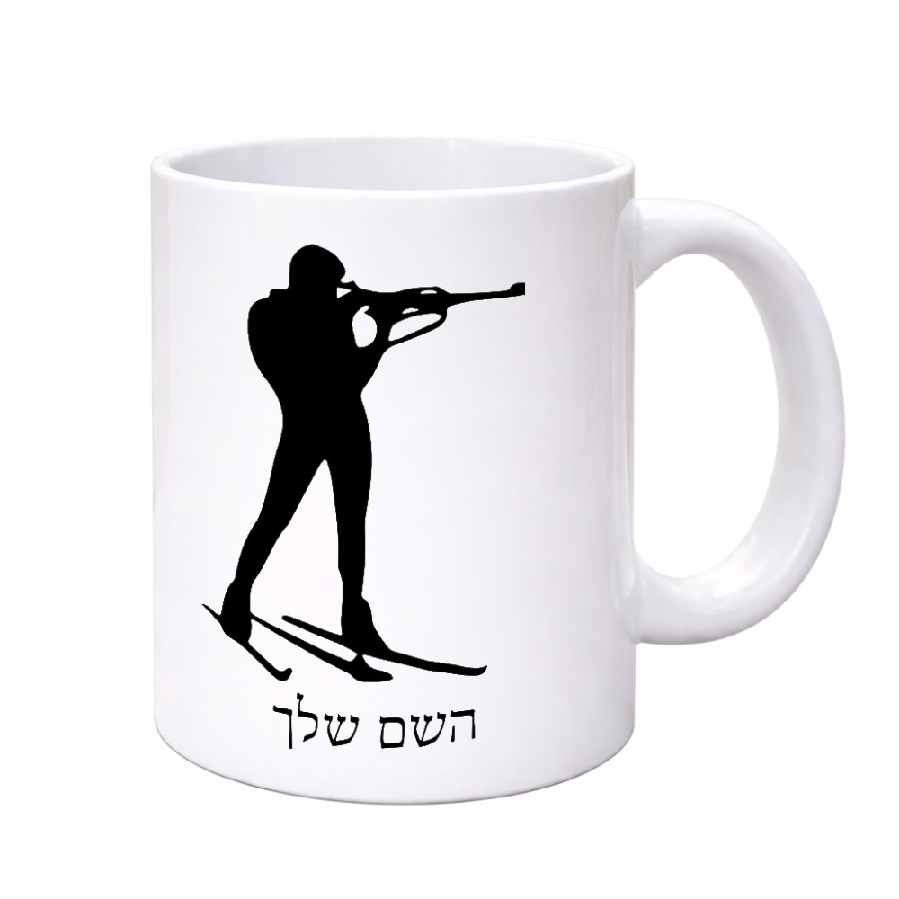 ספל תה \ קפה בעיצוב אישי עם השם שלך בעיצוב ביאתלון גדול הספל 325 מ"ל, הספל בעלת ידית לאחיזה יציבה. את השם המבוקש ניתן לציין בהזמנה, אם לא צויין אנחנו ניצור קשר לבירור.