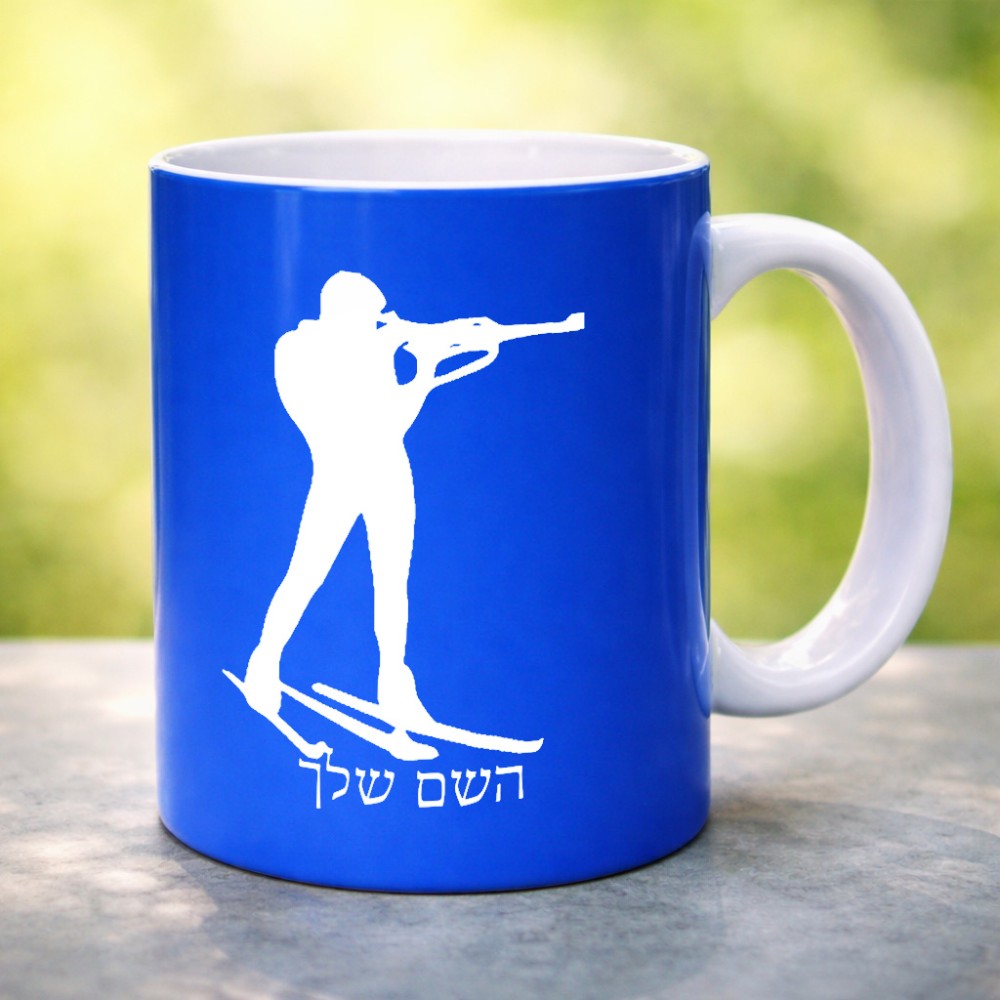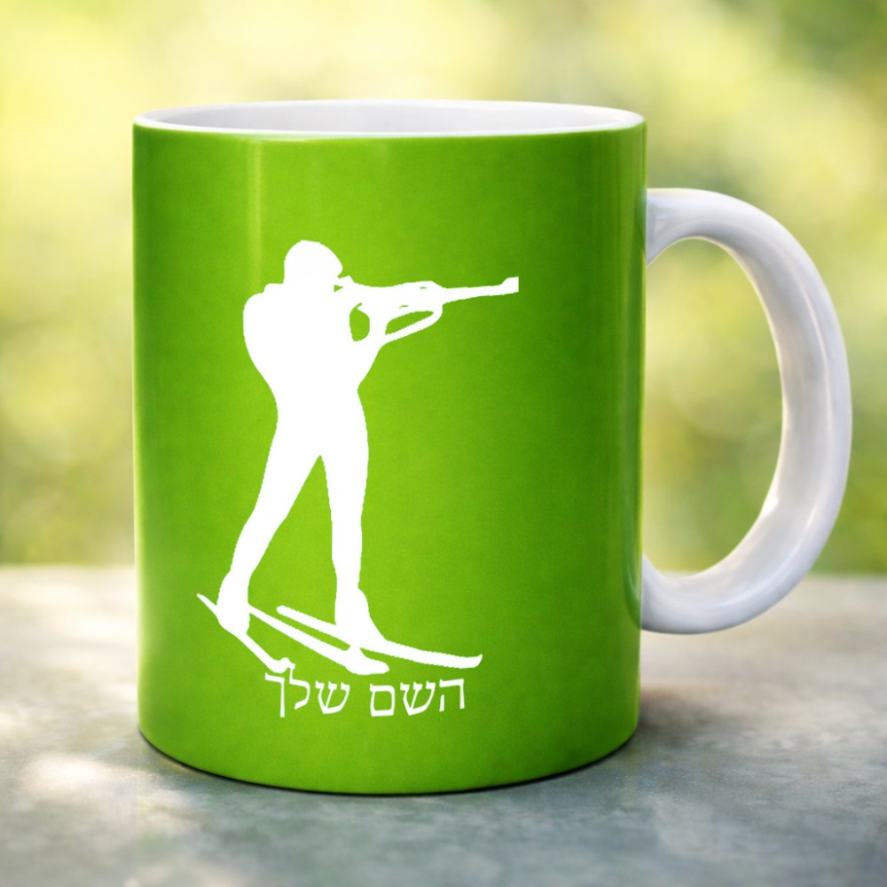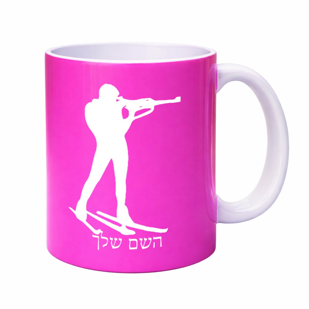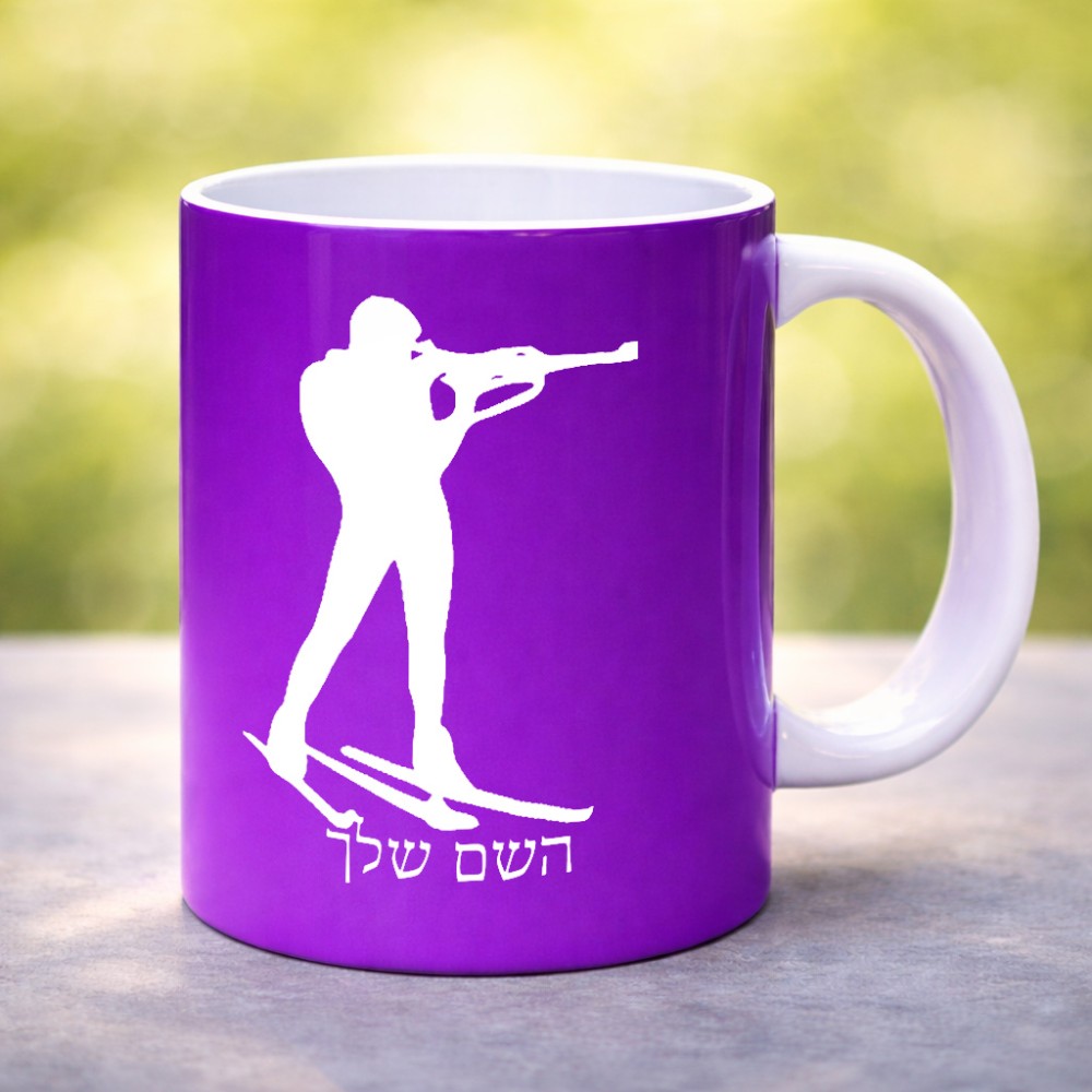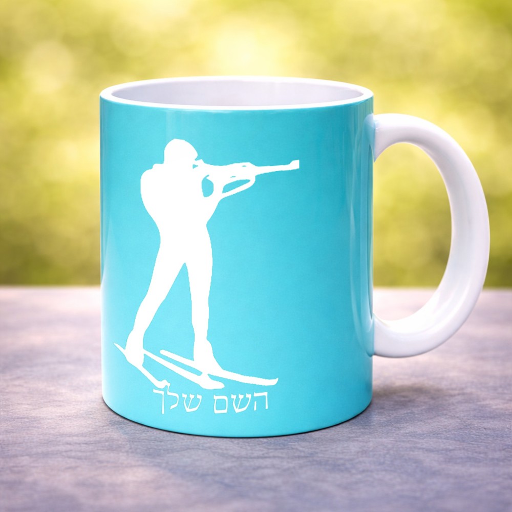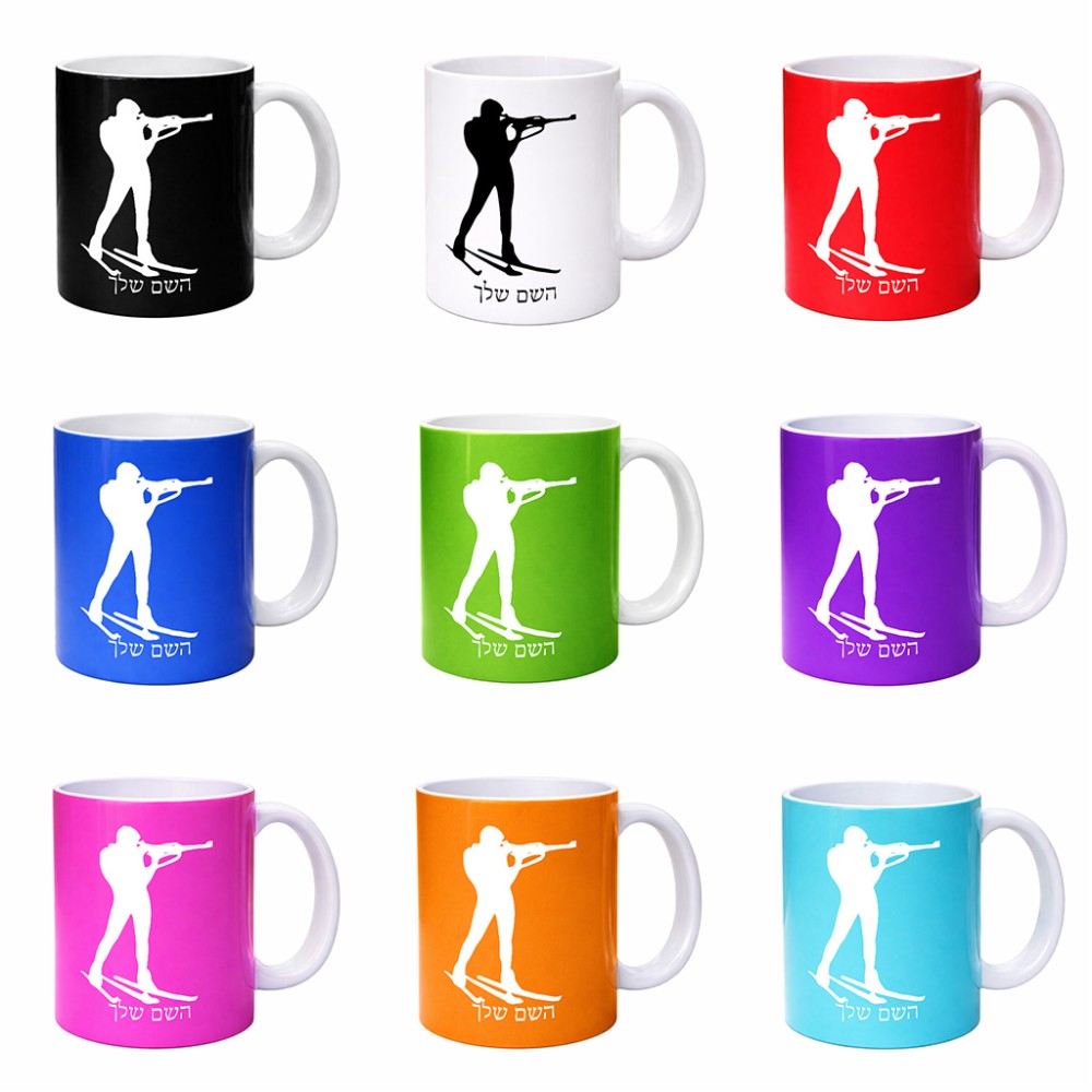 ספל תה \ קפה בעיצוב אישי עם השם שלך בעיצוב ביאתלון גדול הספל 325 מ"ל, הספל בעלת ידית לאחיזה יציבה. את השם המבוקש ניתן לציין בהזמנה, אם לא צויין אנחנו ניצור קשר לבירור.