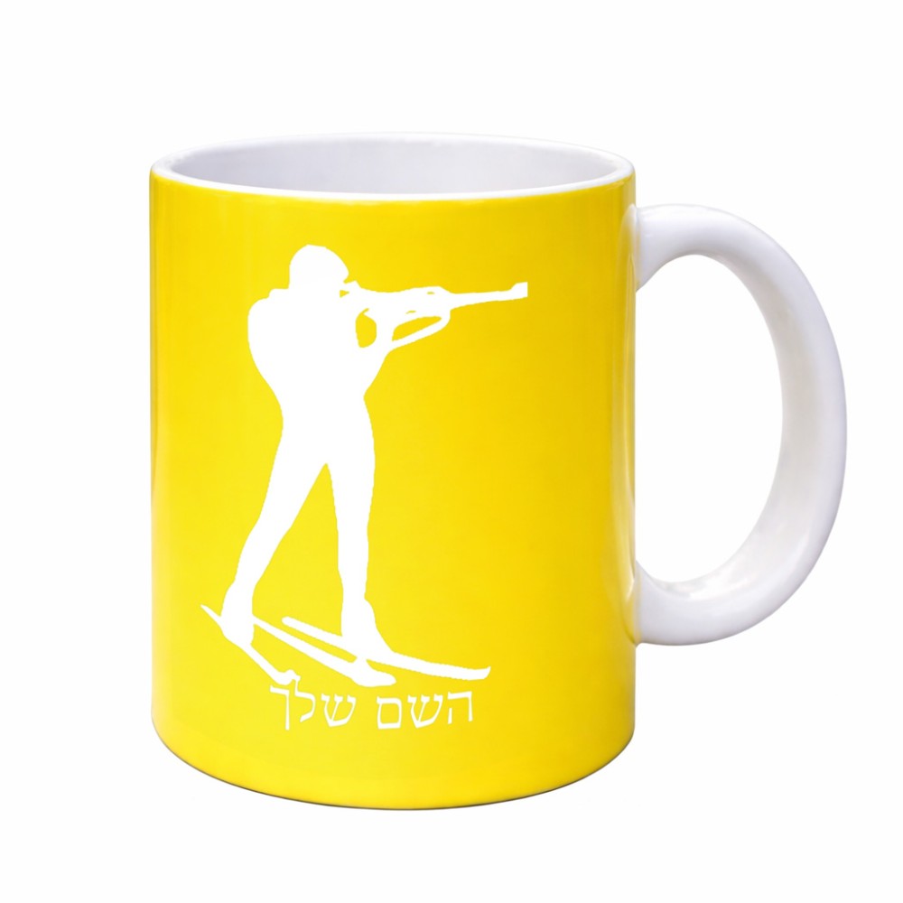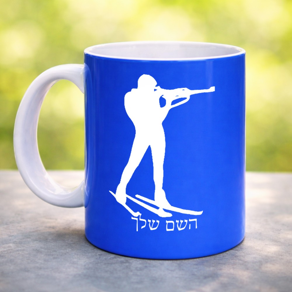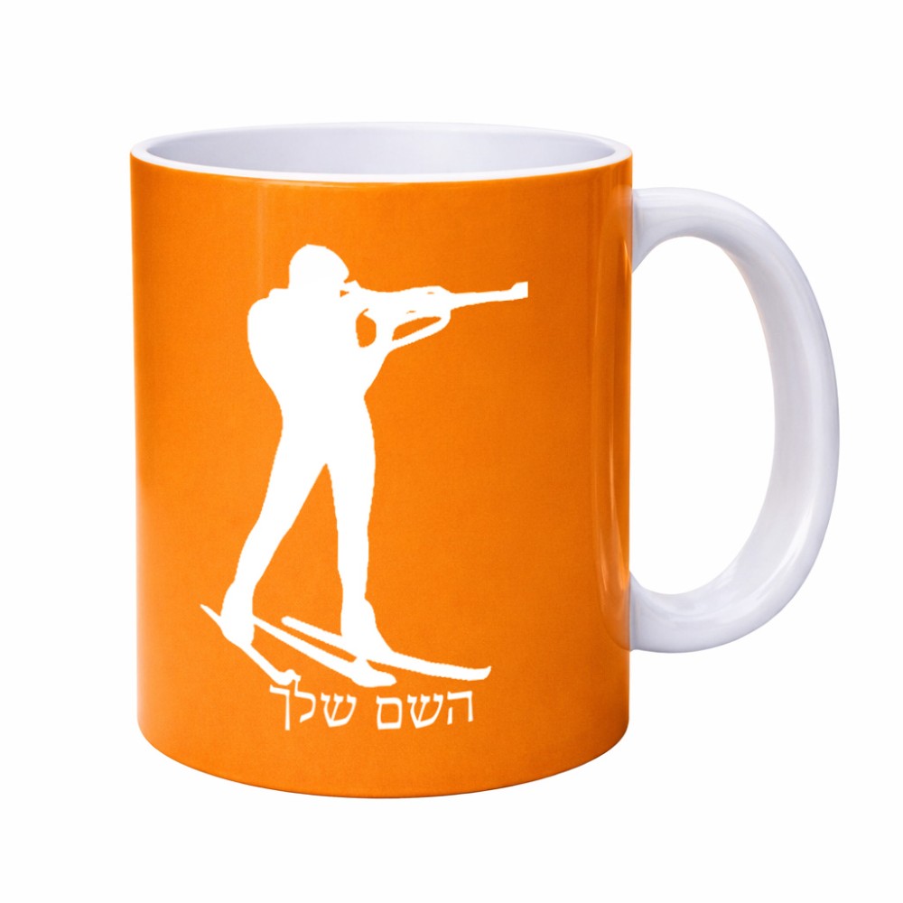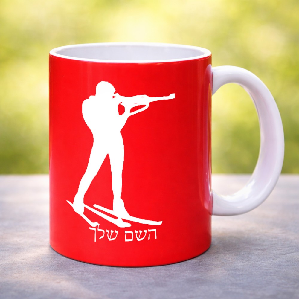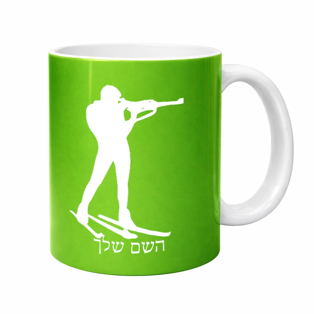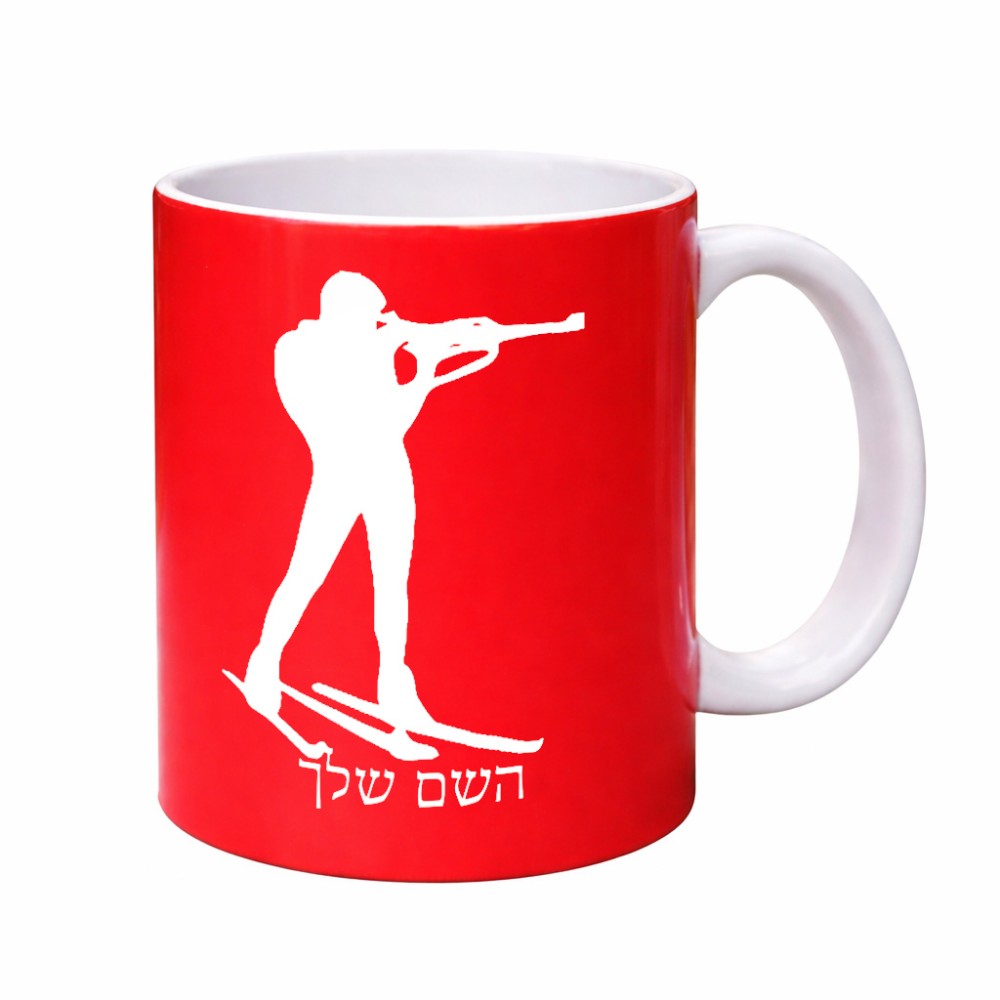 ספל תה \ קפה בעיצוב אישי עם השם שלך בעיצוב ביאתלון גדול הספל 325 מ"ל, הספל בעלת ידית לאחיזה יציבה. את השם המבוקש ניתן לציין בהזמנה, אם לא צויין אנחנו ניצור קשר לבירור.
