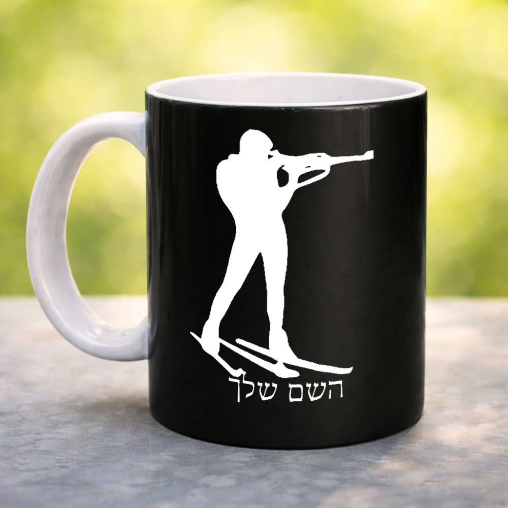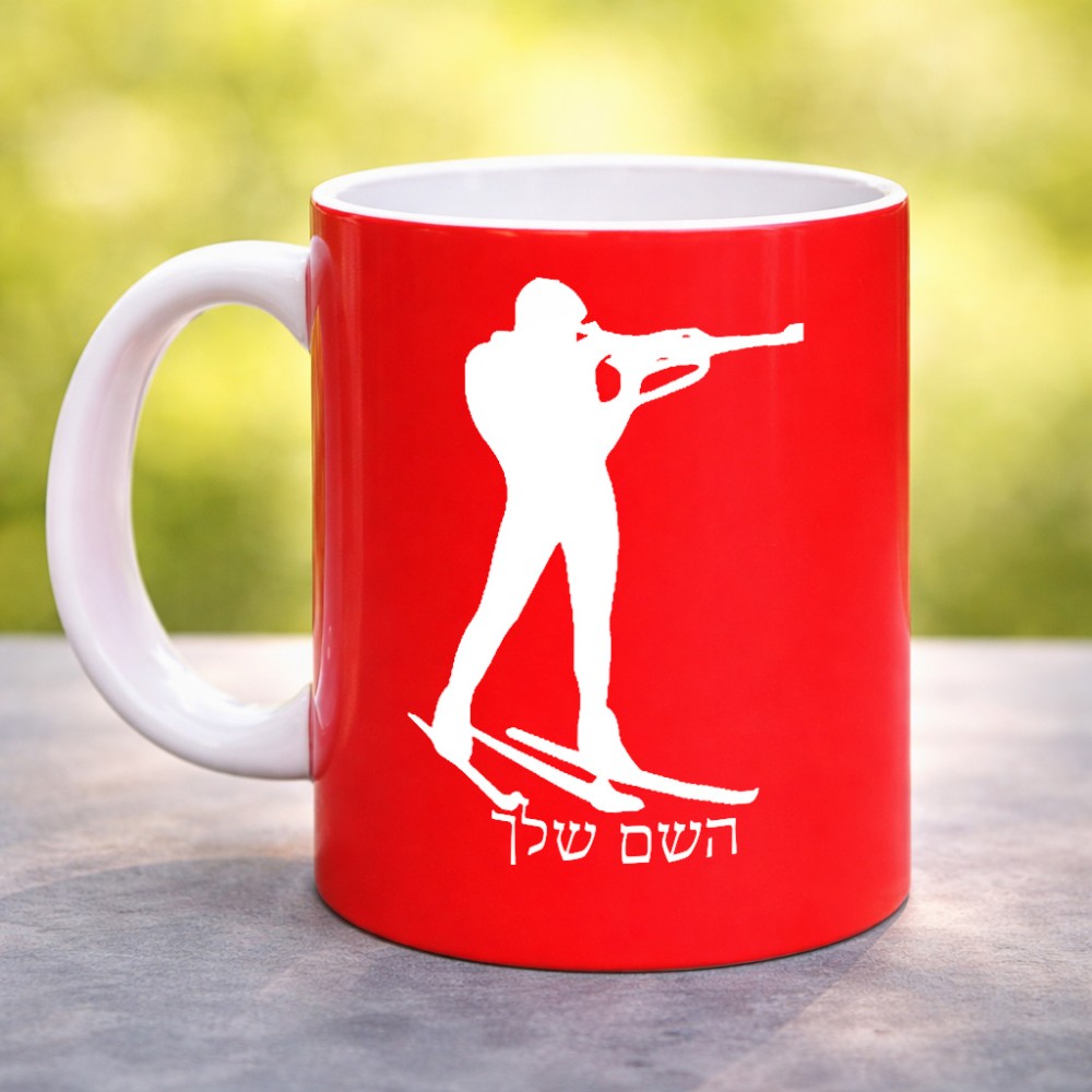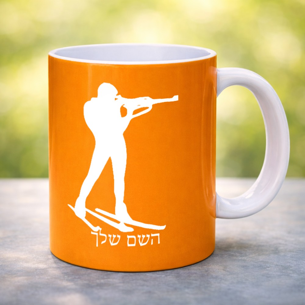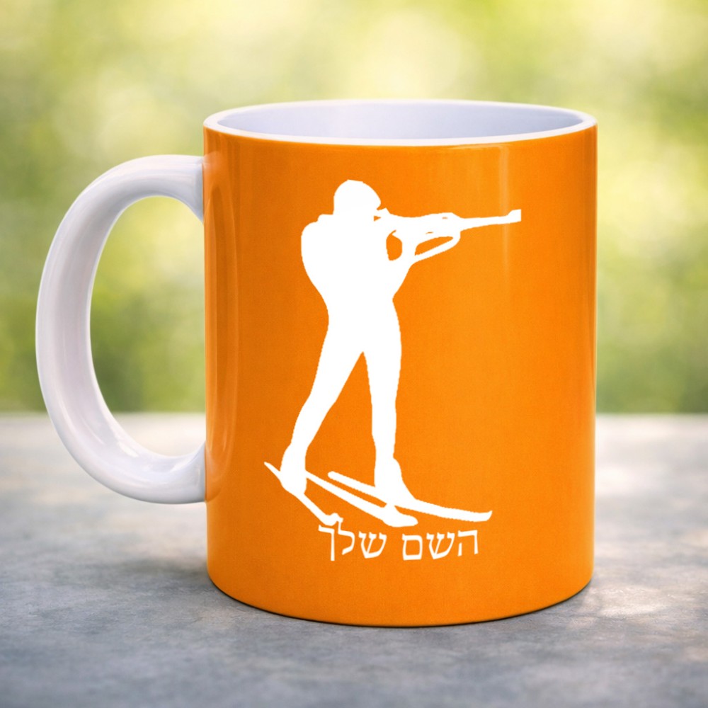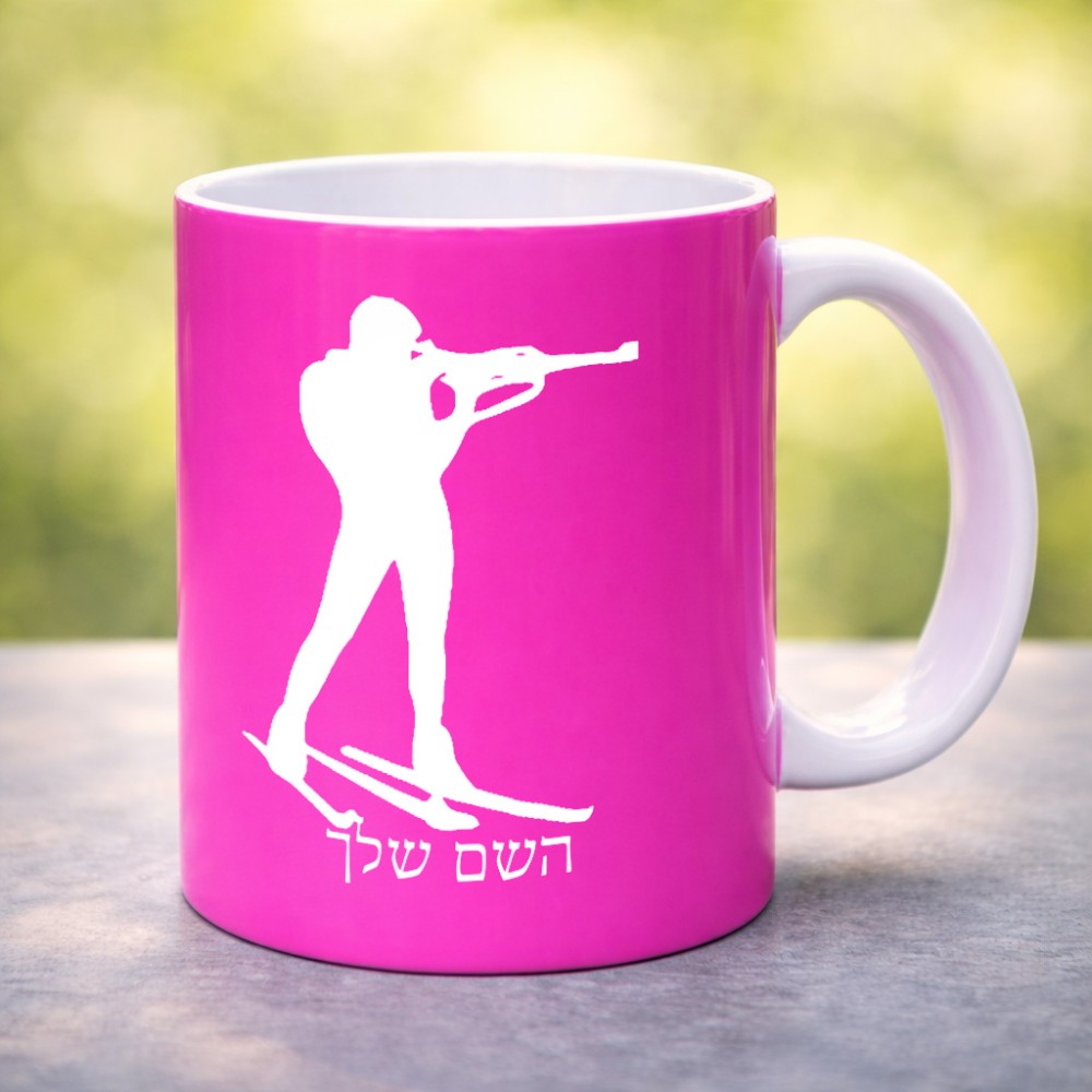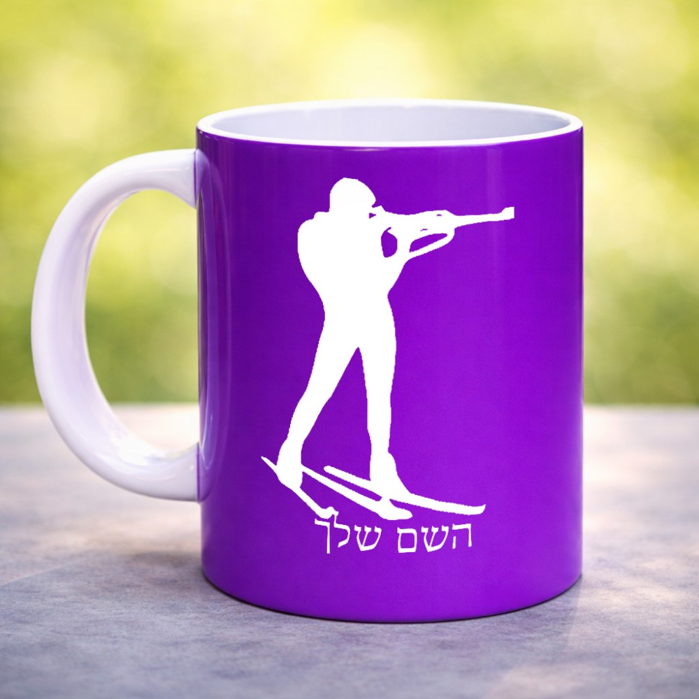 ספל תה \ קפה בעיצוב אישי עם השם שלך בעיצוב ביאתלון גדול הספל 325 מ"ל, הספל בעלת ידית לאחיזה יציבה. את השם המבוקש ניתן לציין בהזמנה, אם לא צויין אנחנו ניצור קשר לבירור.