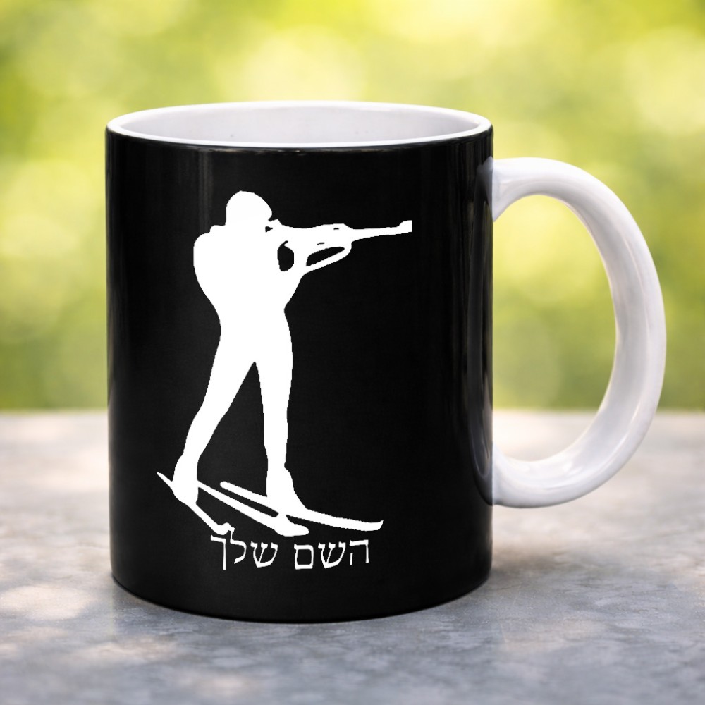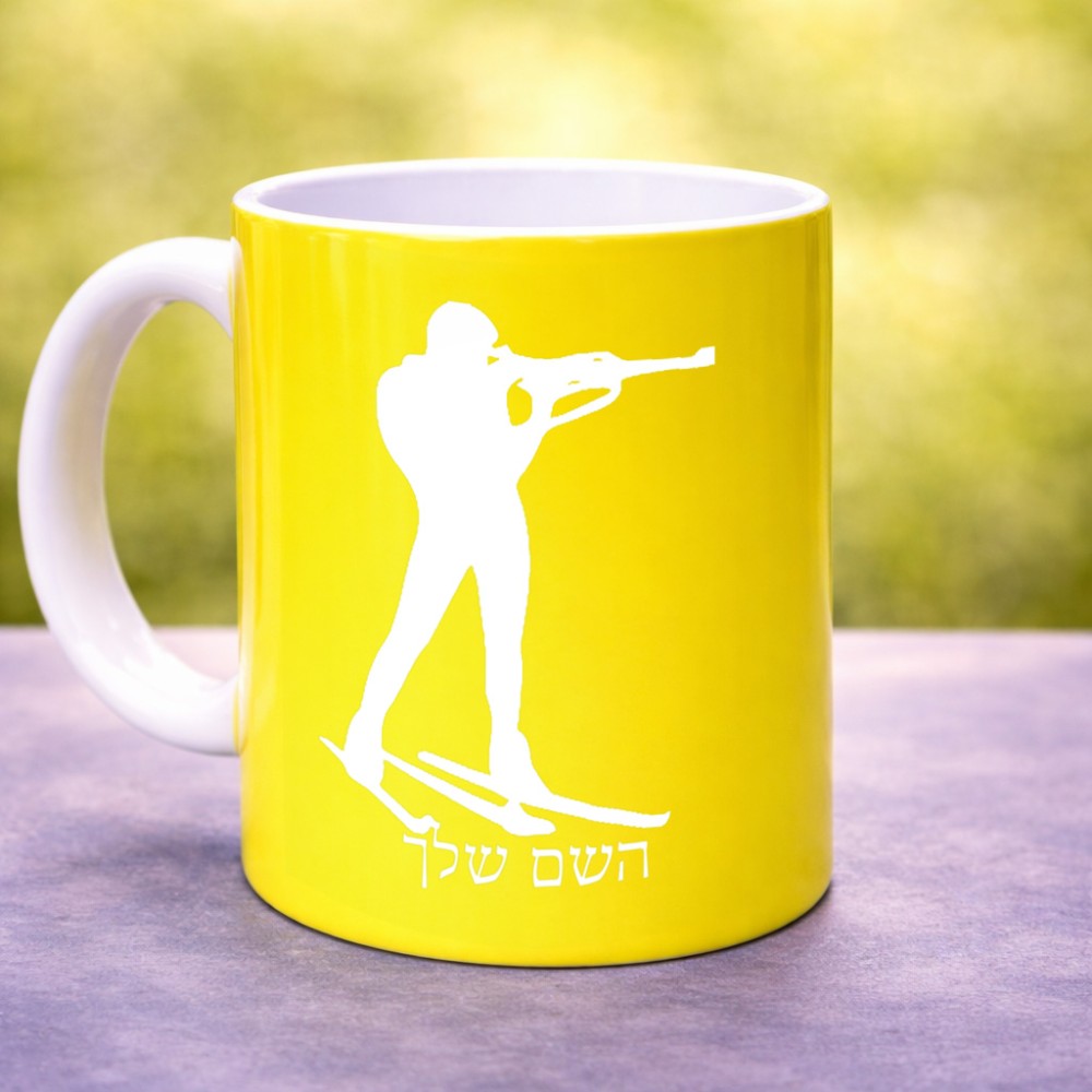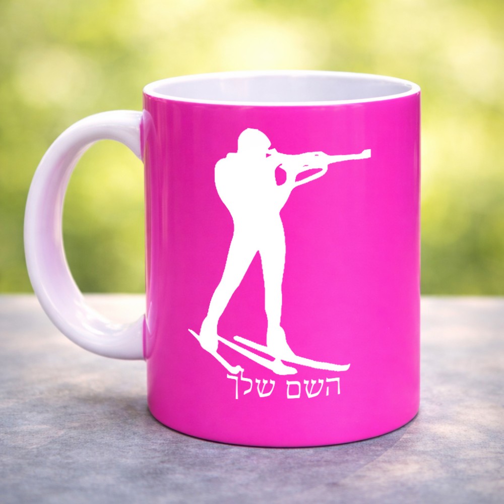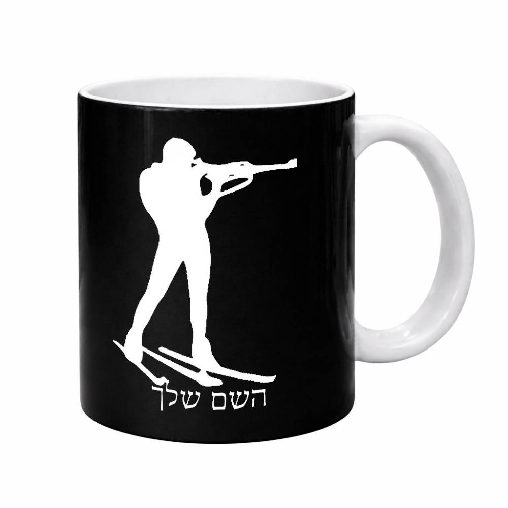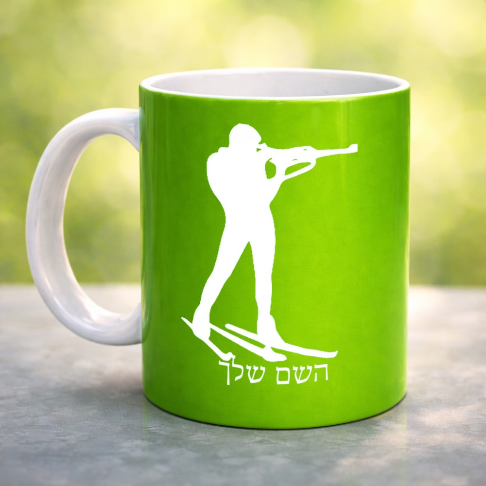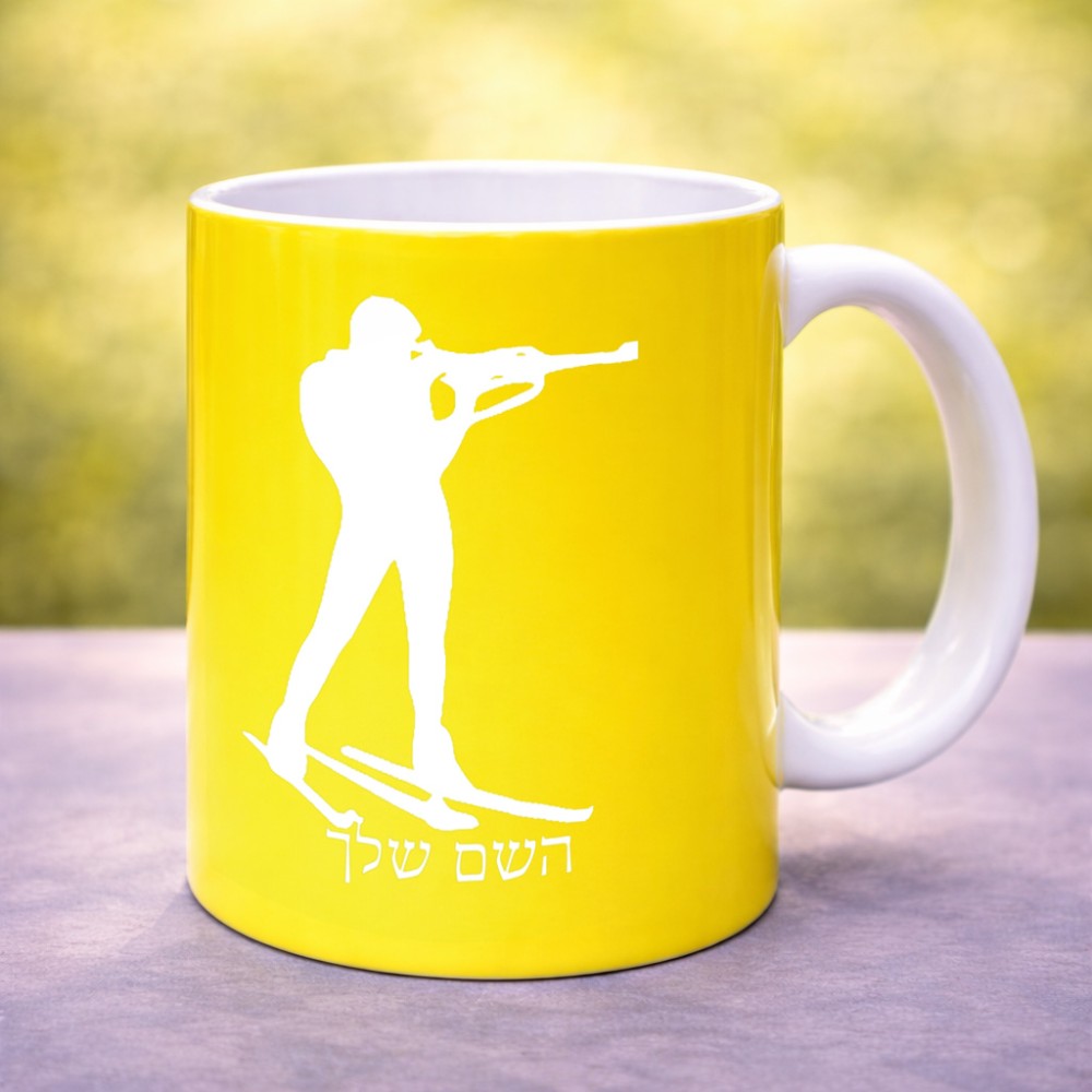 ספל תה \ קפה בעיצוב אישי עם השם שלך בעיצוב ביאתלון גדול הספל 325 מ"ל, הספל בעלת ידית לאחיזה יציבה. את השם המבוקש ניתן לציין בהזמנה, אם לא צויין אנחנו ניצור קשר לבירור.