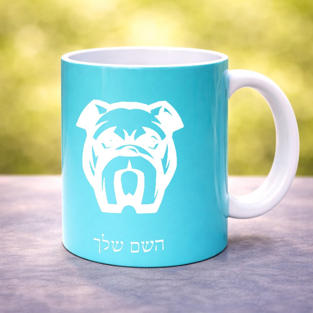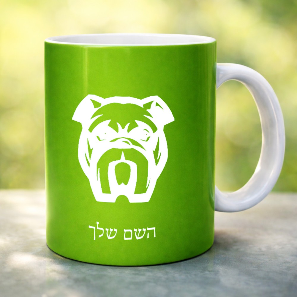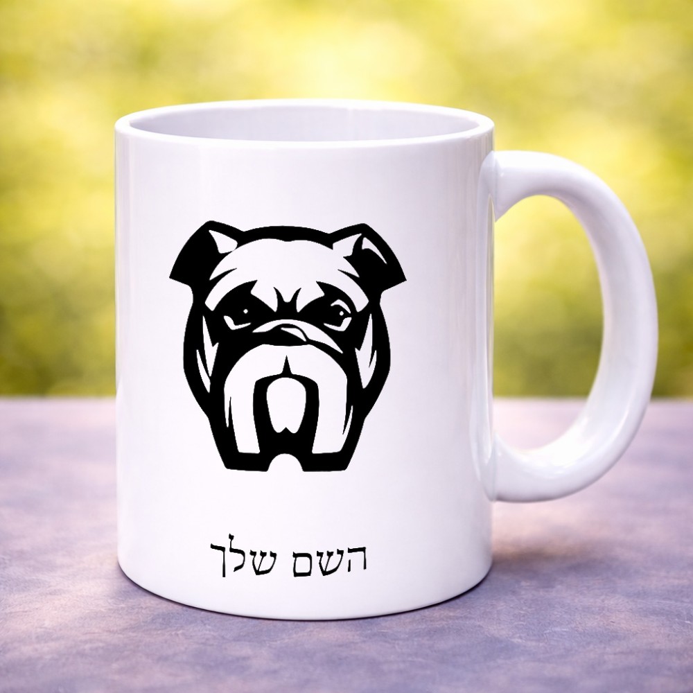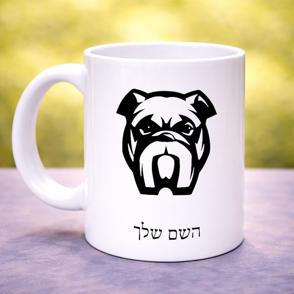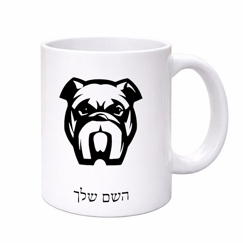 ספל תה \ קפה בעיצוב אישי עם השם שלך בעיצוב פרצוף בולדוג גדול הספל 325 מ"ל, הספל בעלת ידית לאחיזה יציבה. את השם המבוקש ניתן לציין בהזמנה, אם לא צויין אנחנו ניצור קשר לבירור.
