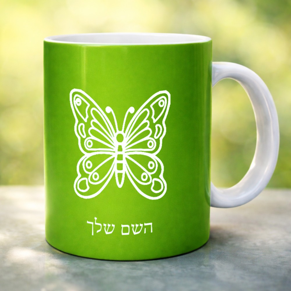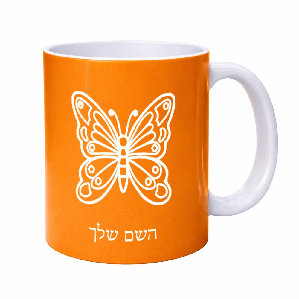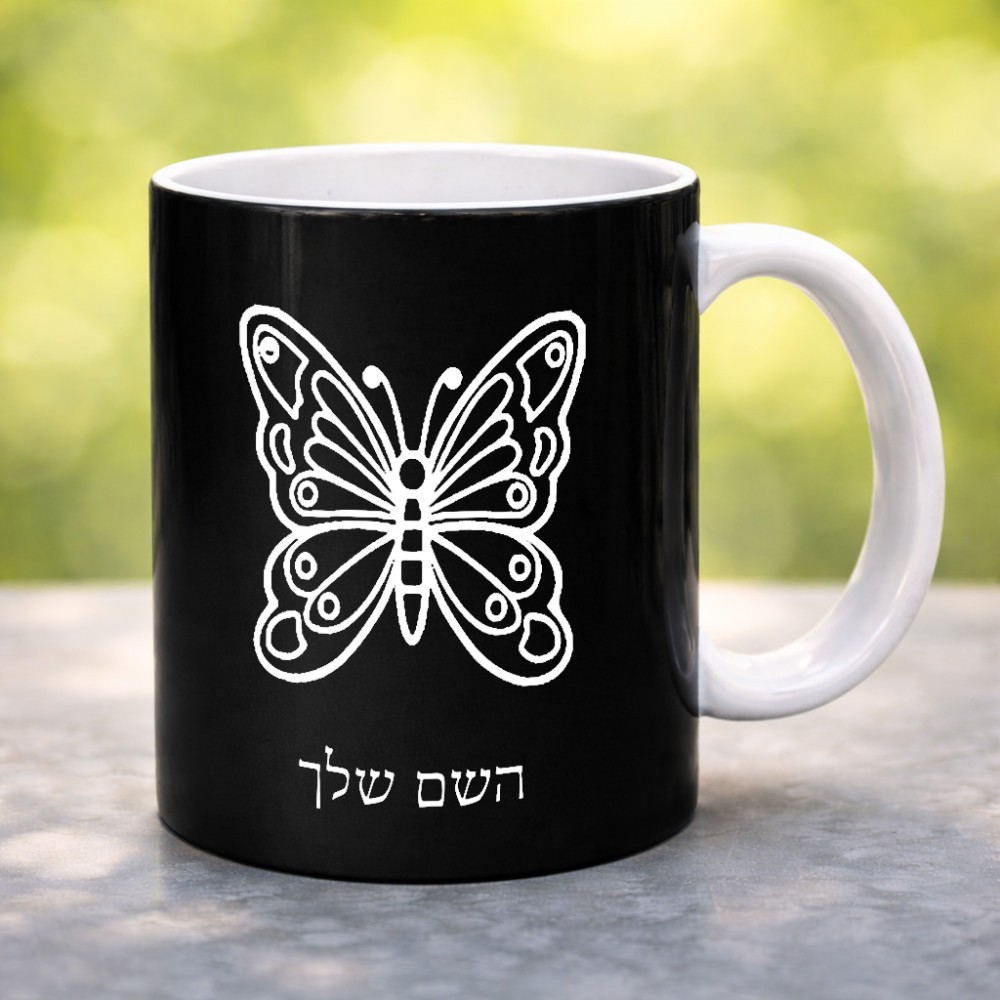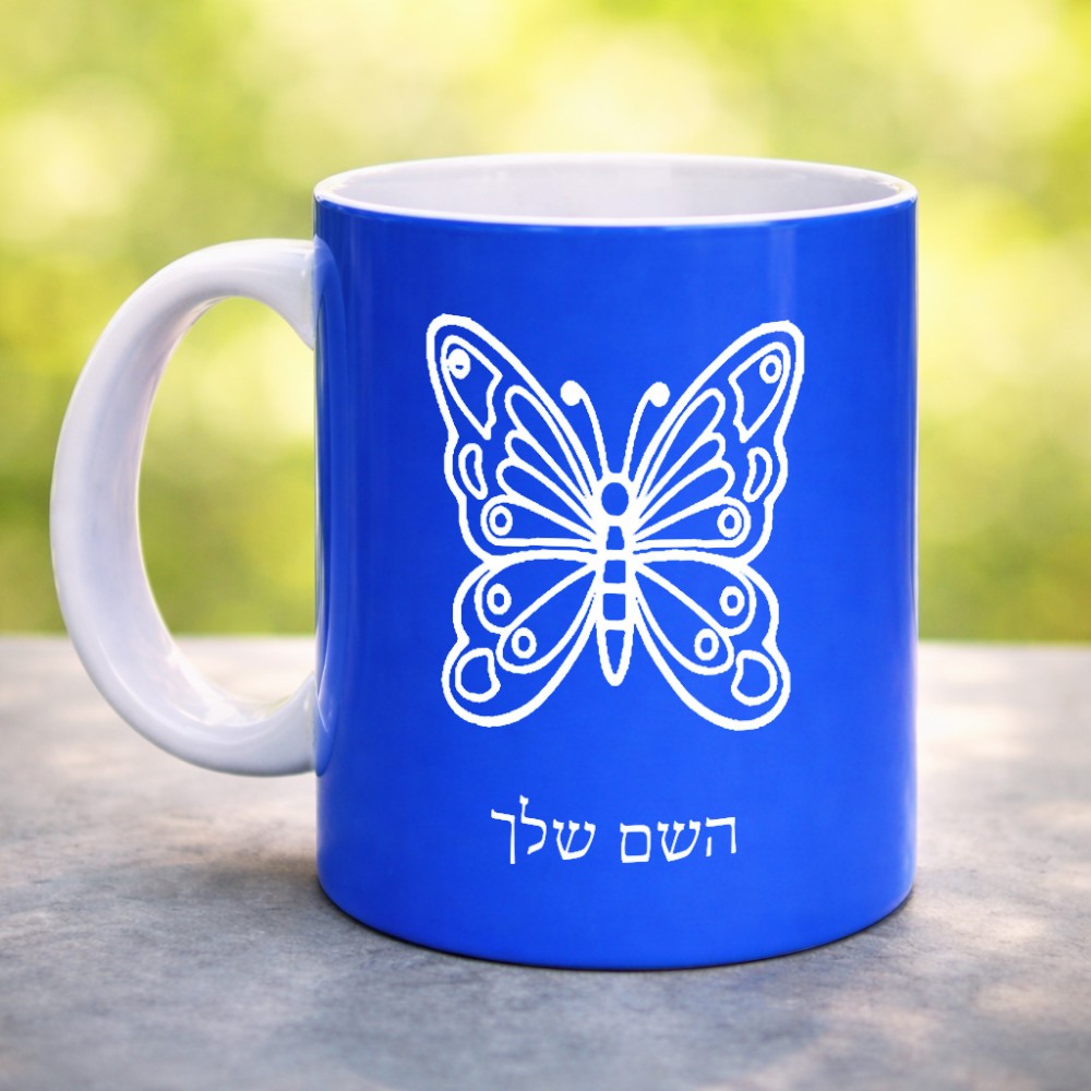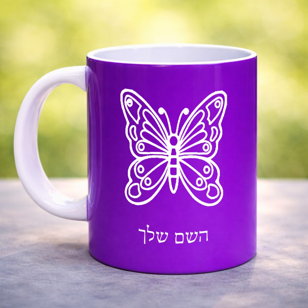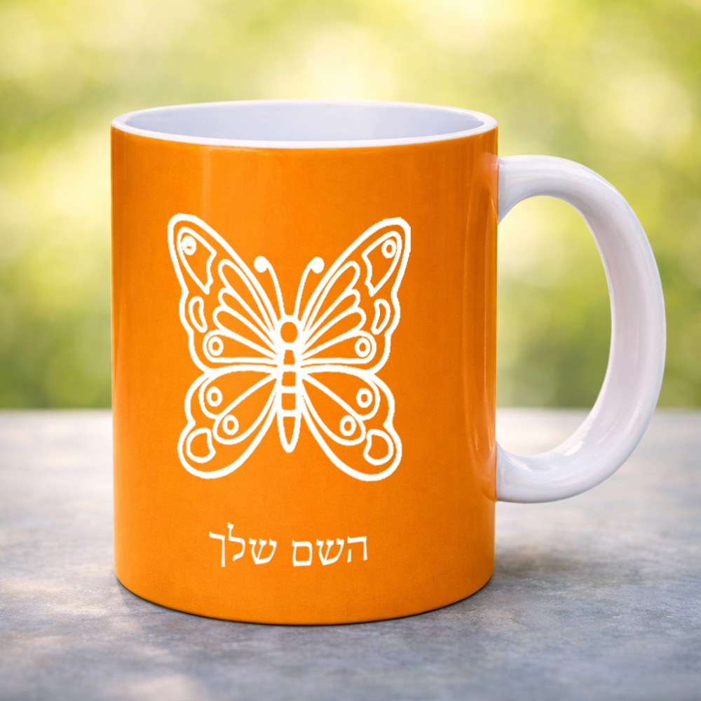 ספל תה \ קפה בעיצוב אישי עם השם שלך בעיצוב פרפר גדול הספל 325 מ"ל, הספל בעלת ידית לאחיזה יציבה. את השם המבוקש ניתן לציין בהזמנה, אם לא צויין אנחנו ניצור קשר לבירור.