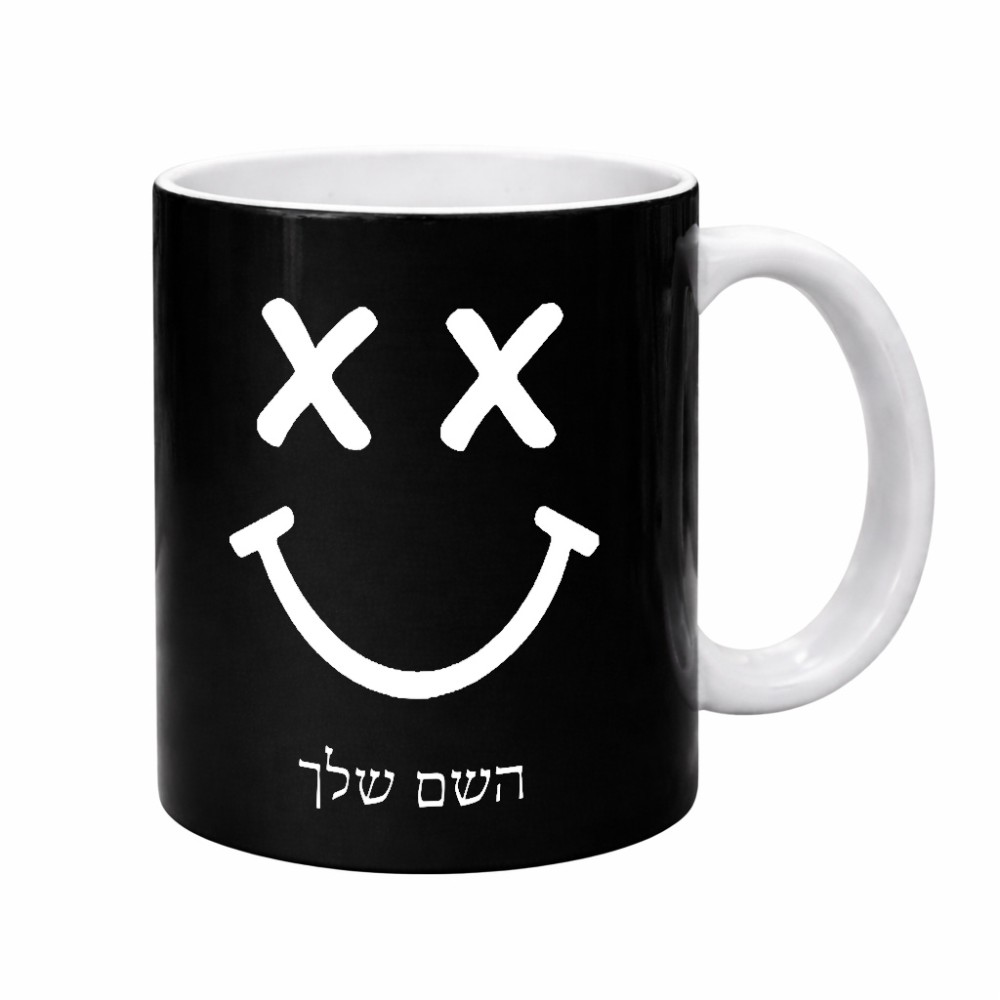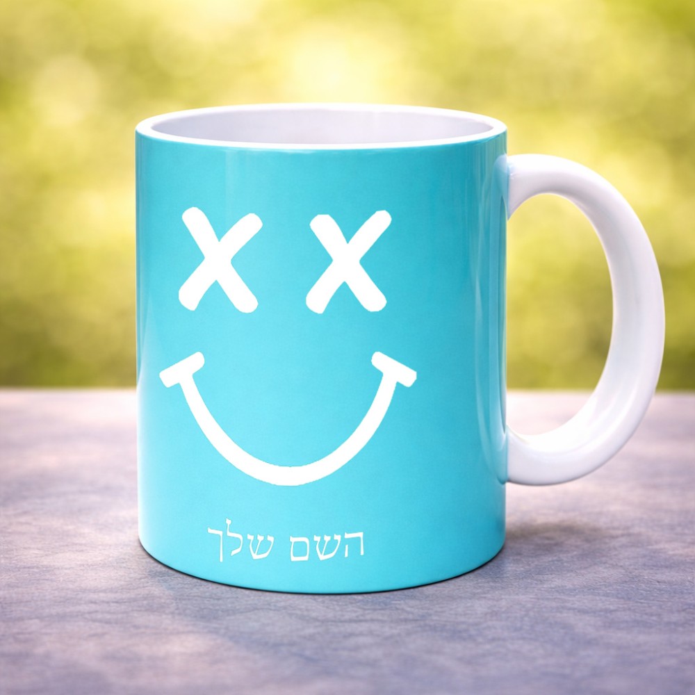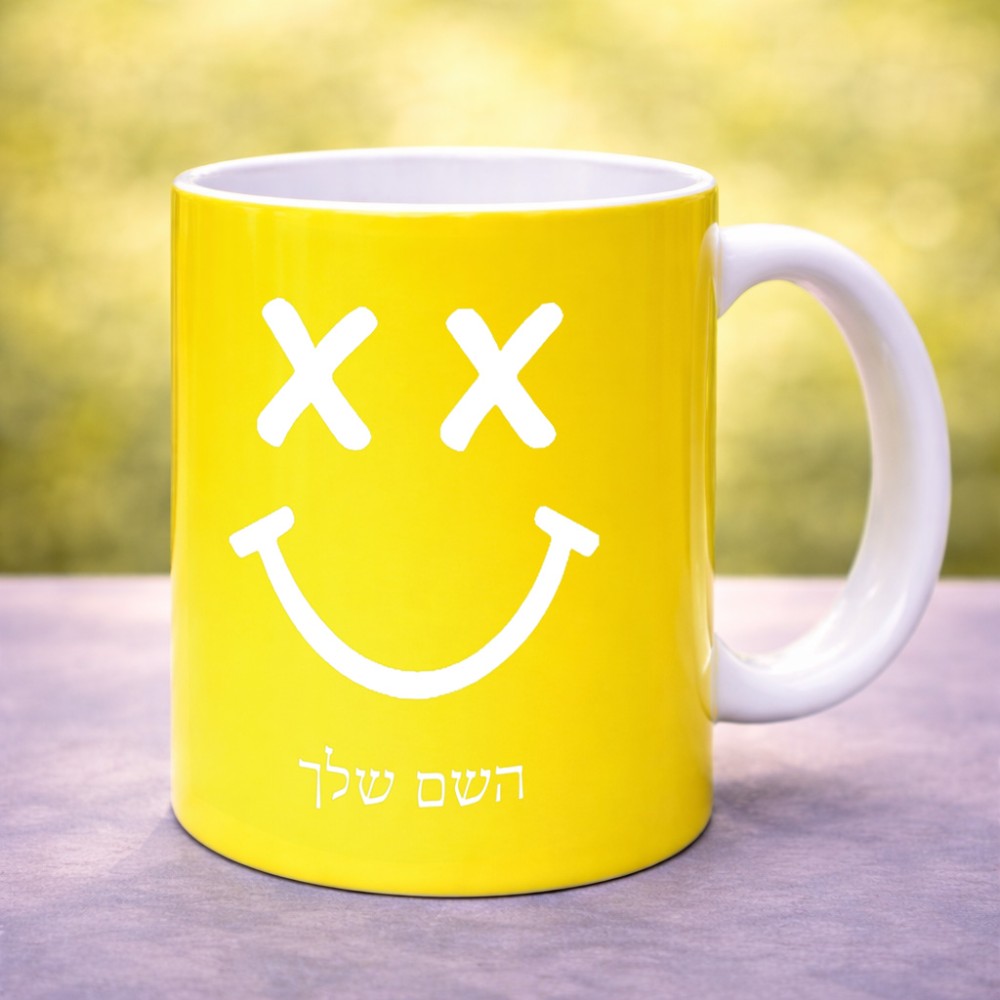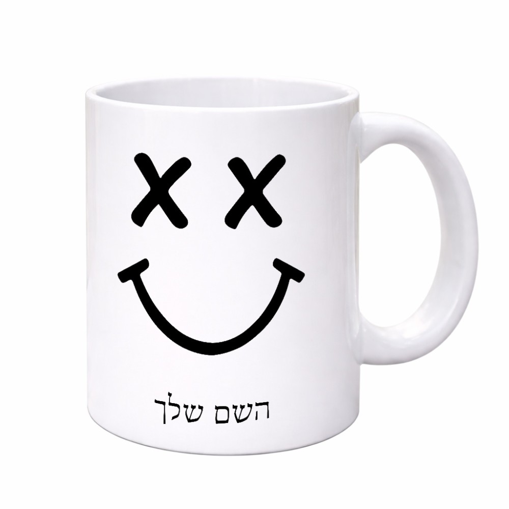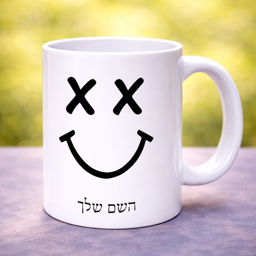 ספל תה \ קפה בעיצוב אישי עם השם שלך בעיצוב סמיילי גודל הספל 325 מ"ל