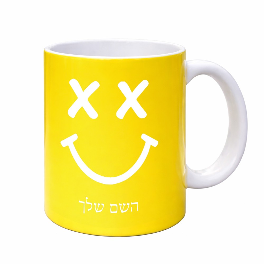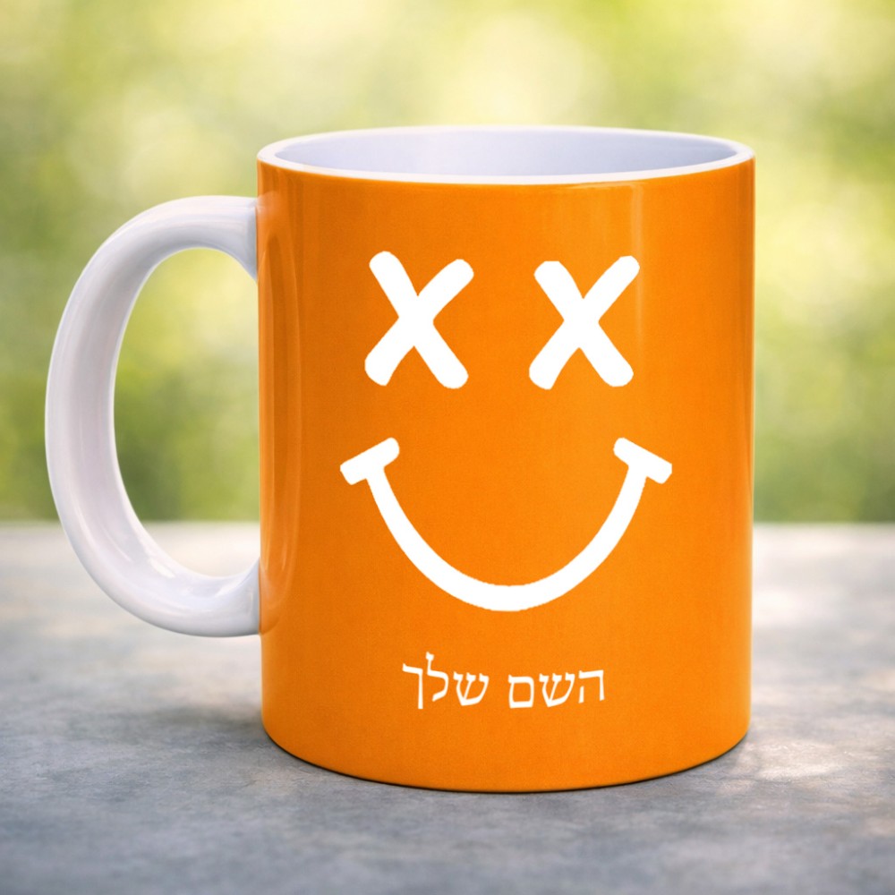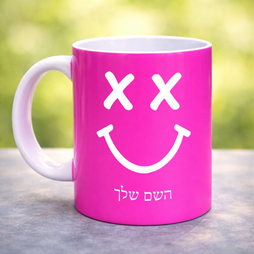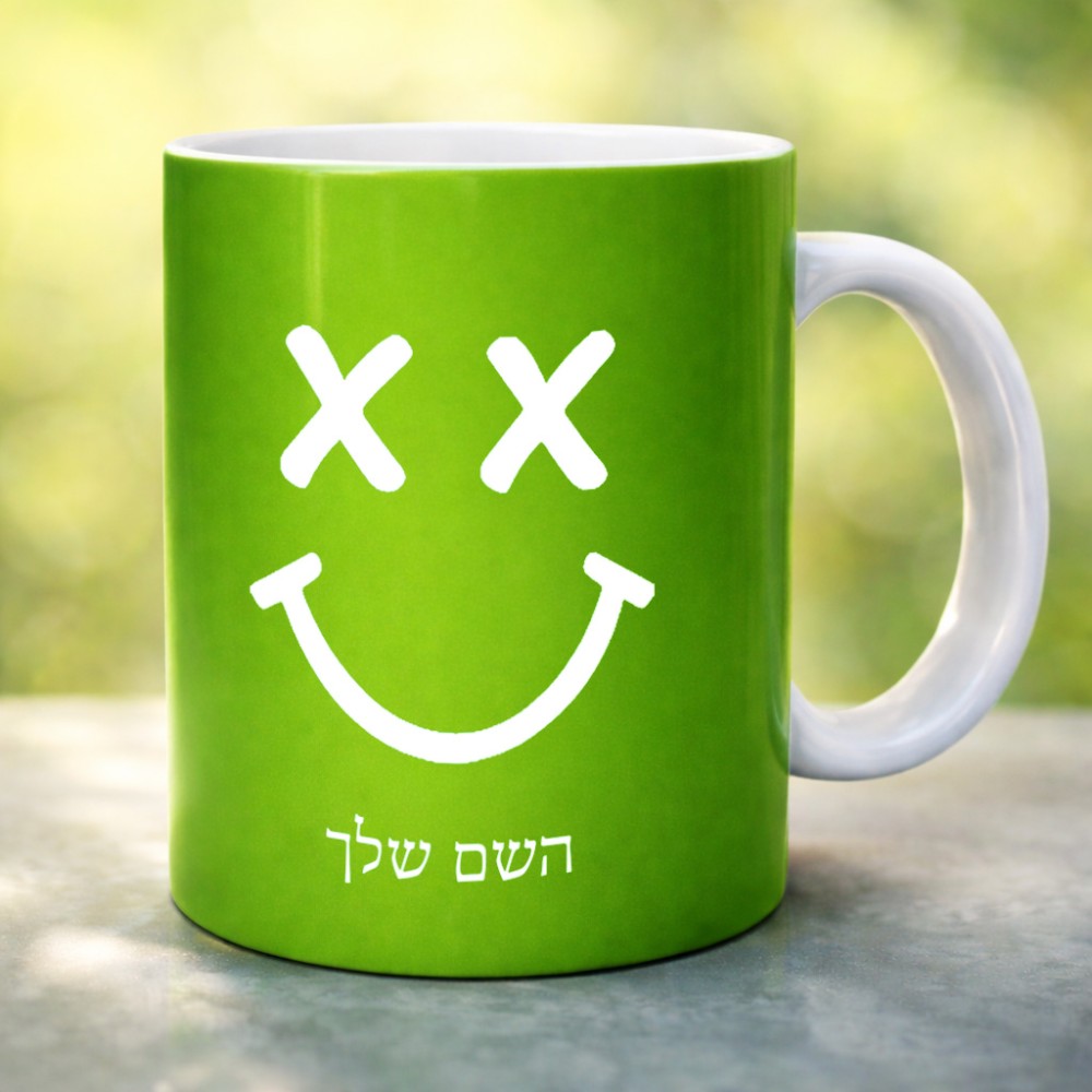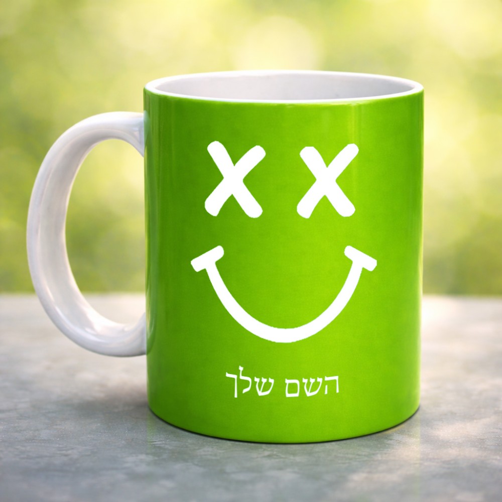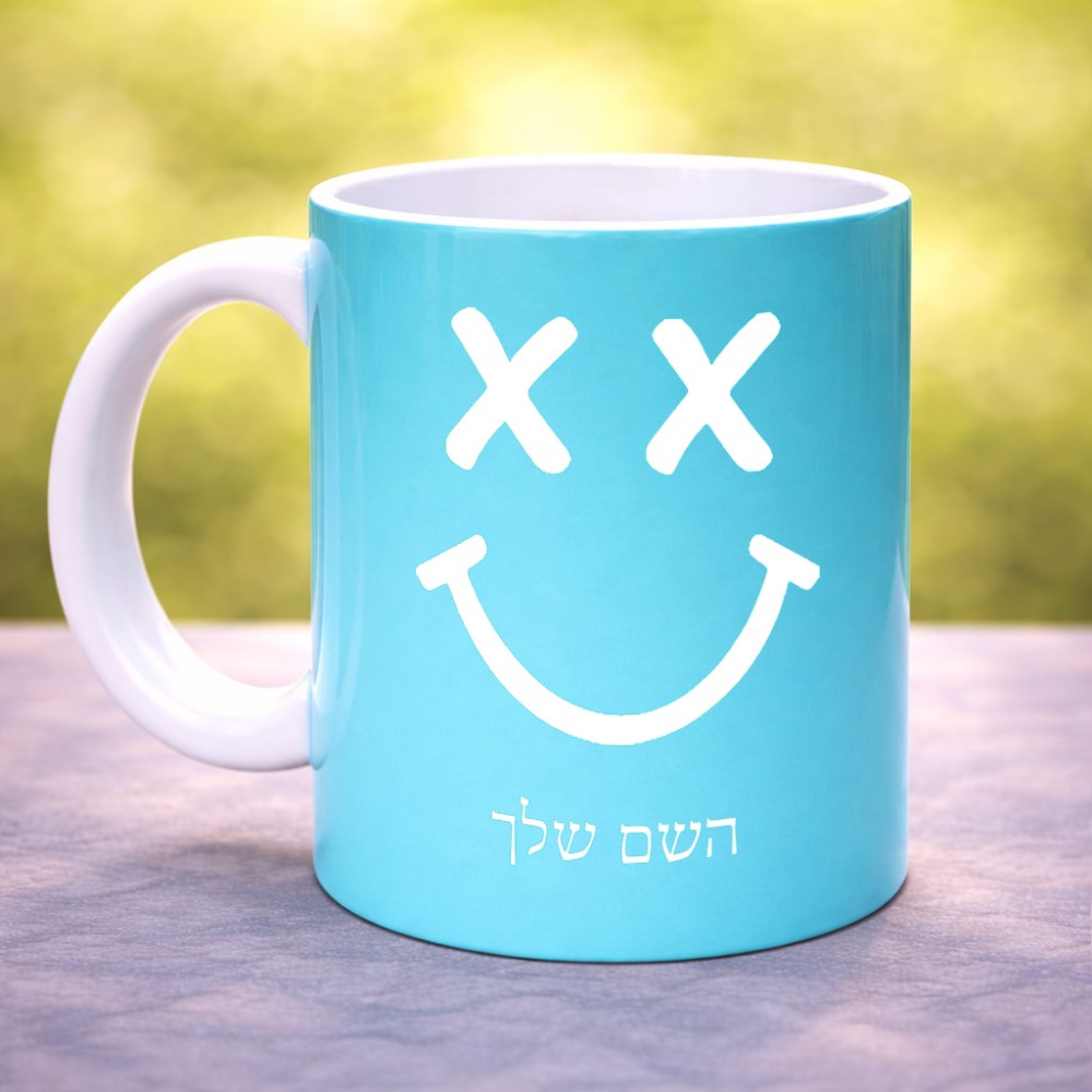 ספל תה \ קפה בעיצוב אישי עם השם שלך בעיצוב סמיילי גודל הספל 325 מ"ל