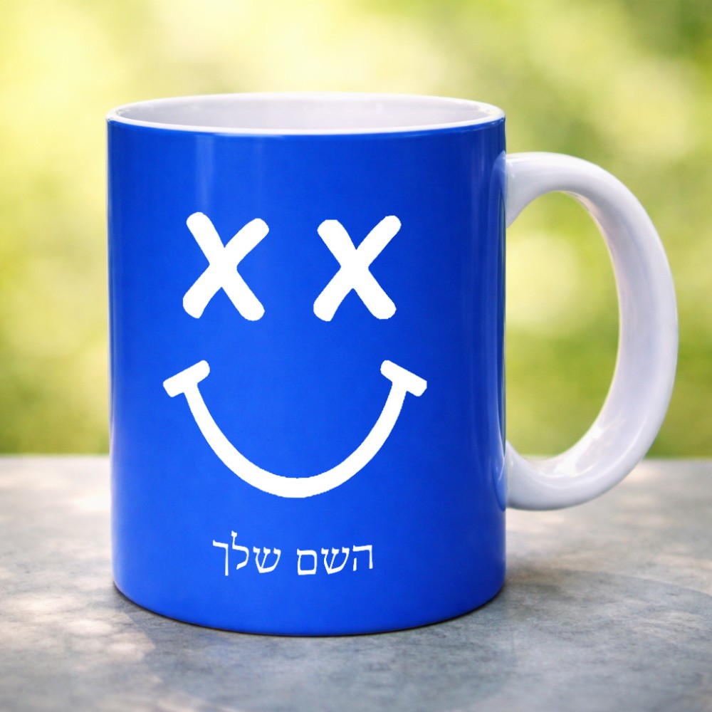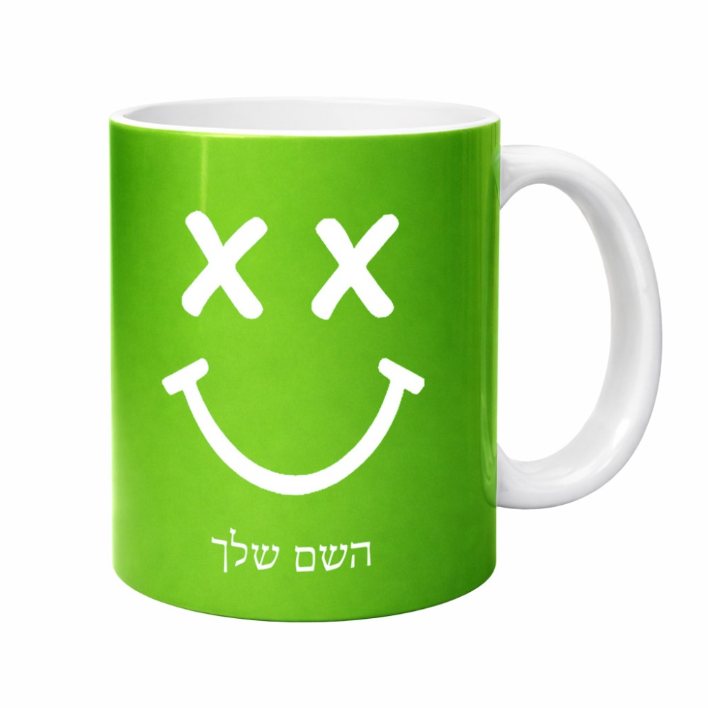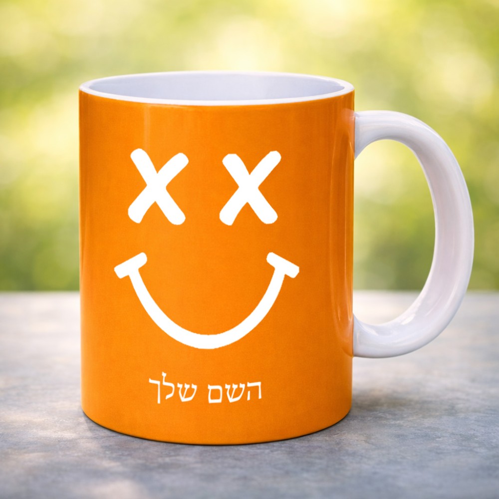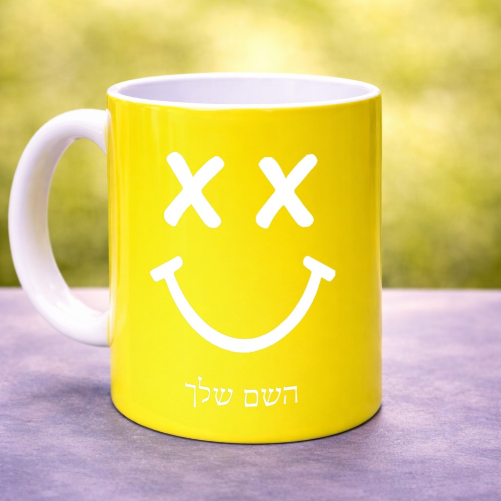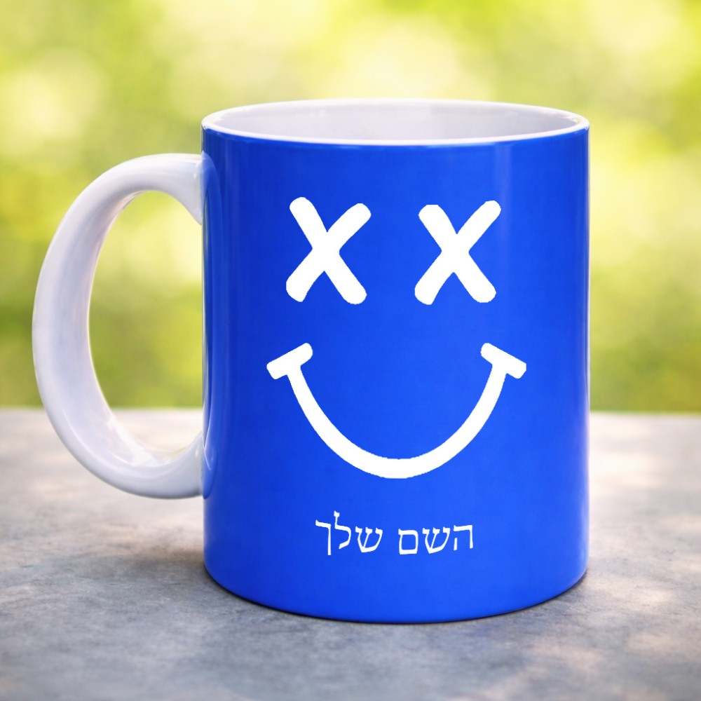 ספל תה \ קפה בעיצוב אישי עם השם שלך בעיצוב סמיילי גודל הספל 325 מ"ל