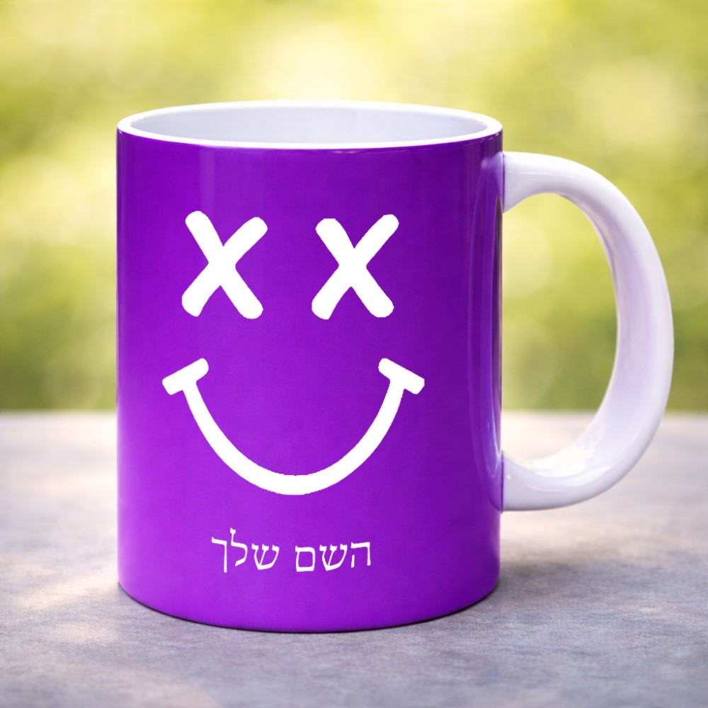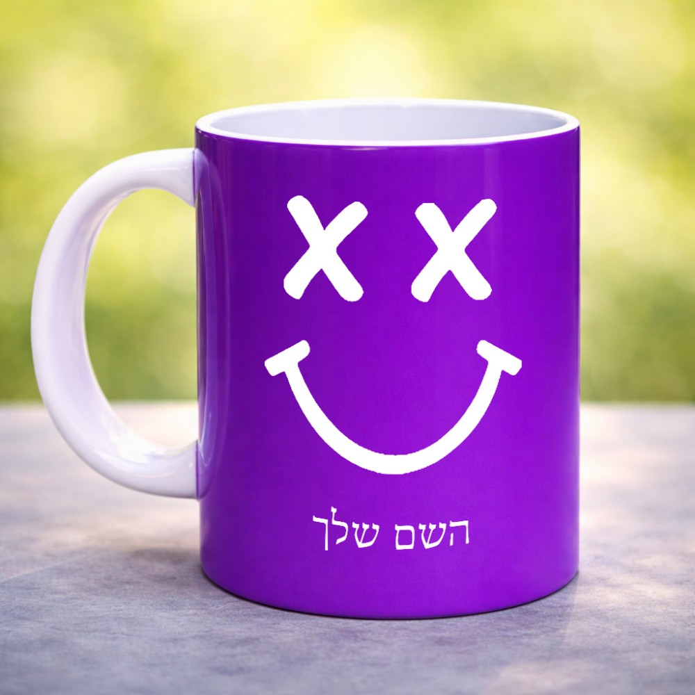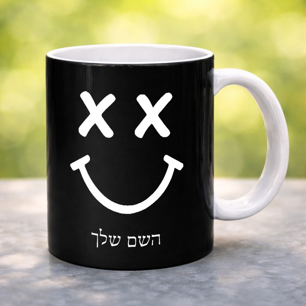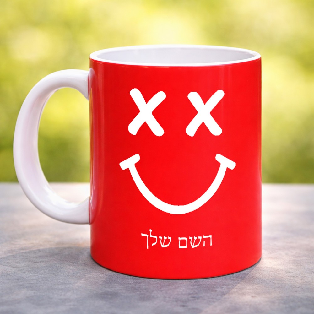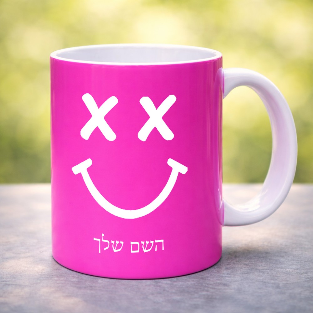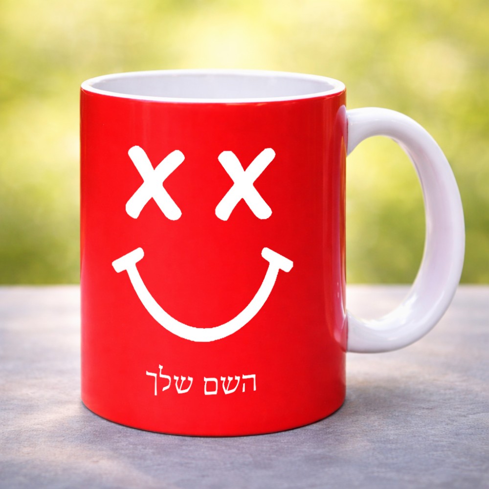 ספל תה \ קפה בעיצוב אישי עם השם שלך בעיצוב סמיילי גודל הספל 325 מ"ל