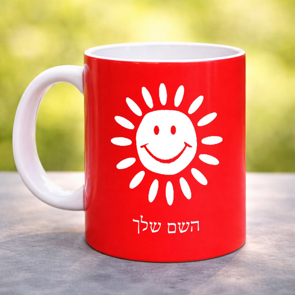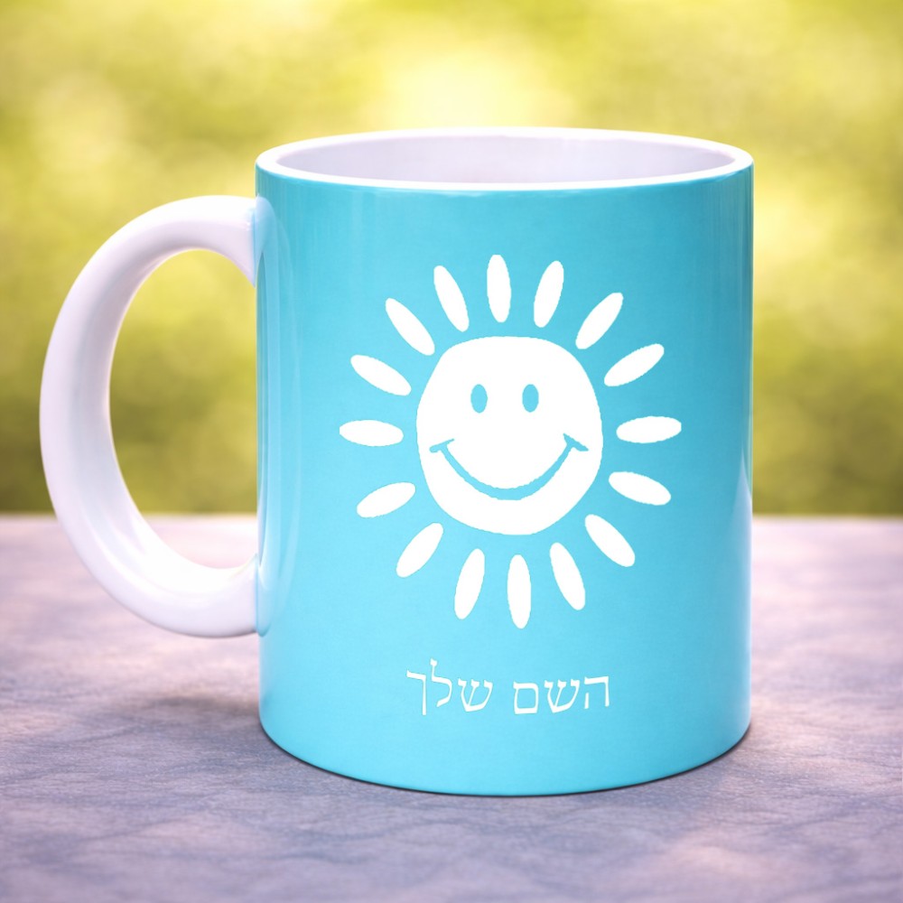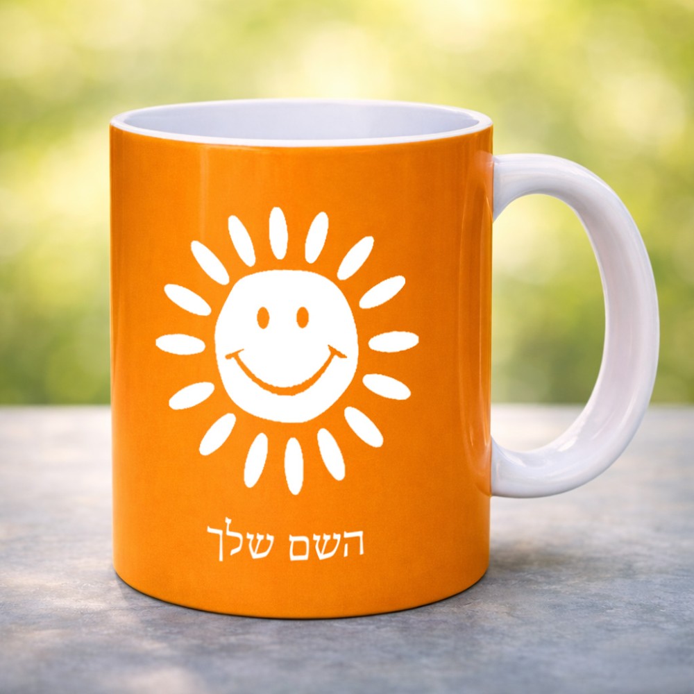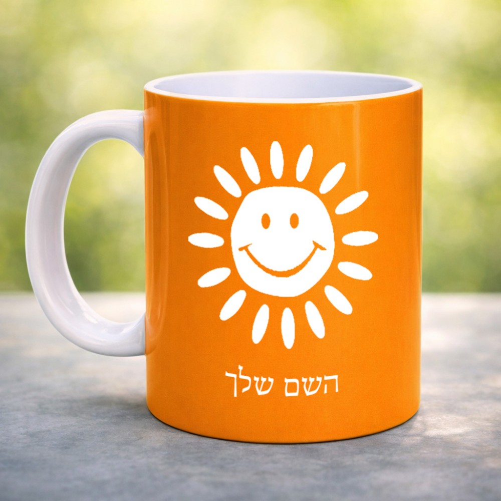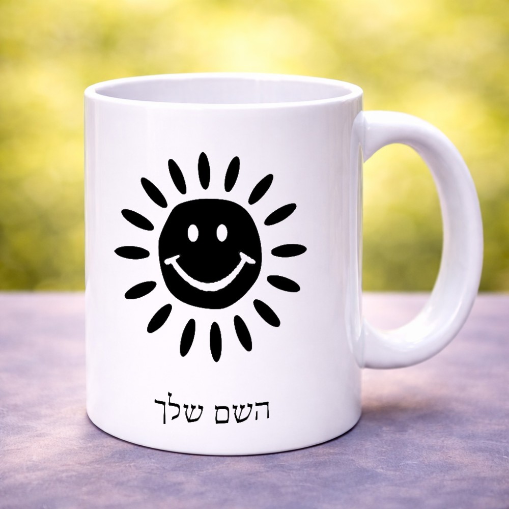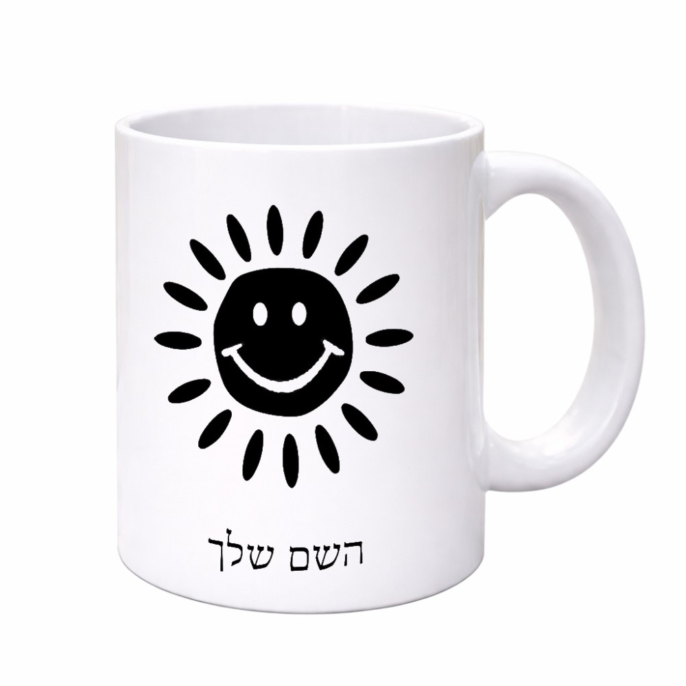 ספל תה \ קפה בעיצוב אישי עם השם שלך בעיצוב שמש גדול הספל 325 מ"ל, הספל בעלת ידית לאחיזה יציבה. את השם המבוקש ניתן לציין בהזמנה, אם לא צויין אנחנו ניצור קשר לבירור.