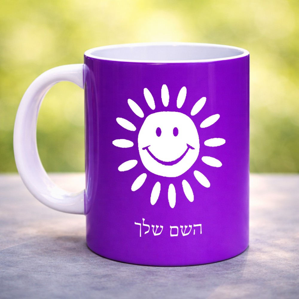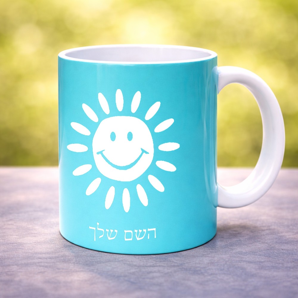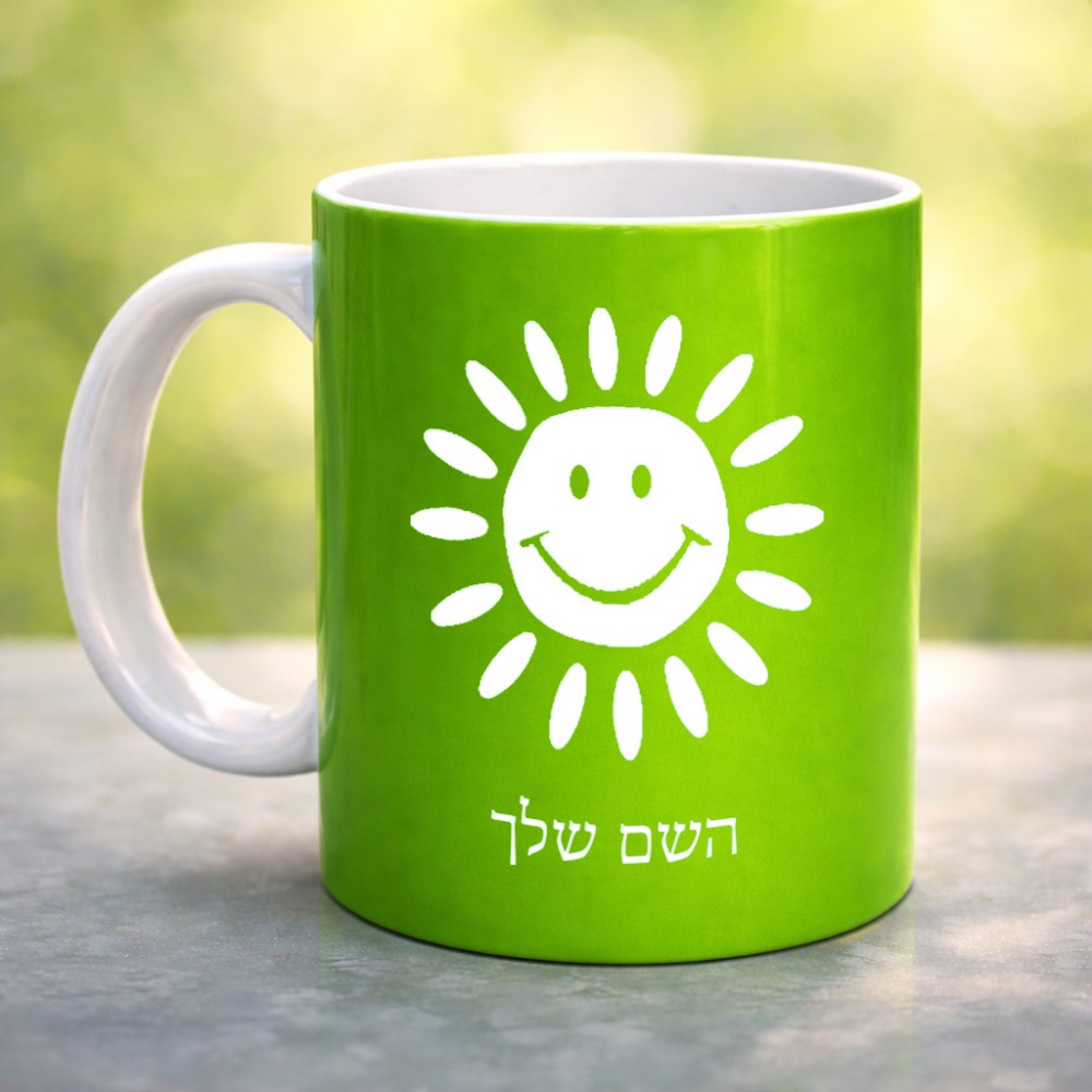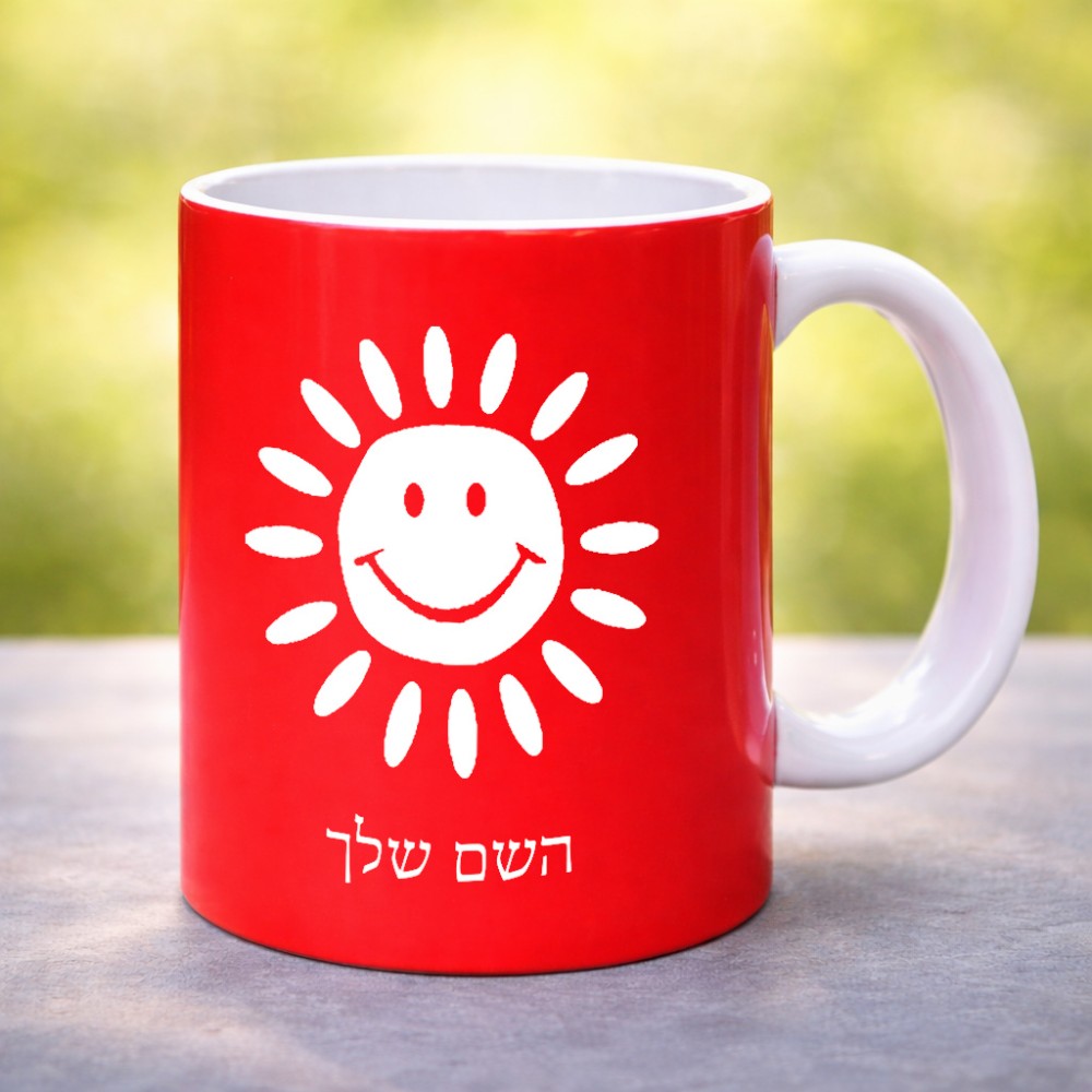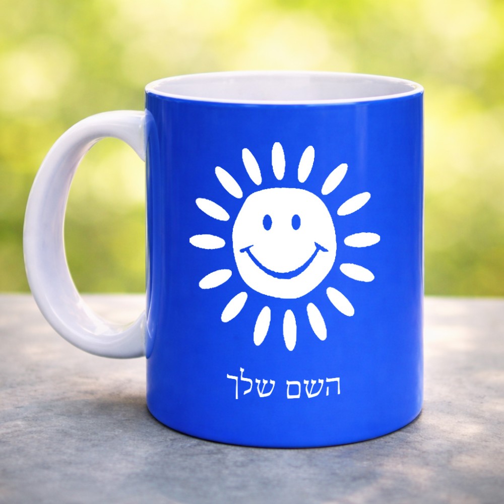 ספל תה \ קפה בעיצוב אישי עם השם שלך בעיצוב שמש גדול הספל 325 מ"ל, הספל בעלת ידית לאחיזה יציבה. את השם המבוקש ניתן לציין בהזמנה, אם לא צויין אנחנו ניצור קשר לבירור.