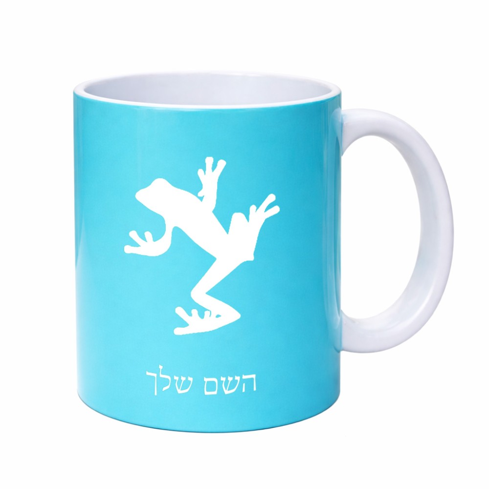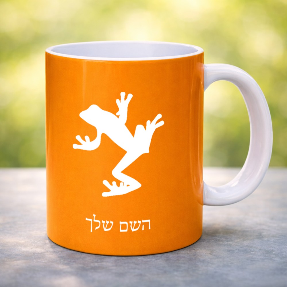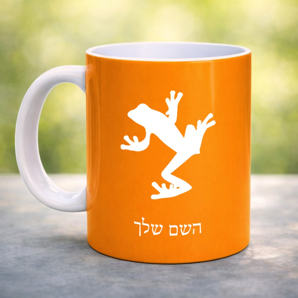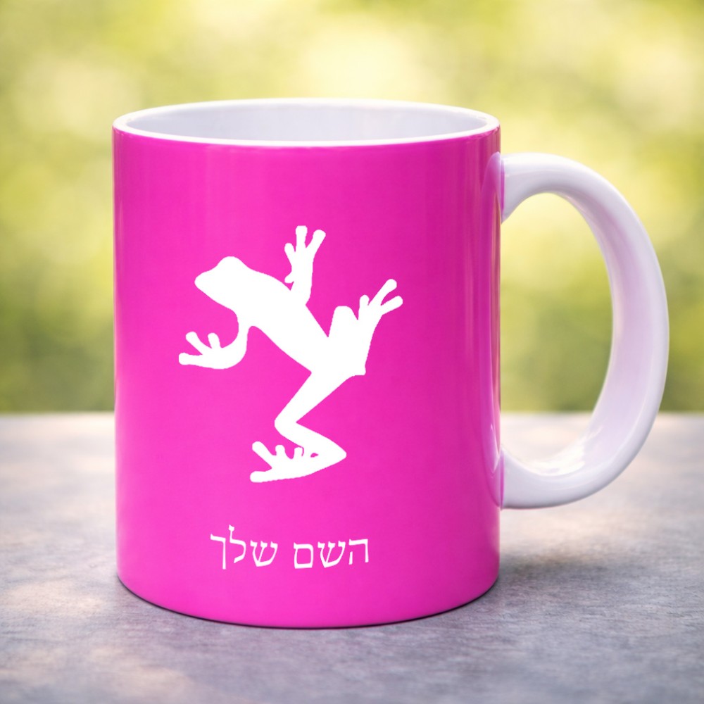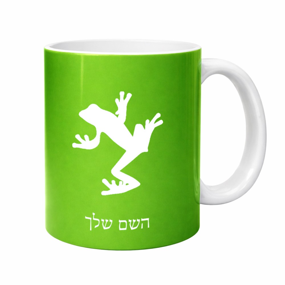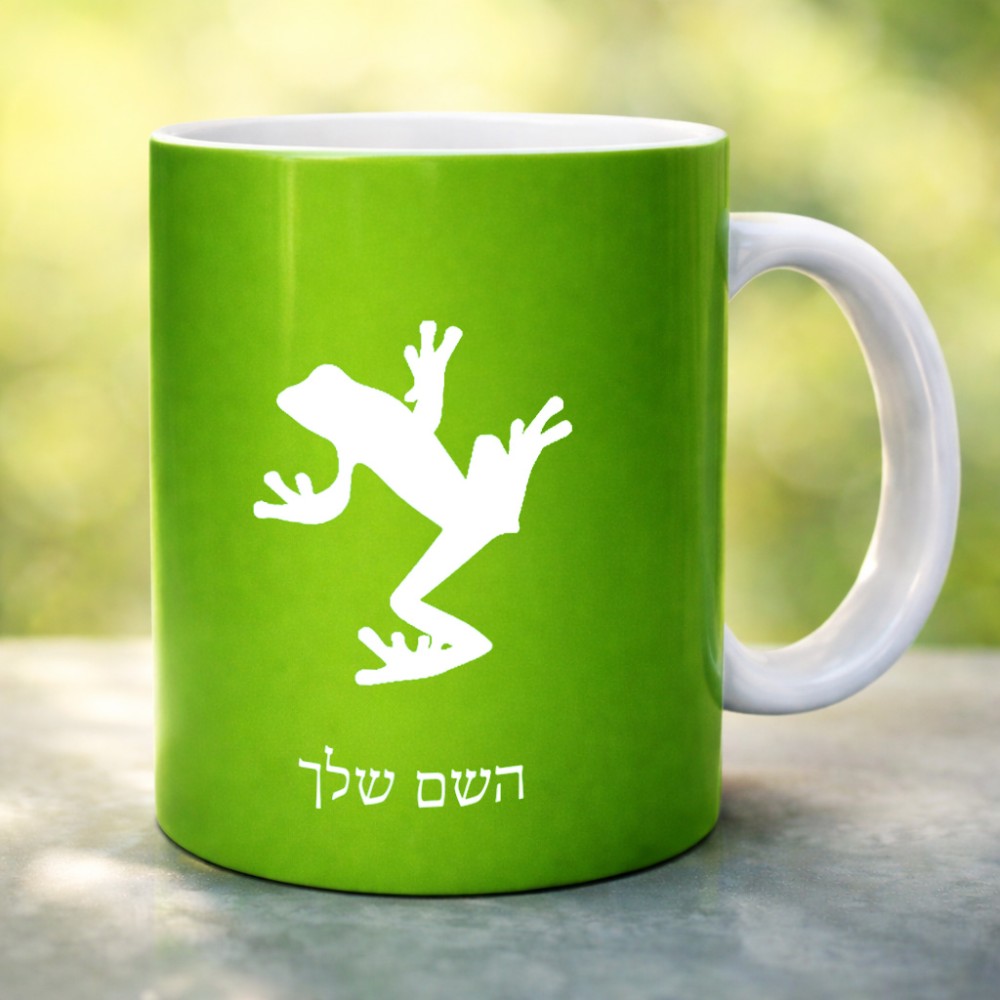 ספל תה \ קפה בעיצוב אישי עם השם שלך בעיצוב צפרדע טרופית גדול הספל 325 מ"ל, הספל בעלת ידית לאחיזה יציבה. את השם המבוקש ניתן לציין בהזמנה, אם לא צויין אנחנו ניצור קשר לבירור.