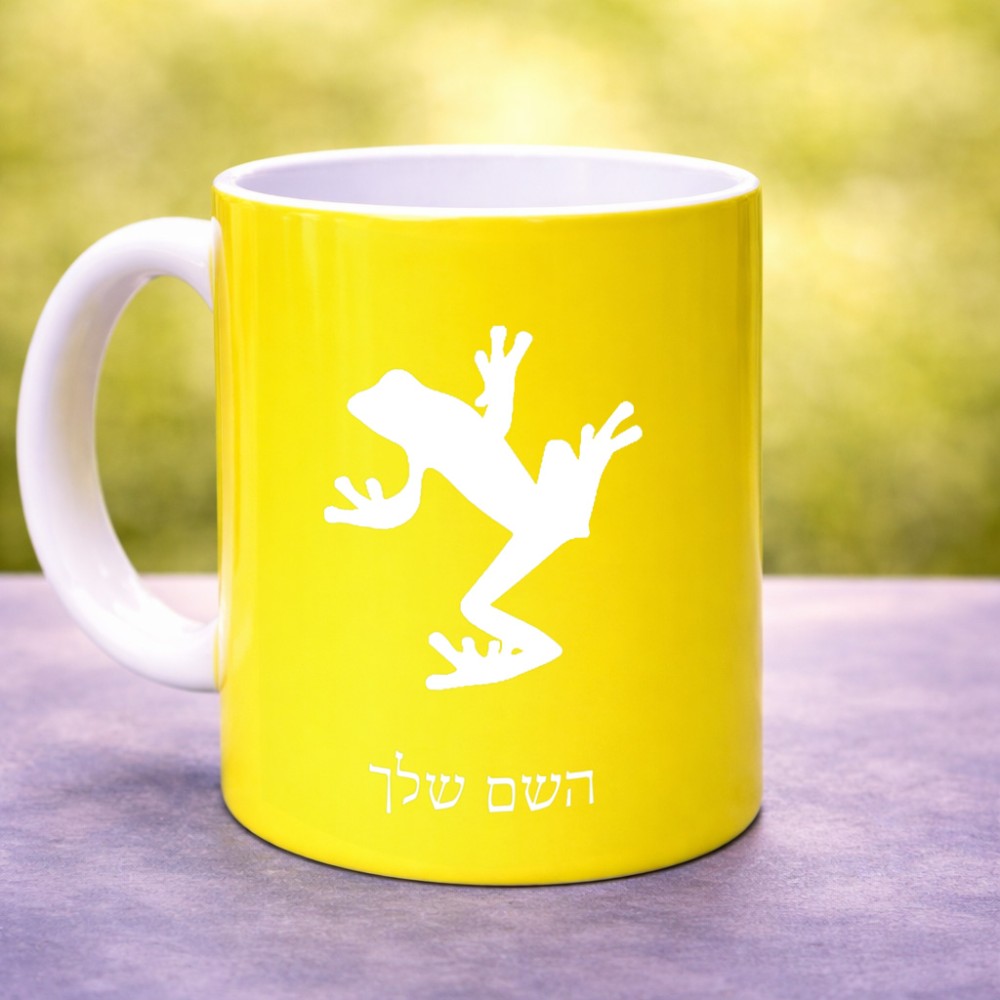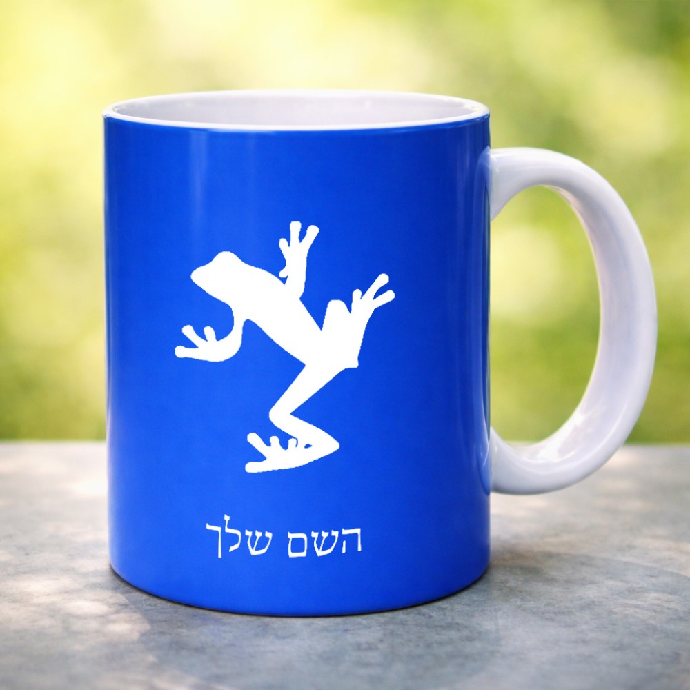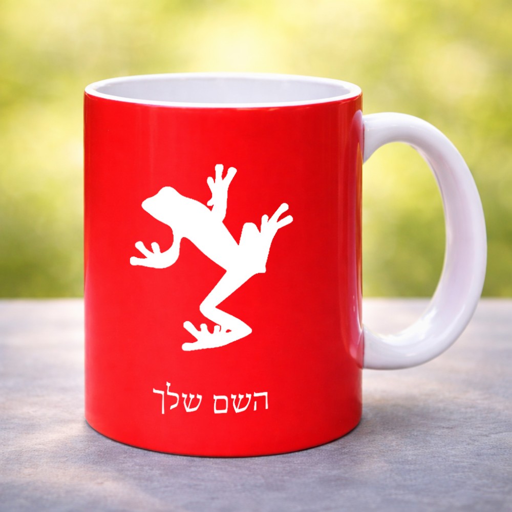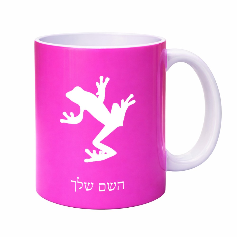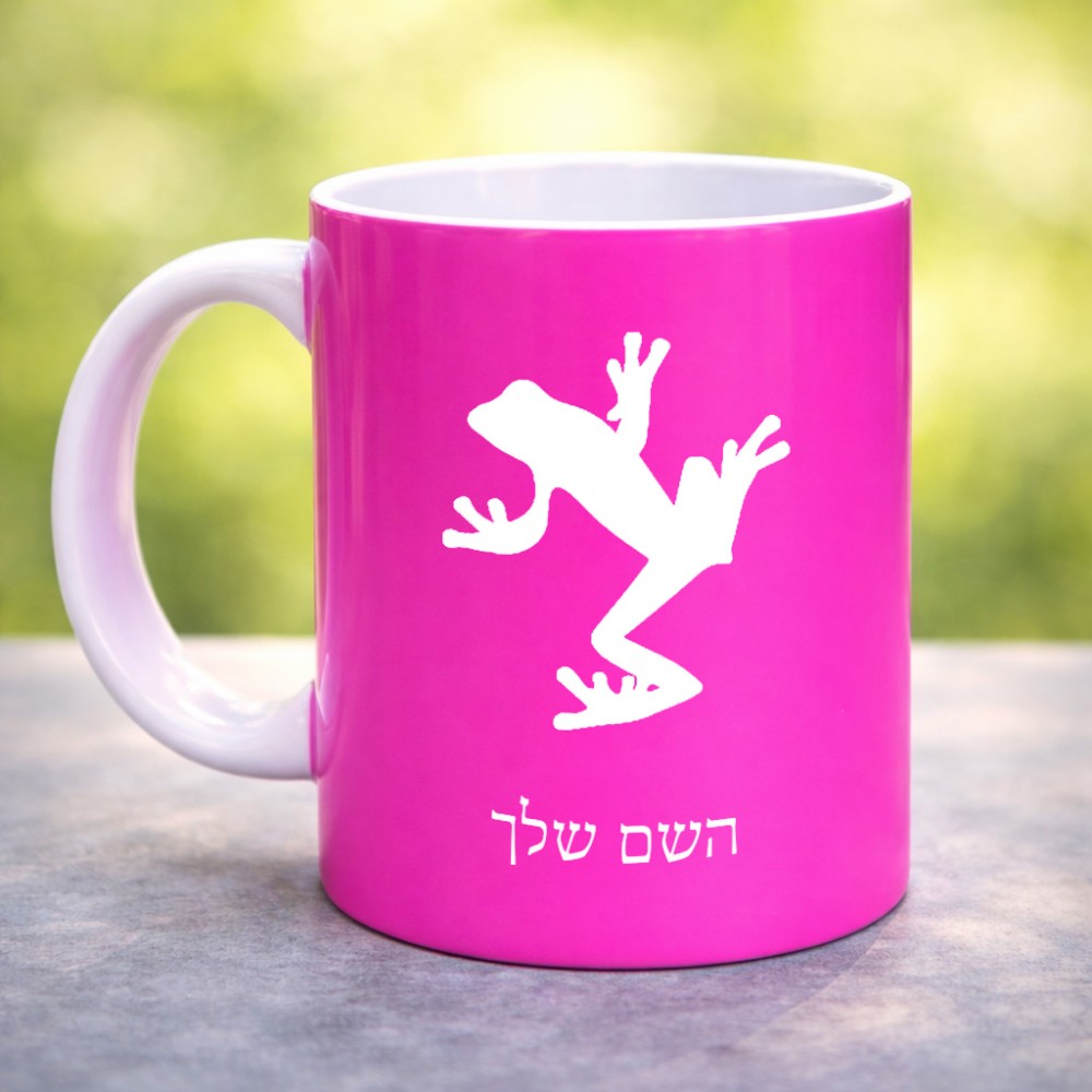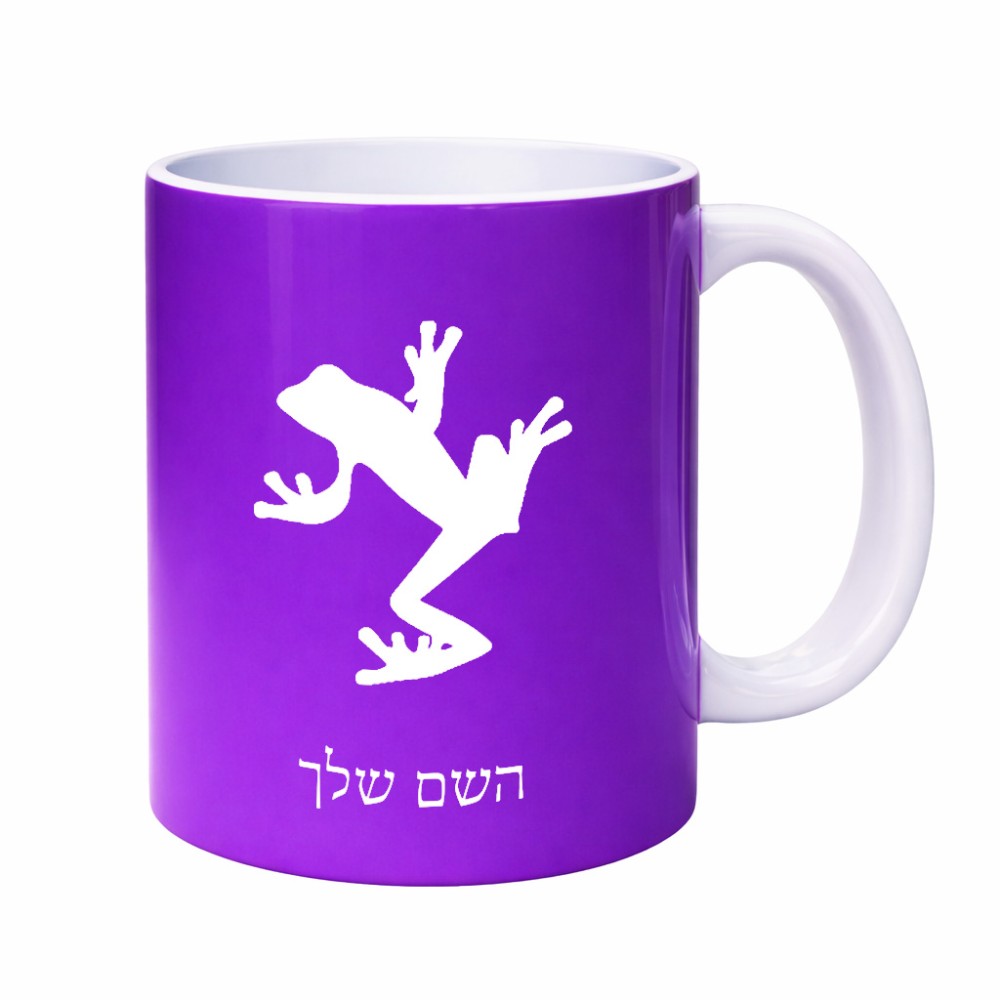 ספל תה \ קפה בעיצוב אישי עם השם שלך בעיצוב צפרדע טרופית גדול הספל 325 מ"ל, הספל בעלת ידית לאחיזה יציבה. את השם המבוקש ניתן לציין בהזמנה, אם לא צויין אנחנו ניצור קשר לבירור.