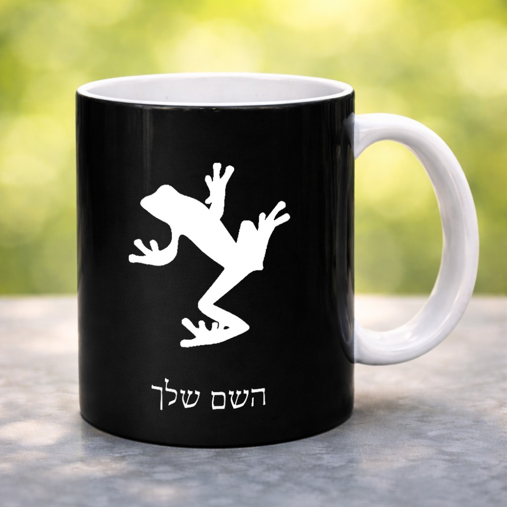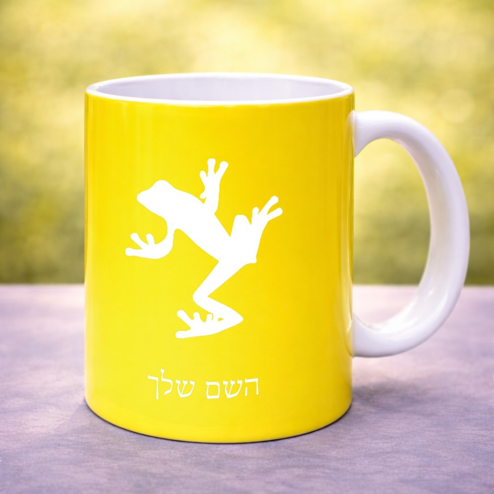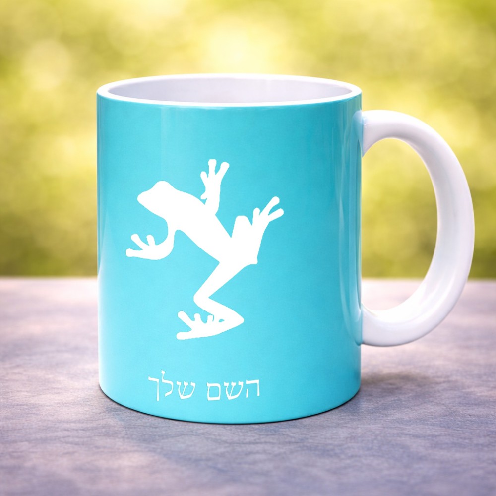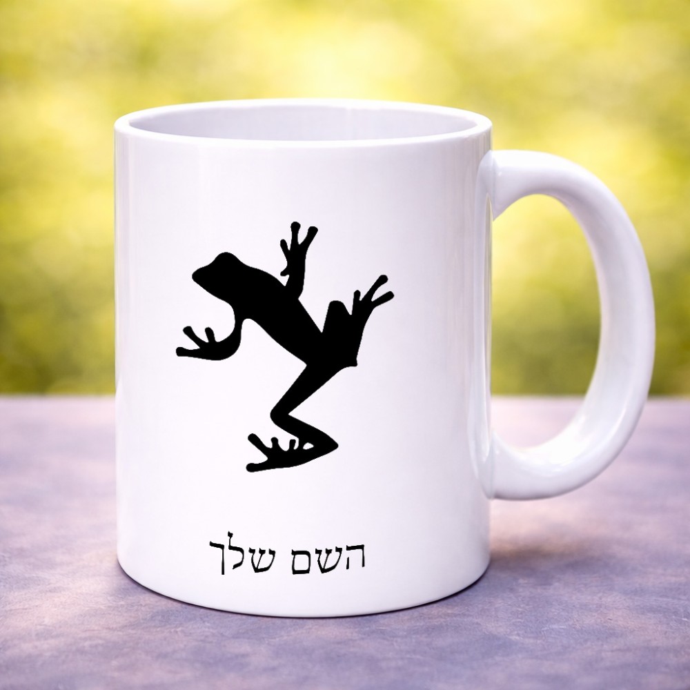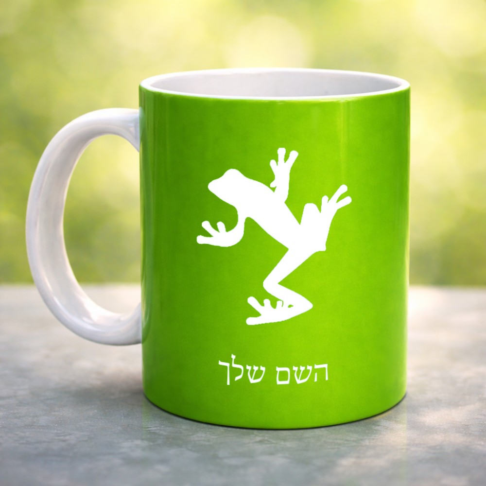 ספל תה \ קפה בעיצוב אישי עם השם שלך בעיצוב צפרדע טרופית גודל הספל 325 מ"ל