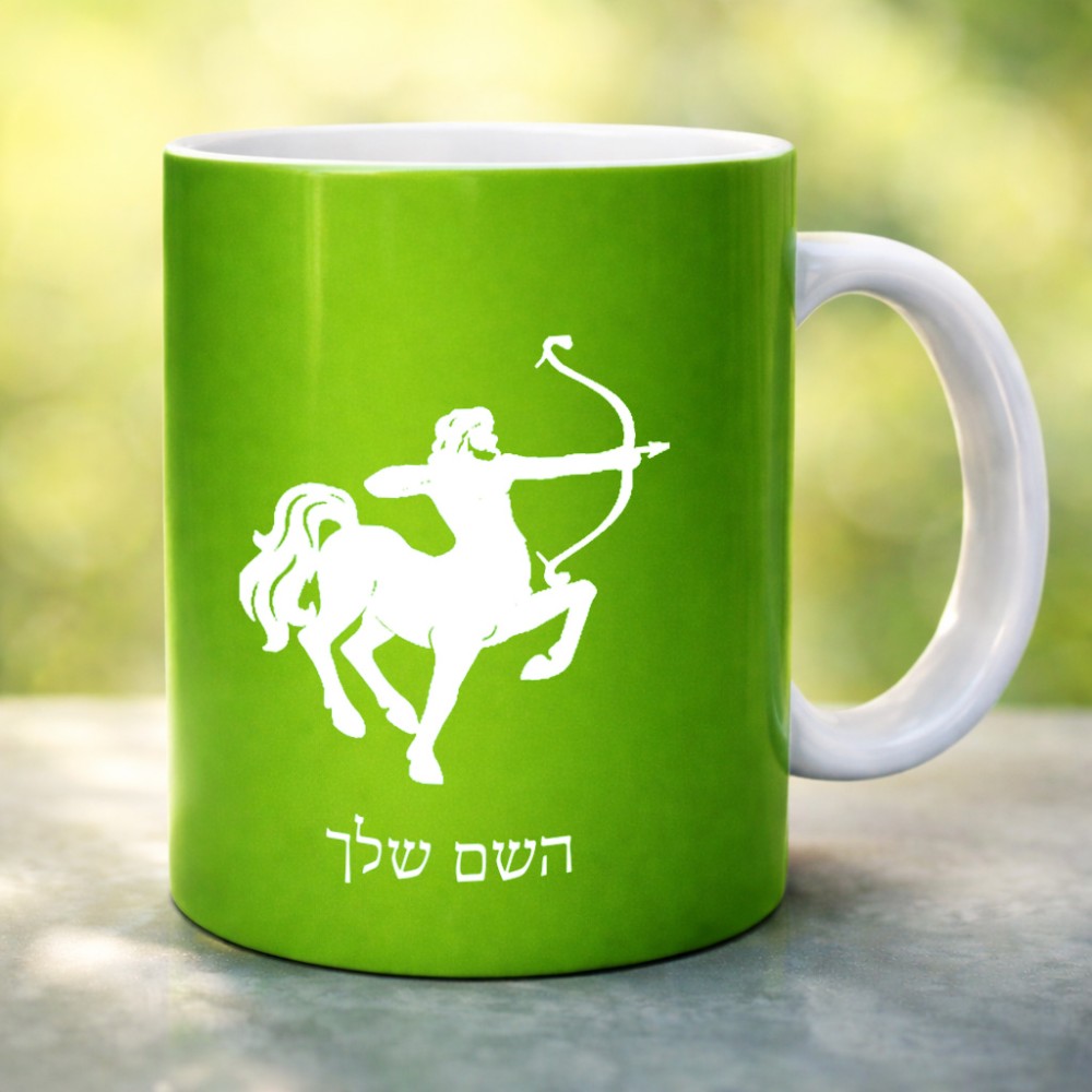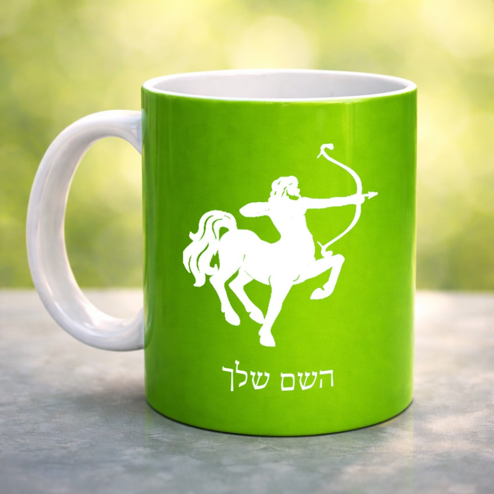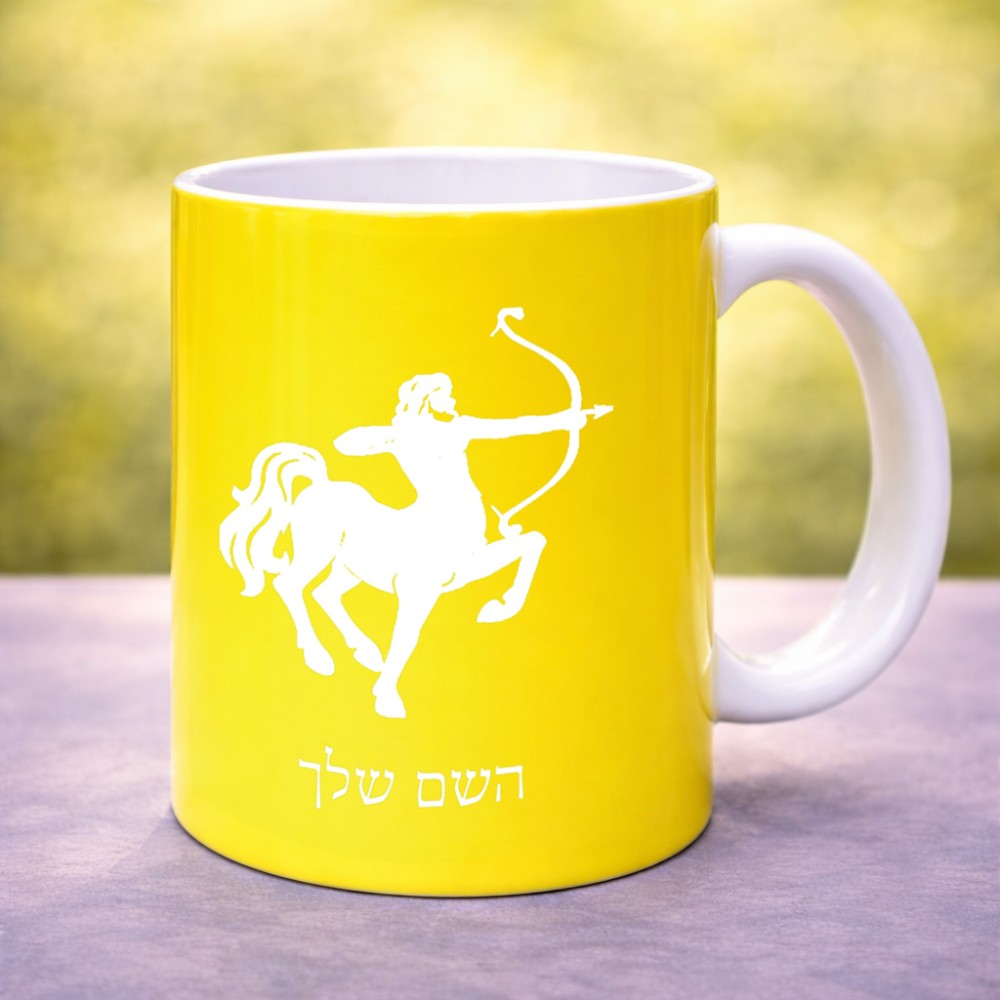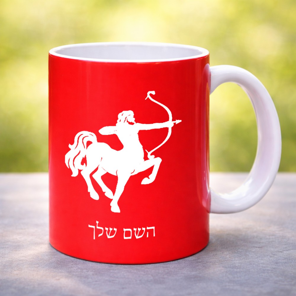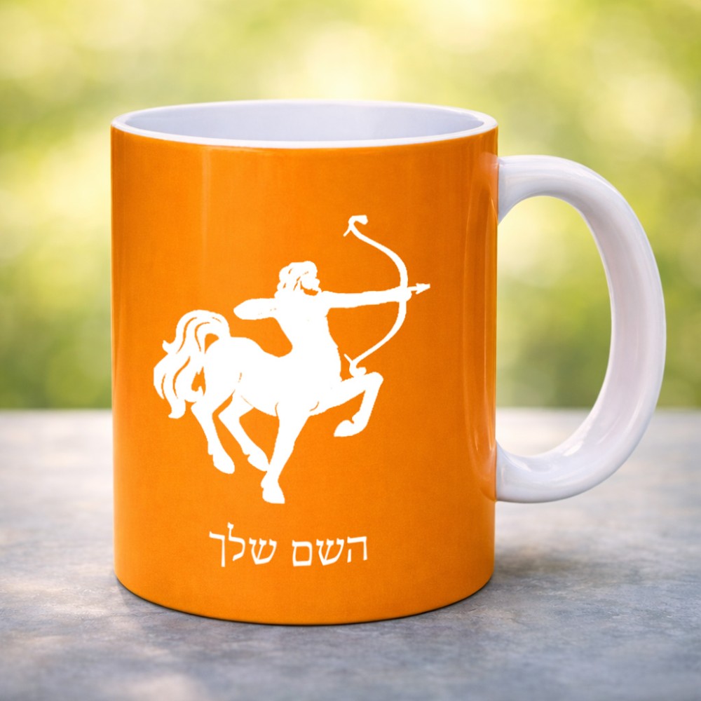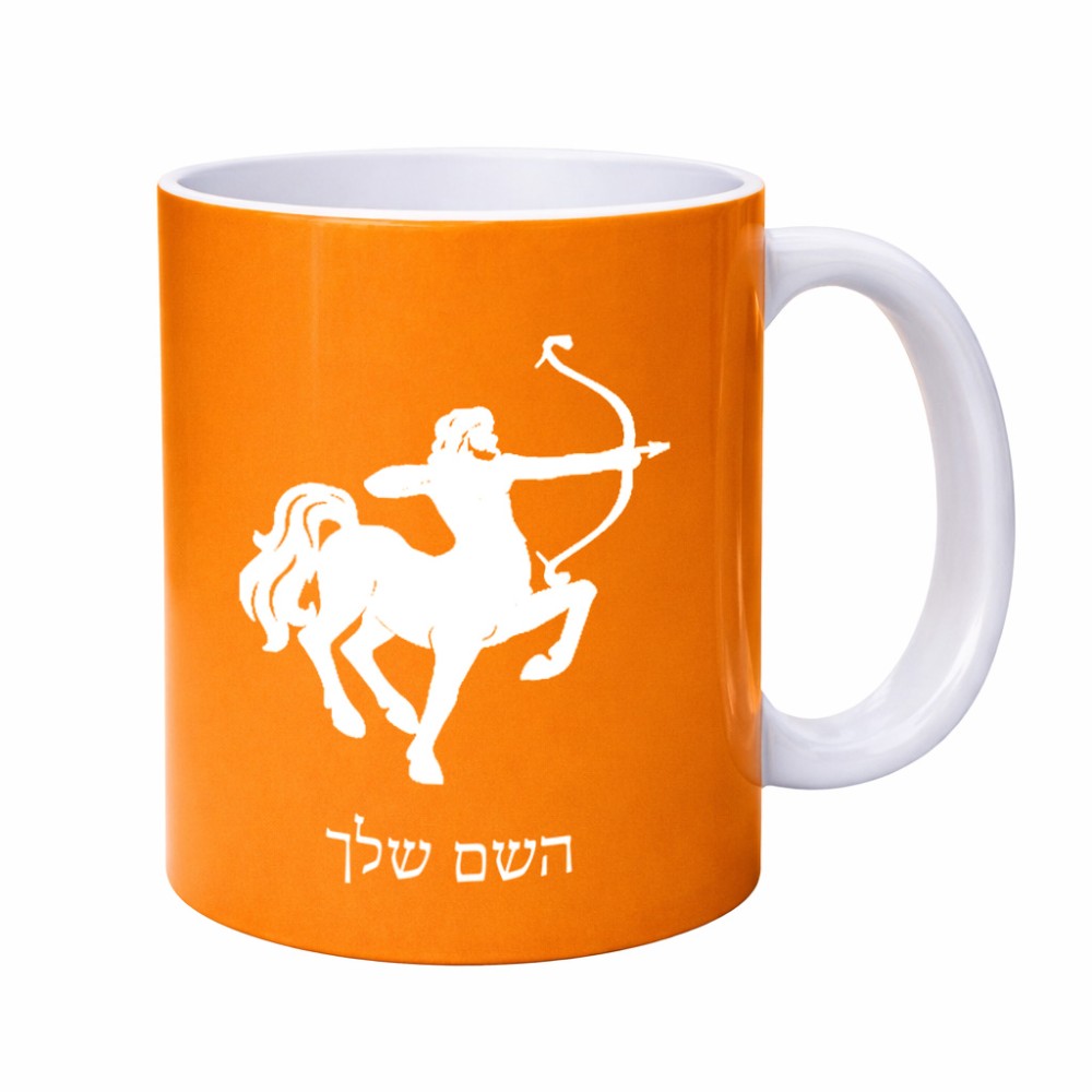 ספל תה \ קפה בעיצוב אישי עם השם שלך בעיצוב מזלות - קשת גדול הספל 325 מ"ל, הספל בעלת ידית לאחיזה יציבה. את השם המבוקש ניתן לציין בהזמנה, אם לא צויין אנחנו ניצור קשר לבירור.