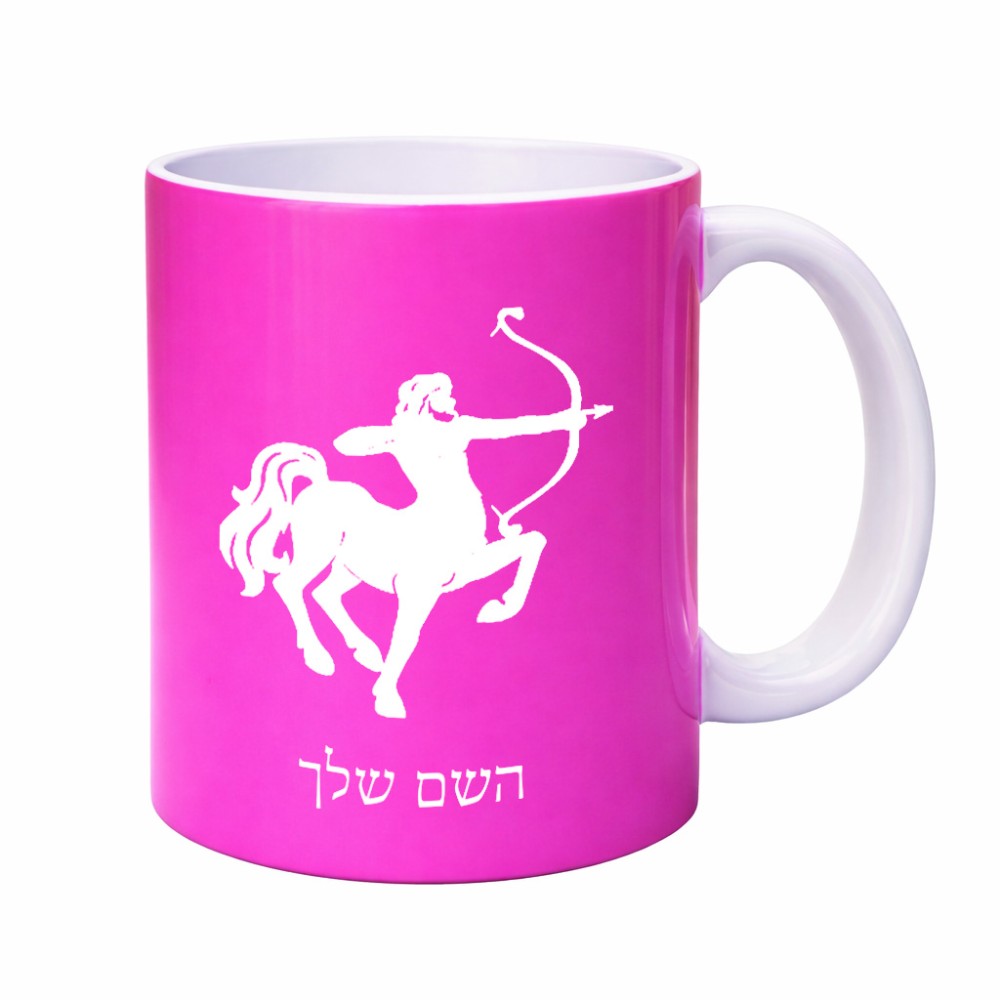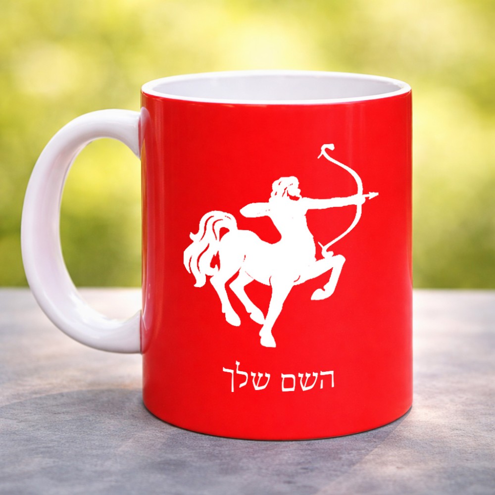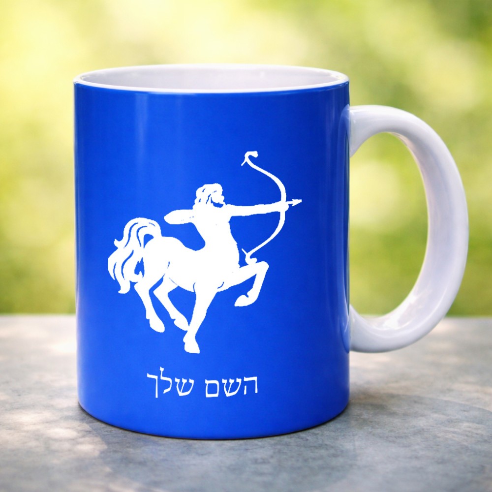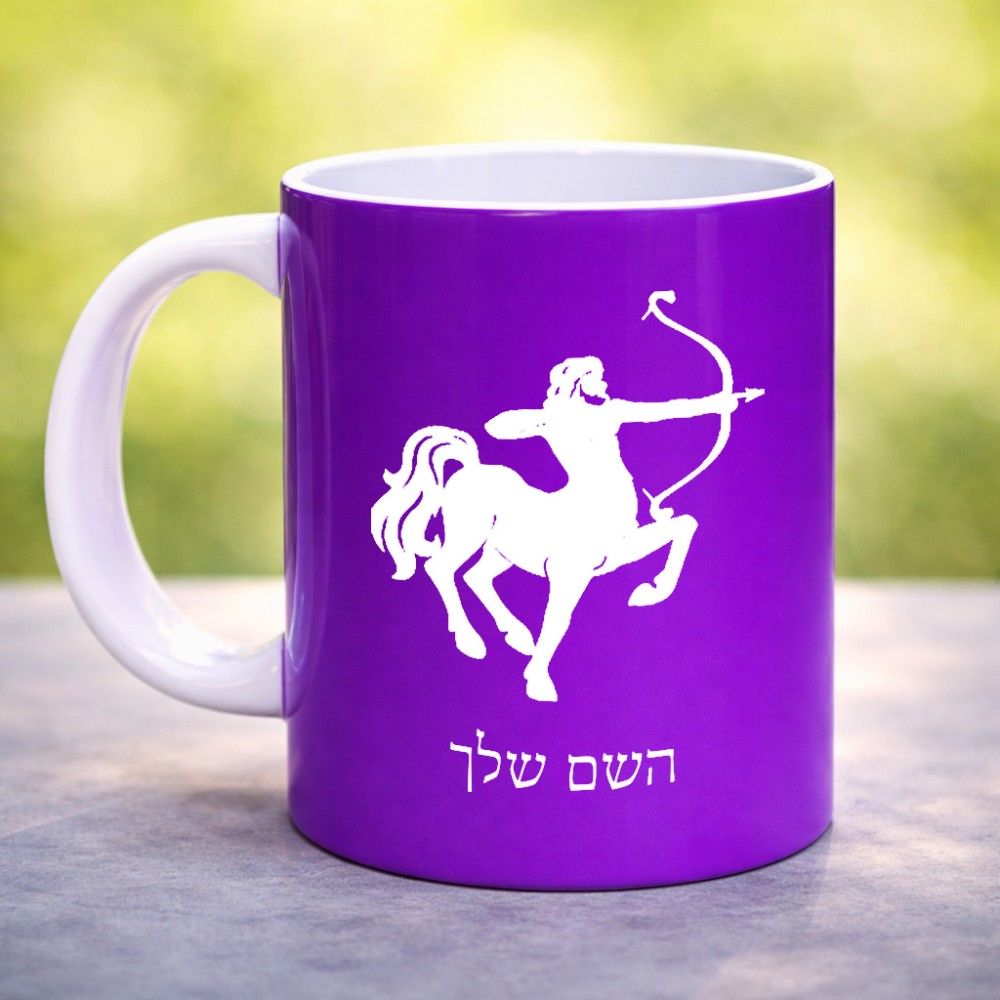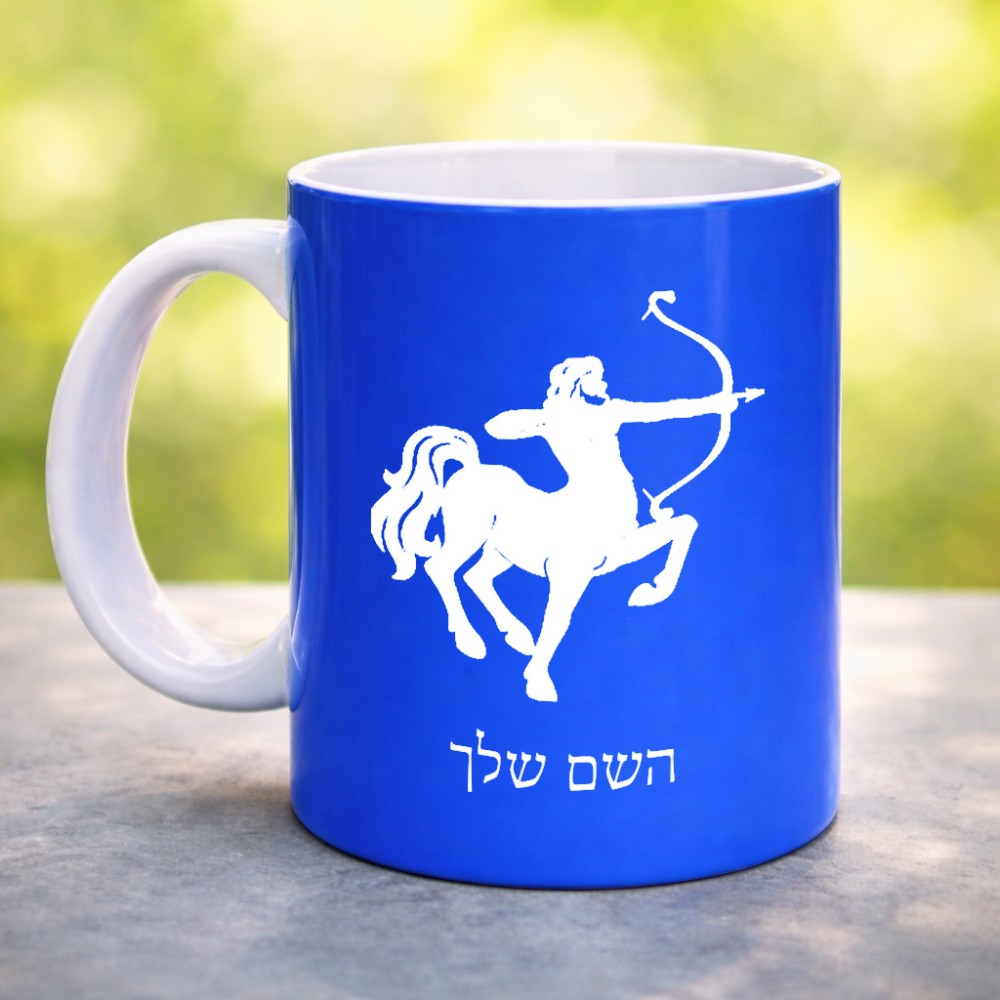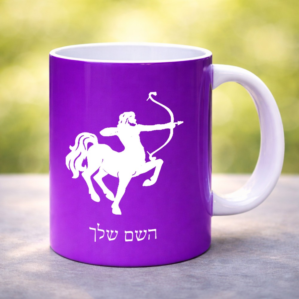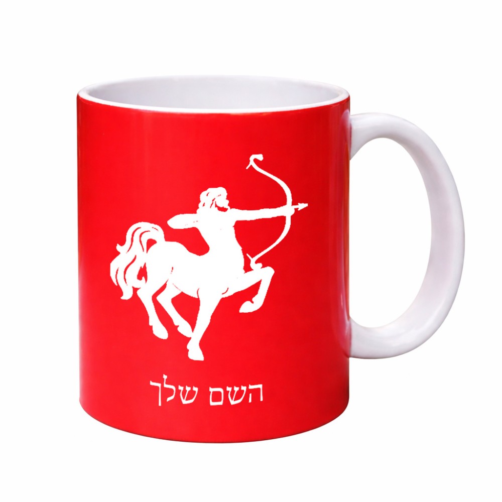 ספל תה \ קפה בעיצוב אישי עם השם שלך בעיצוב מזלות - קשת גדול הספל 325 מ"ל, הספל בעלת ידית לאחיזה יציבה. את השם המבוקש ניתן לציין בהזמנה, אם לא צויין אנחנו ניצור קשר לבירור.
