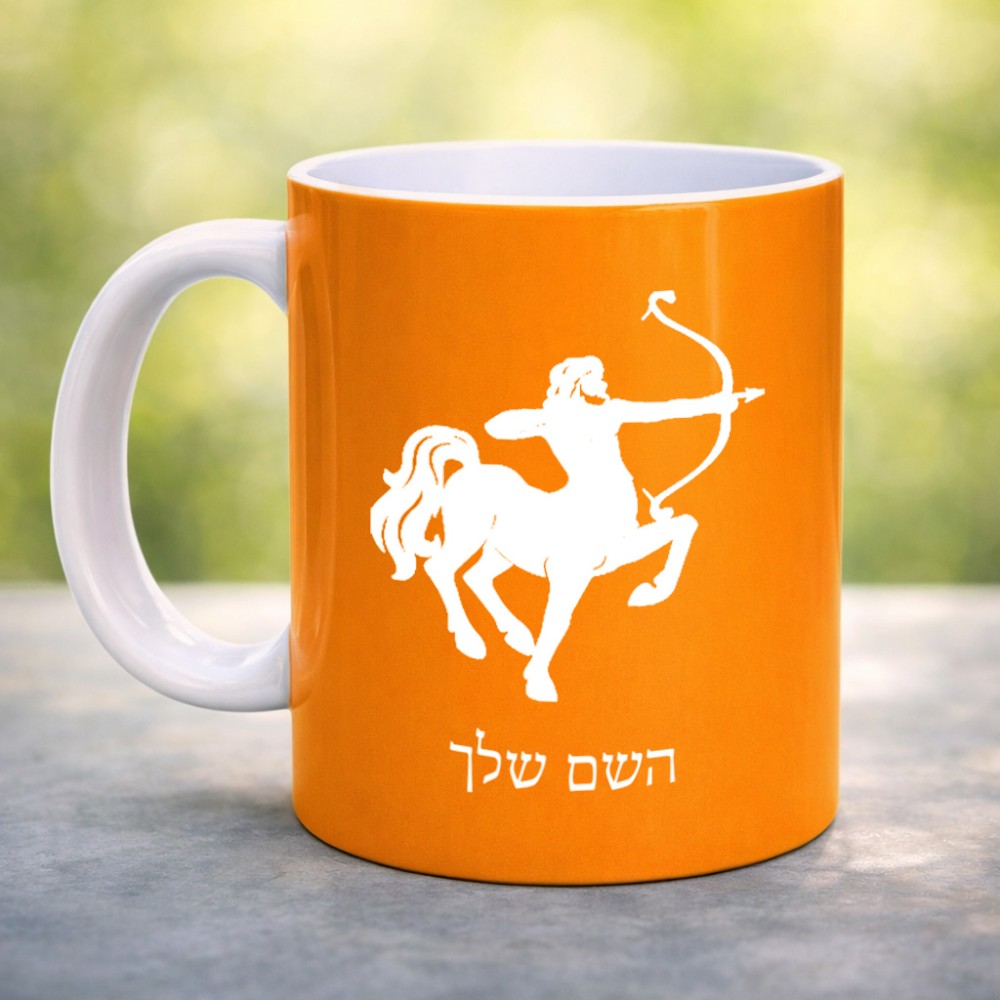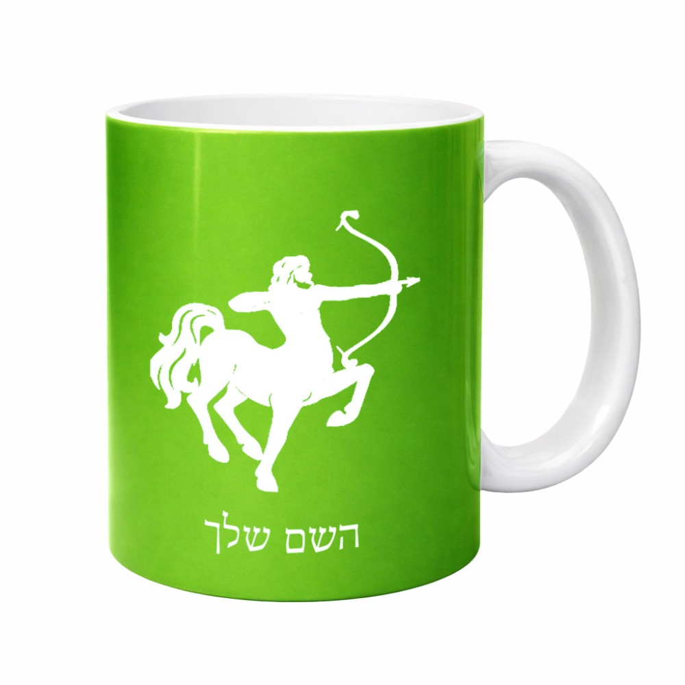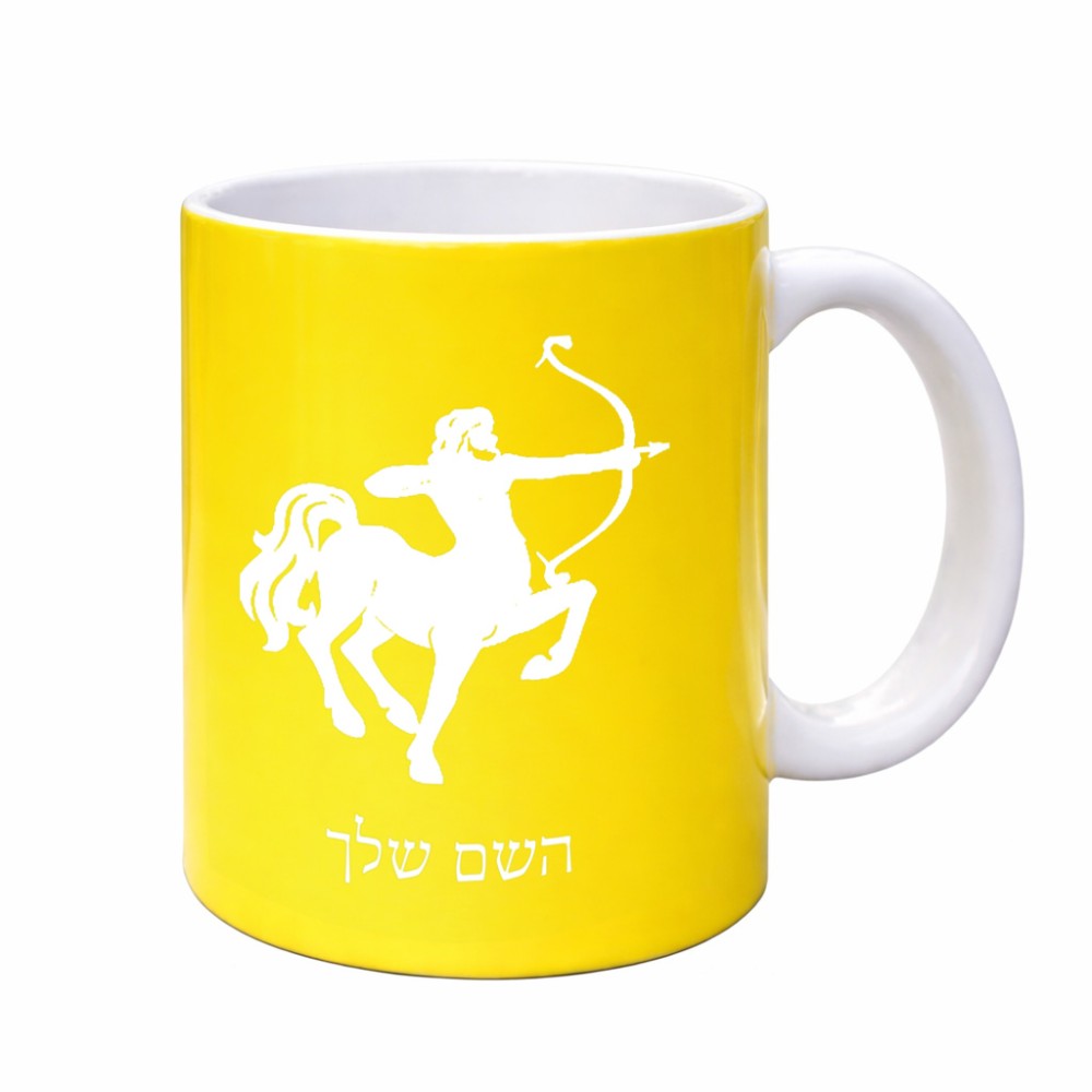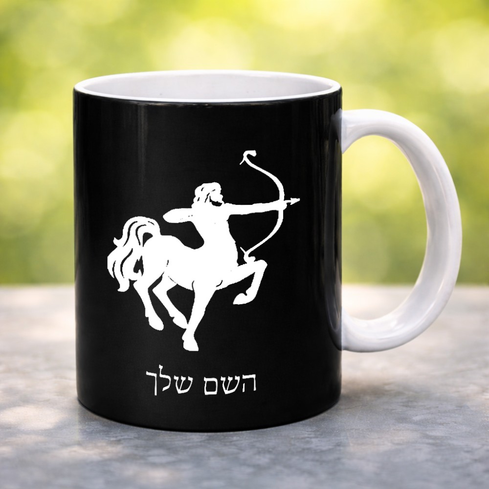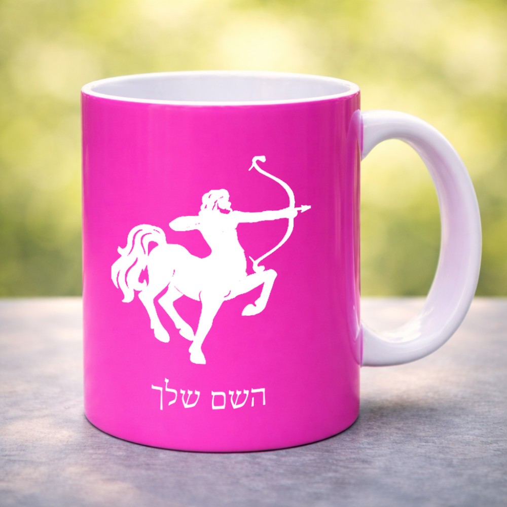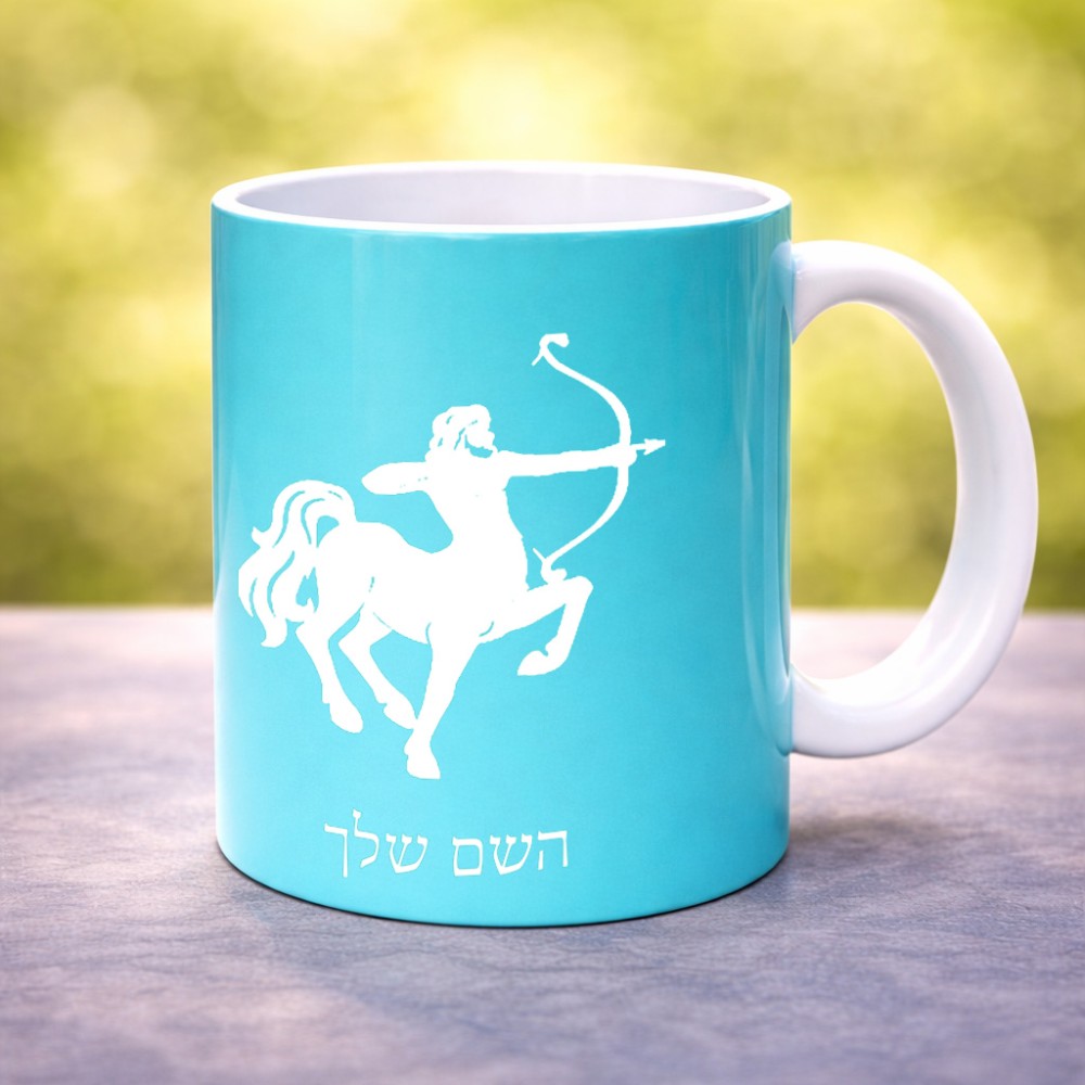 ספל תה \ קפה בעיצוב אישי עם השם שלך בעיצוב מזלות - קשת גדול הספל 325 מ"ל, הספל בעלת ידית לאחיזה יציבה. את השם המבוקש ניתן לציין בהזמנה, אם לא צויין אנחנו ניצור קשר לבירור.