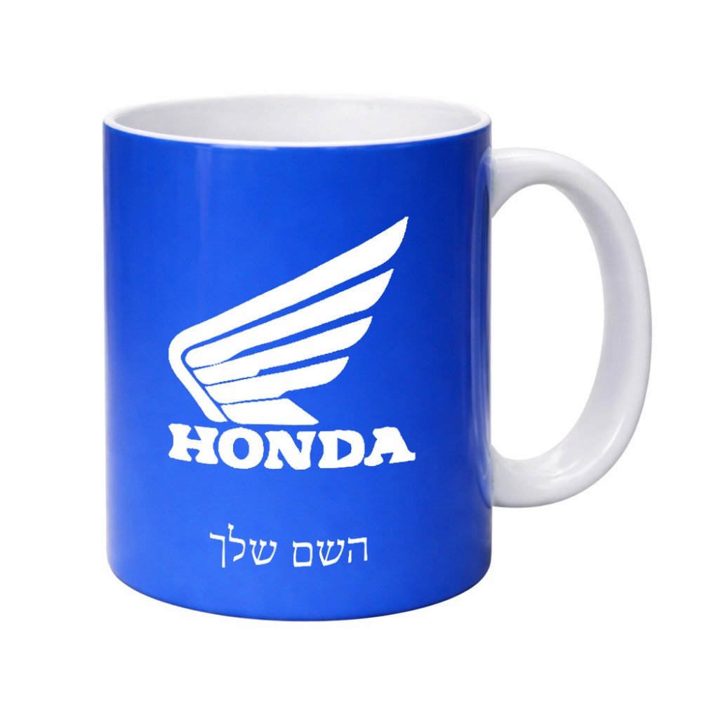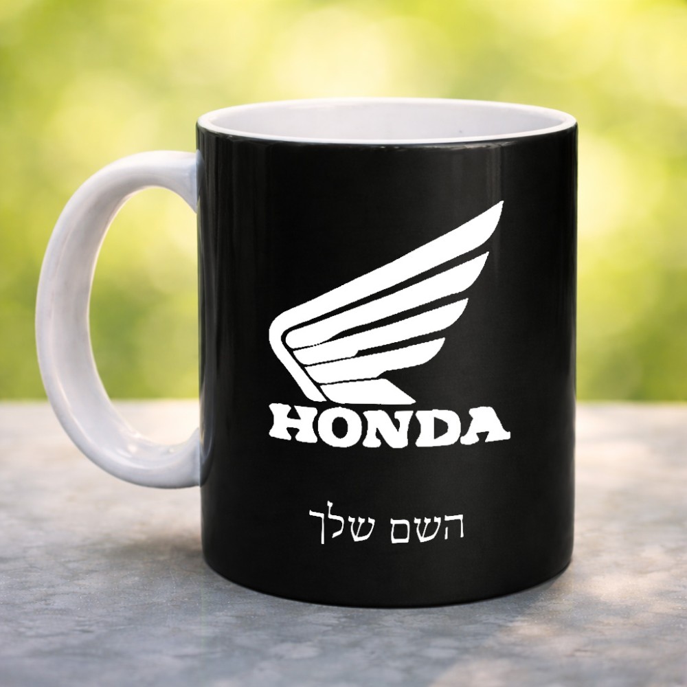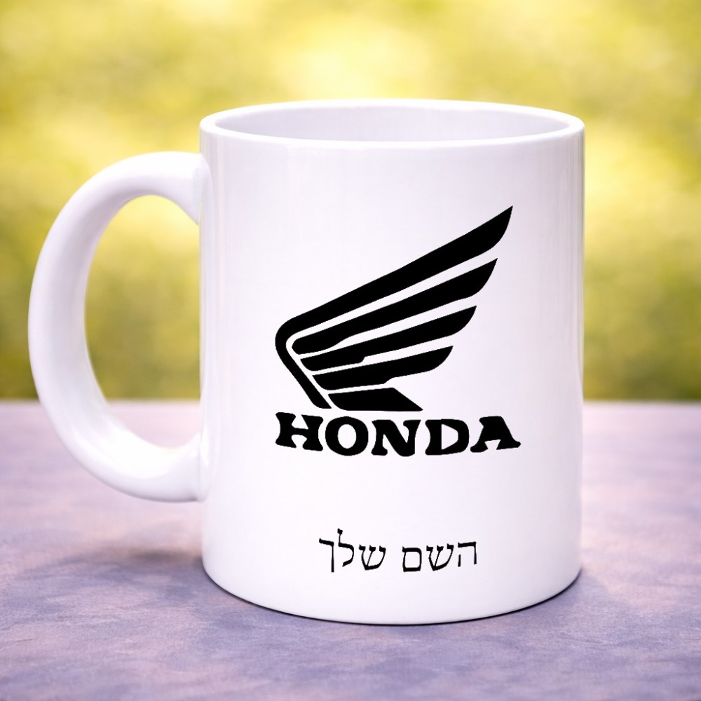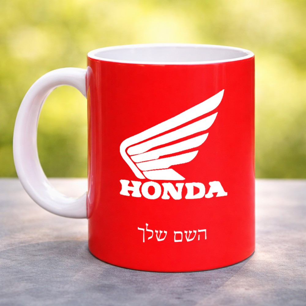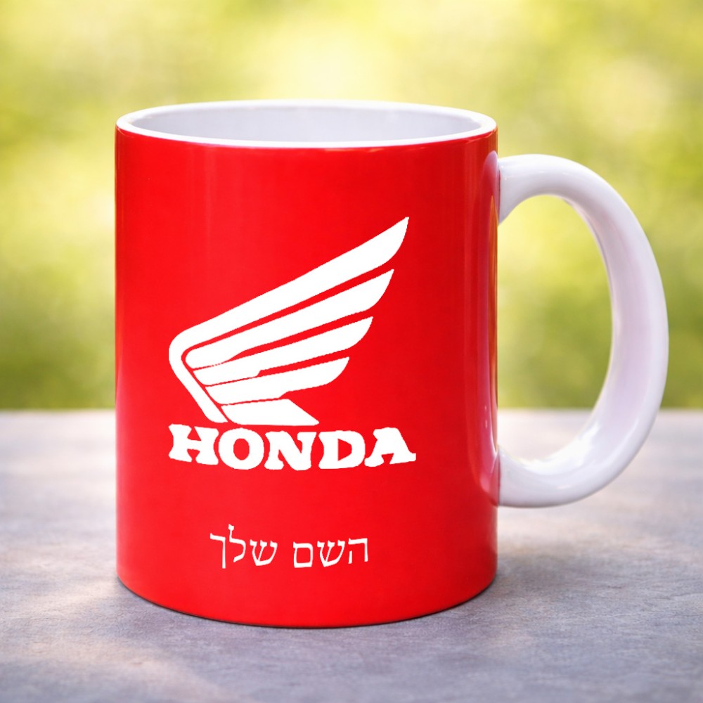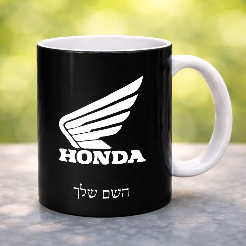 ספל תה \ קפה בעיצוב אישי עם השם שלך בעיצוב הונדה גדול הספל 325 מ"ל, הספל בעלת ידית לאחיזה יציבה. את השם המבוקש ניתן לציין בהזמנה, אם לא צויין אנחנו ניצור קשר לבירור.