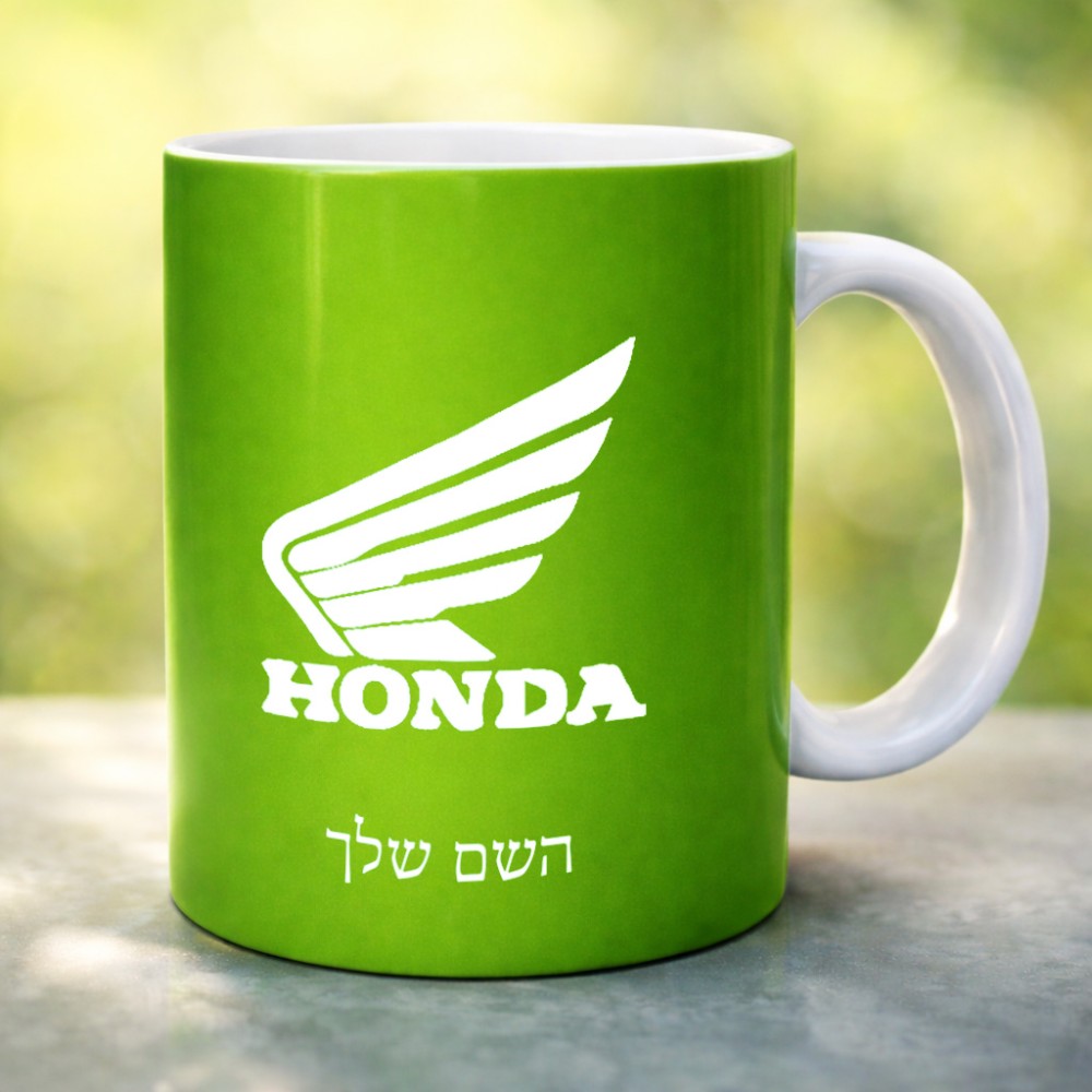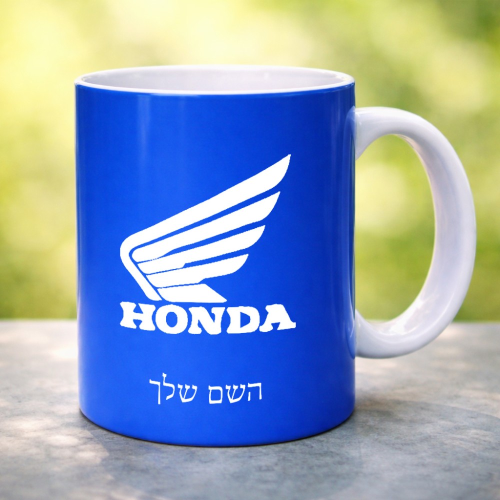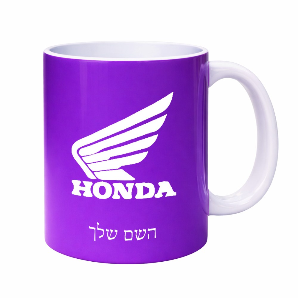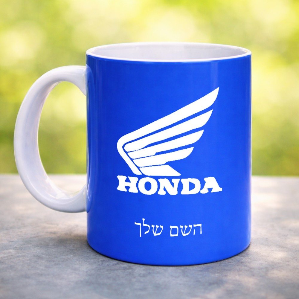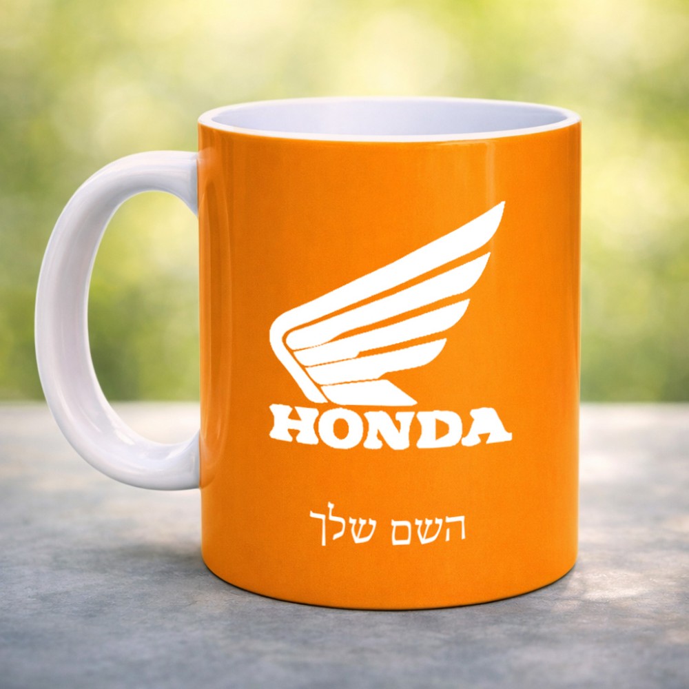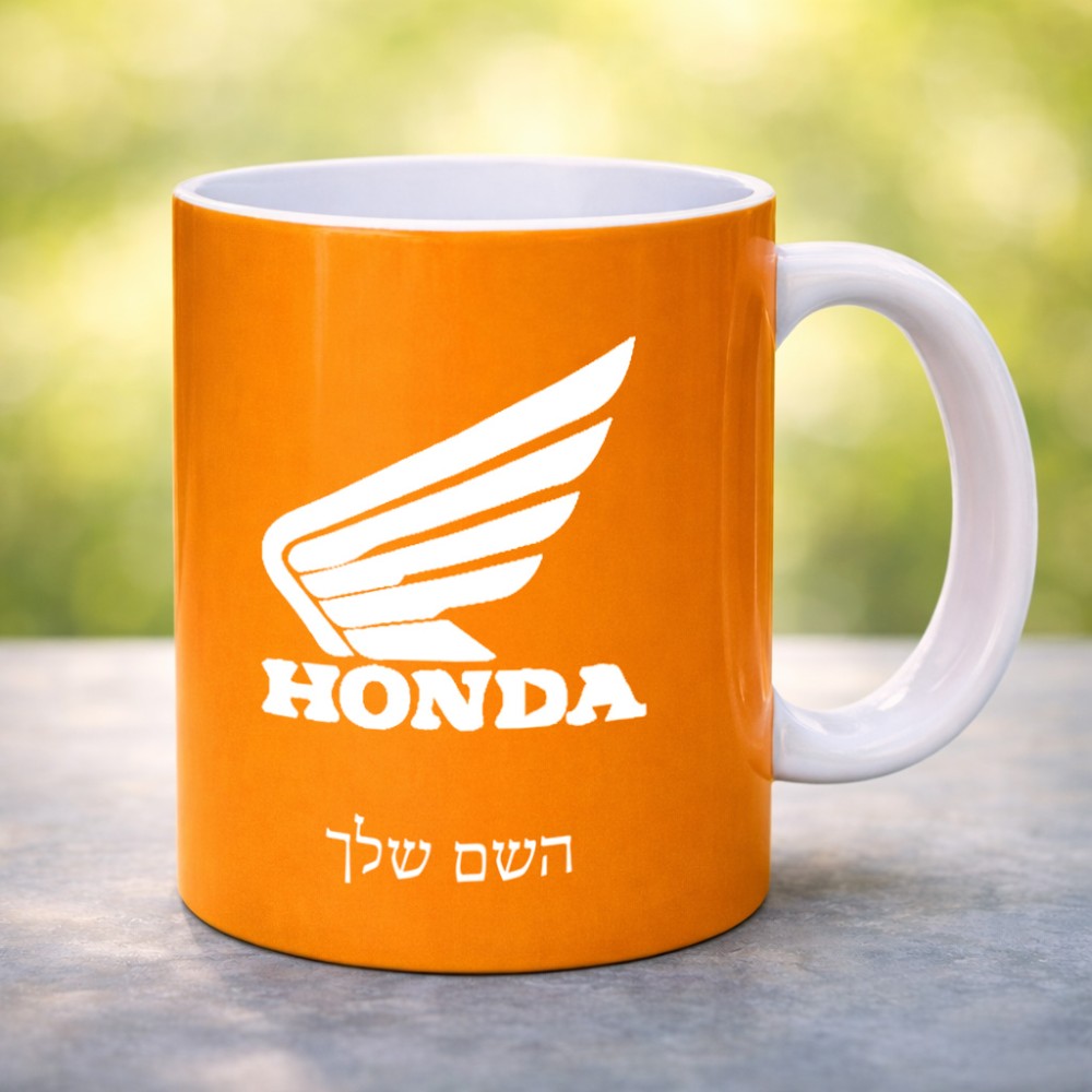 ספל תה \ קפה בעיצוב אישי עם השם שלך בעיצוב הונדה גדול הספל 325 מ"ל, הספל בעלת ידית לאחיזה יציבה. את השם המבוקש ניתן לציין בהזמנה, אם לא צויין אנחנו ניצור קשר לבירור.