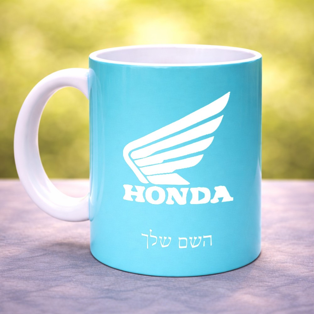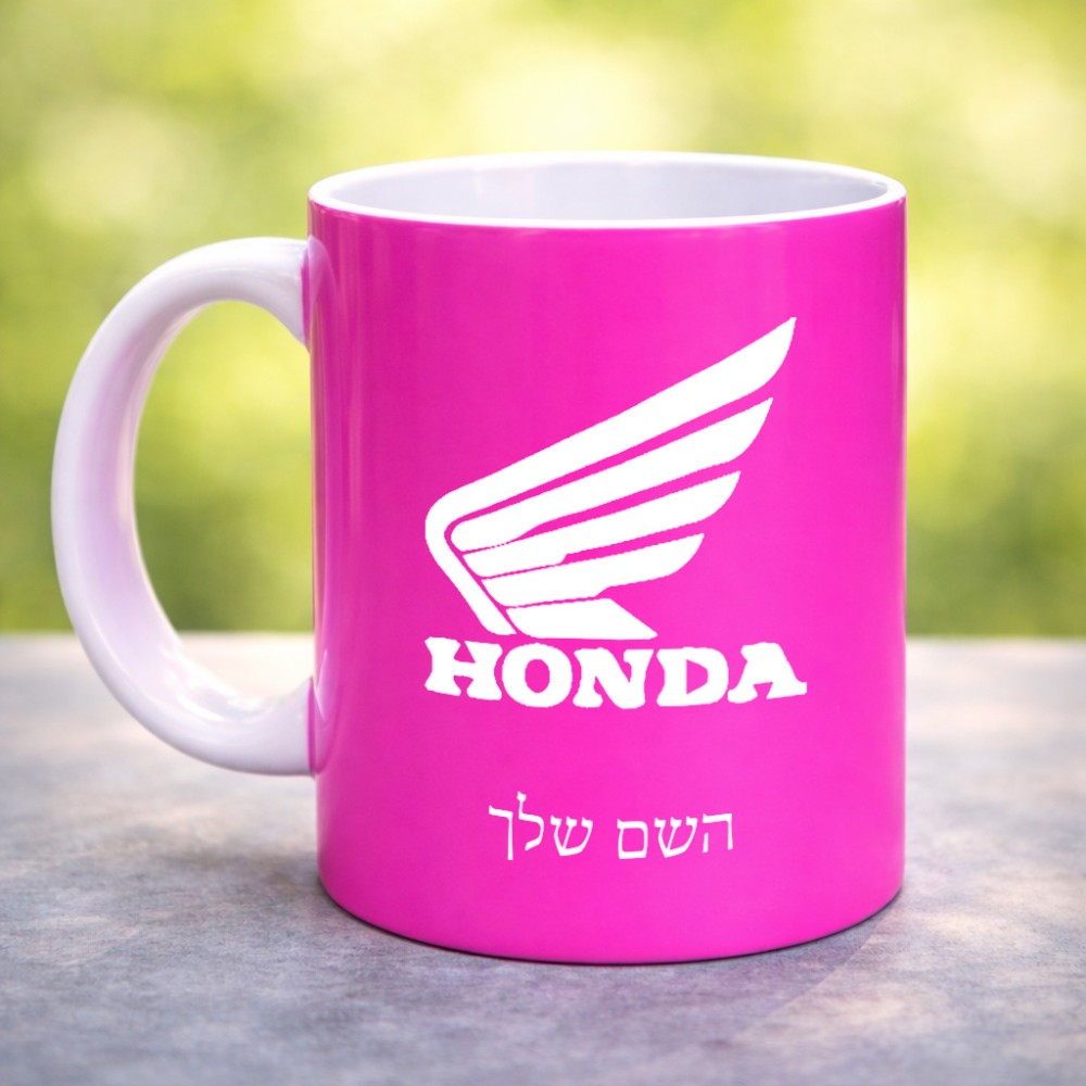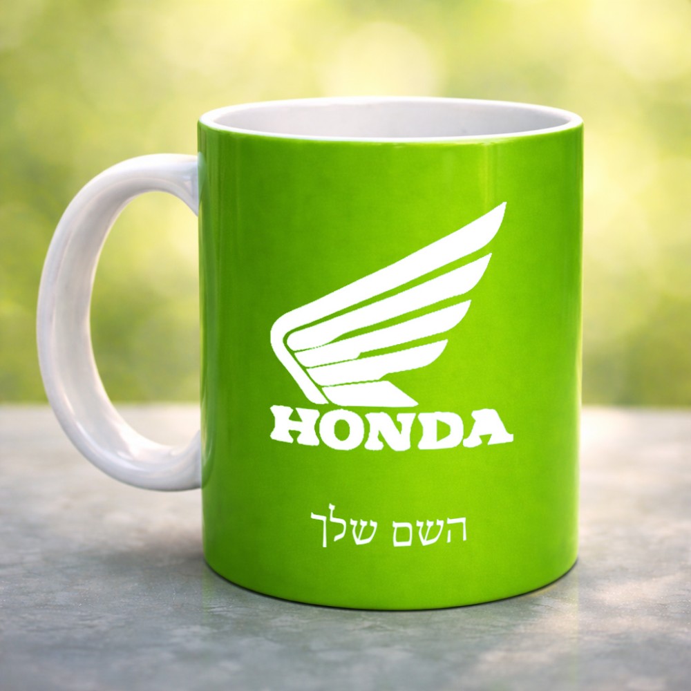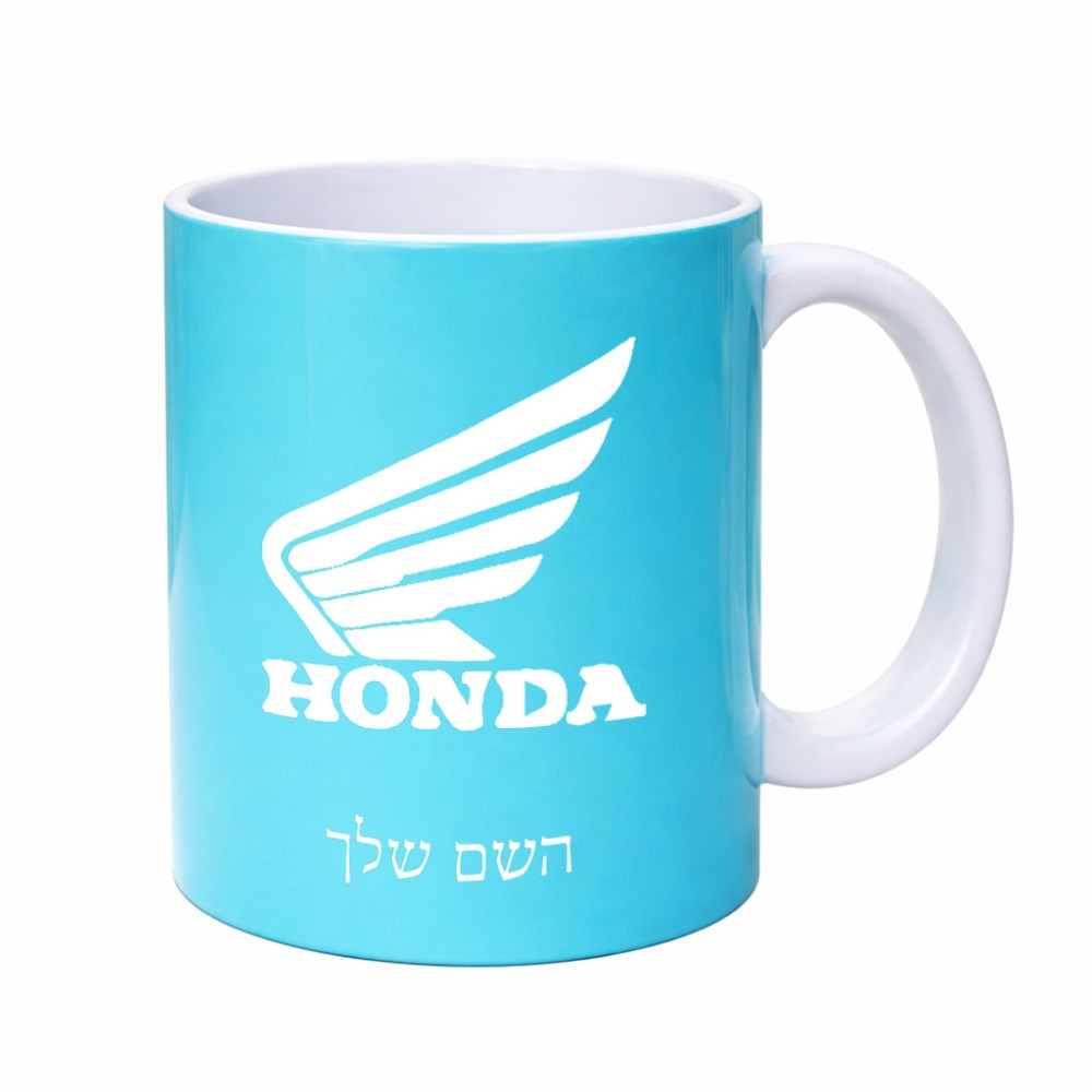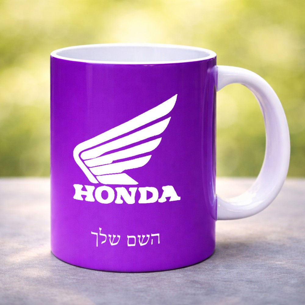 ספל תה \ קפה בעיצוב אישי עם השם שלך בעיצוב הונדה גדול הספל 325 מ"ל, הספל בעלת ידית לאחיזה יציבה. את השם המבוקש ניתן לציין בהזמנה, אם לא צויין אנחנו ניצור קשר לבירור.