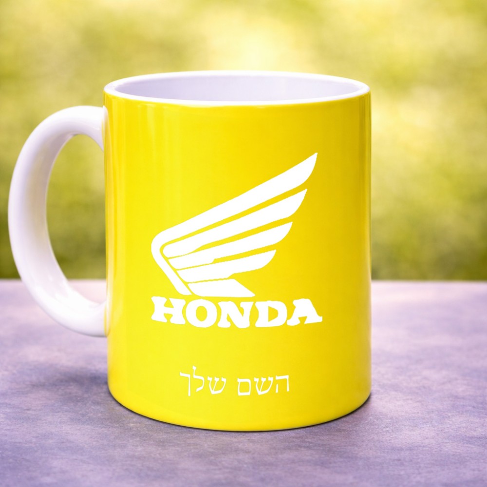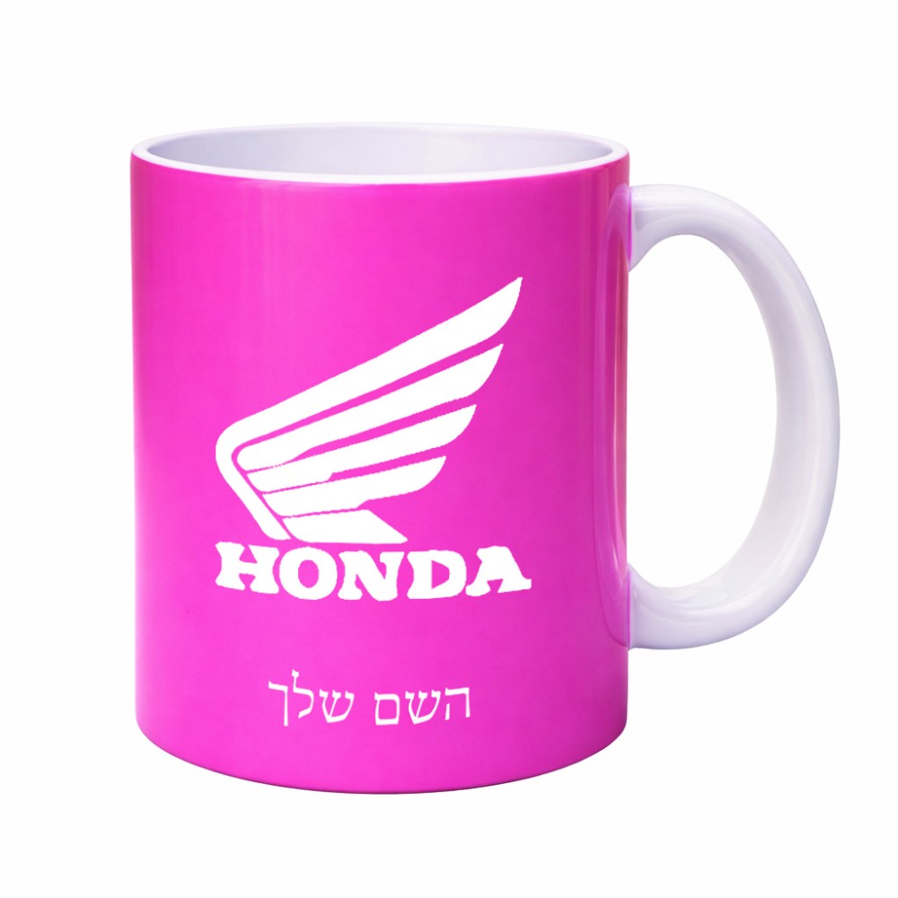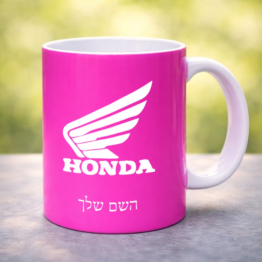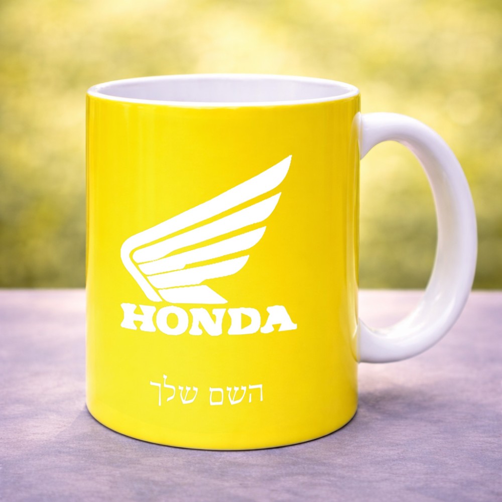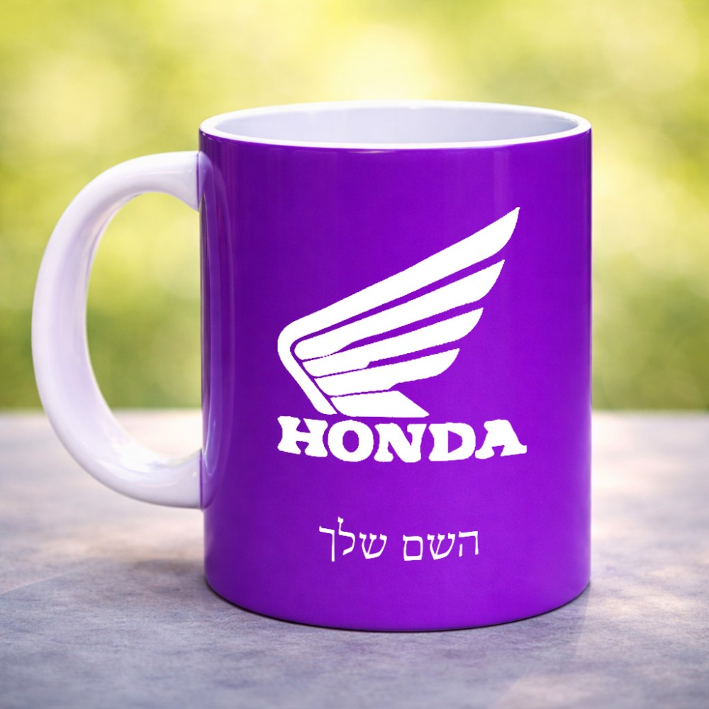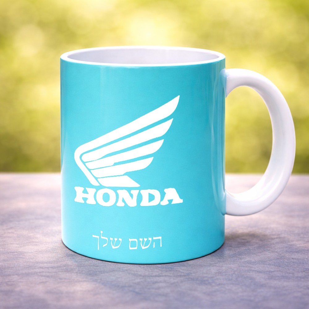 ספל תה \ קפה בעיצוב אישי עם השם שלך בעיצוב הונדה גדול הספל 325 מ"ל, הספל בעלת ידית לאחיזה יציבה. את השם המבוקש ניתן לציין בהזמנה, אם לא צויין אנחנו ניצור קשר לבירור.