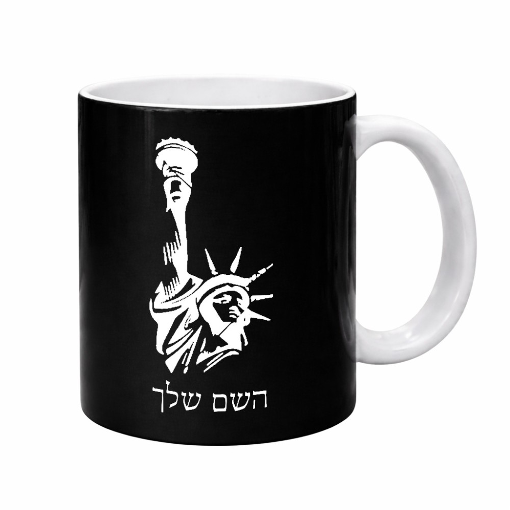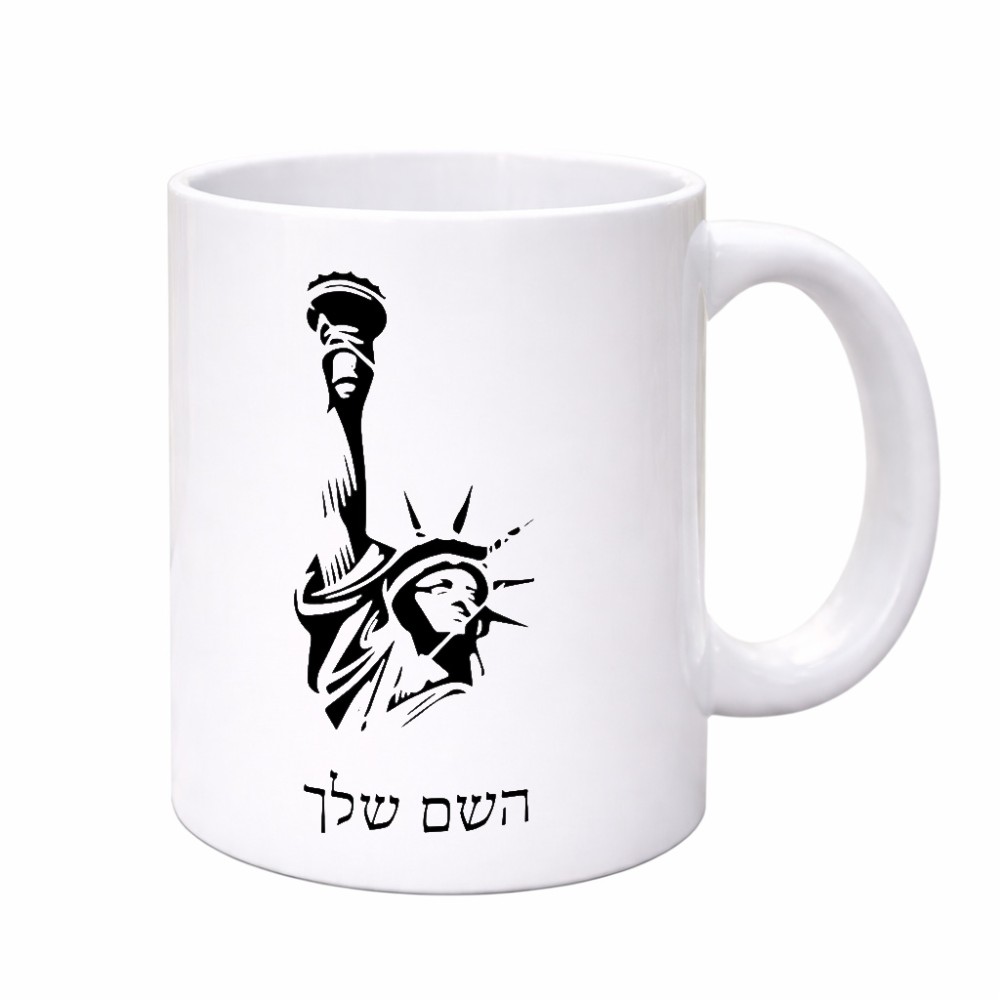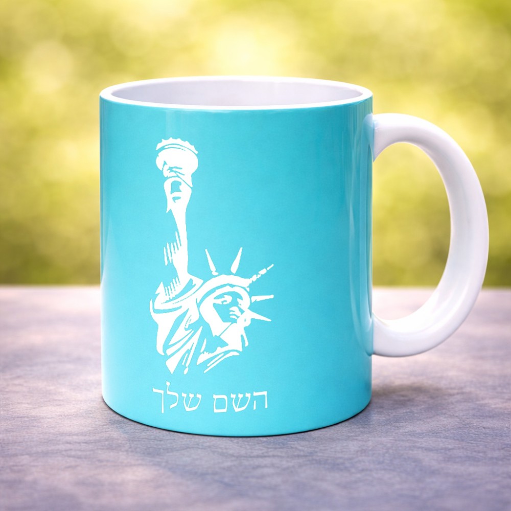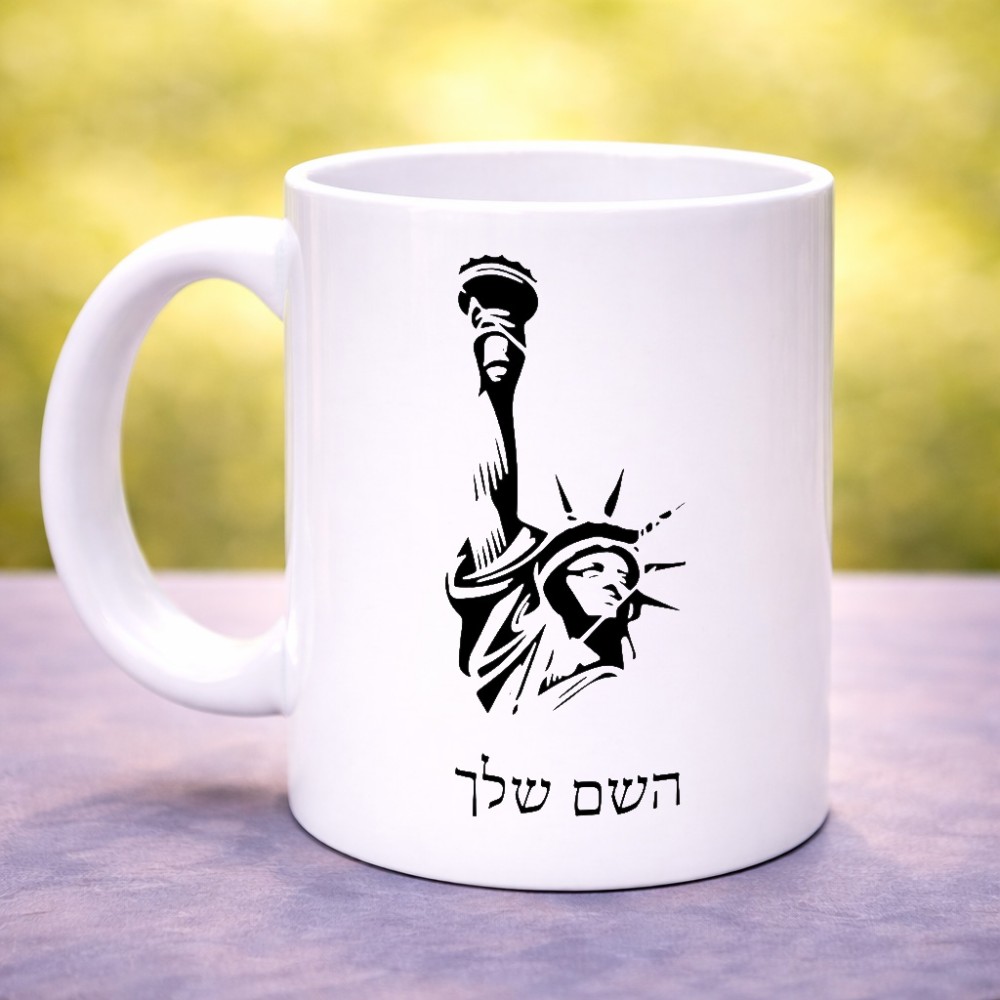 ספל תה \ קפה בעיצוב אישי עם השם שלך בעיצוב פסל החירות גודל הספל 325 מ"ל