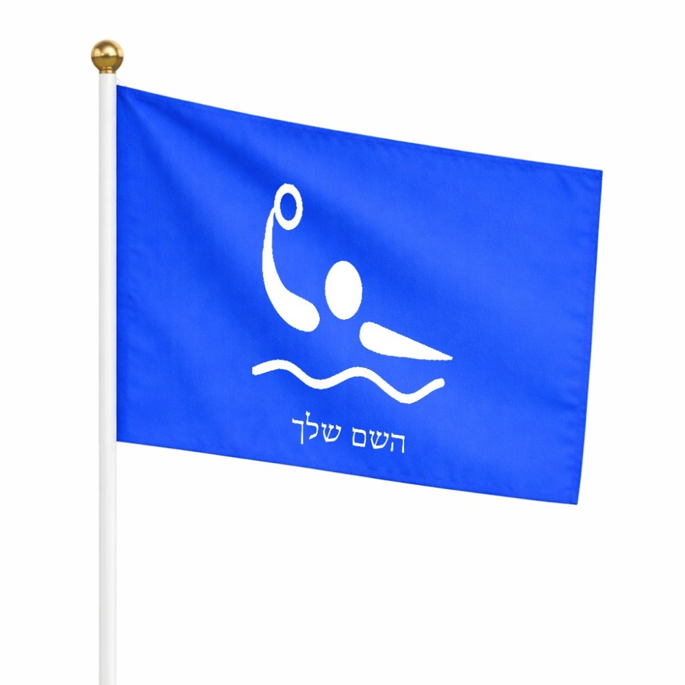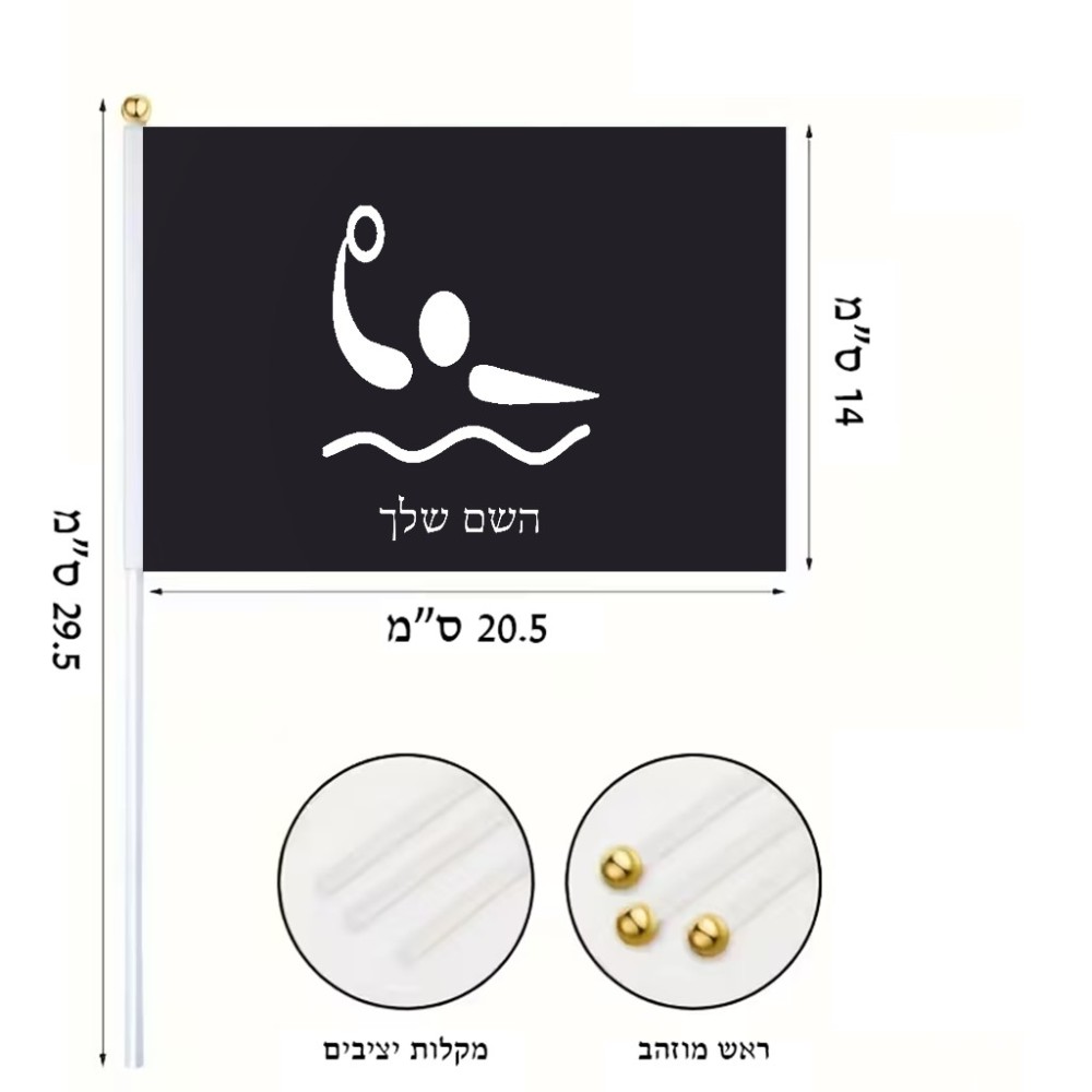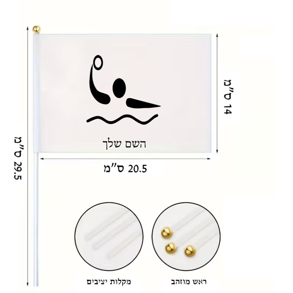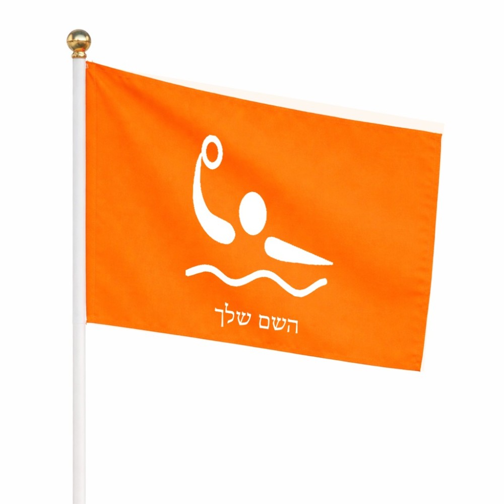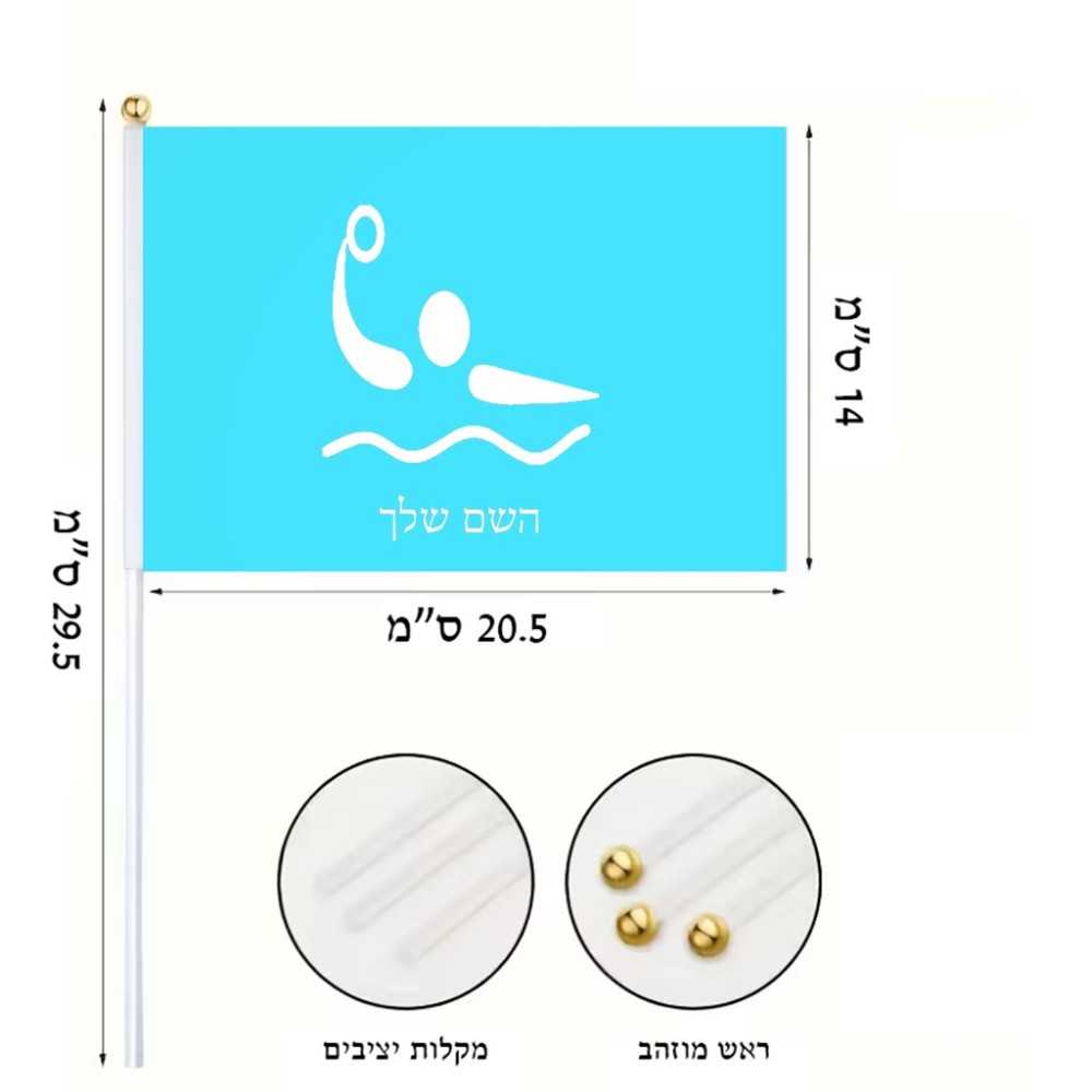 דיגלון בעיצוב אישי עם השם שלך בעיצוב כדור מים אולימפי גודל הדיגלון 20.5 × 14 ס"מ, ההדפסה מתבצעת בשני צידי הדגל, את השם המבוקש ניתן לציין בהזמנה, אם לא צויין אנחנו ניצור קשר לבירור.