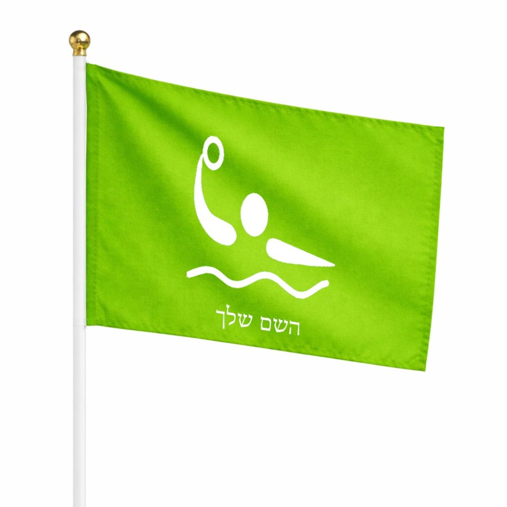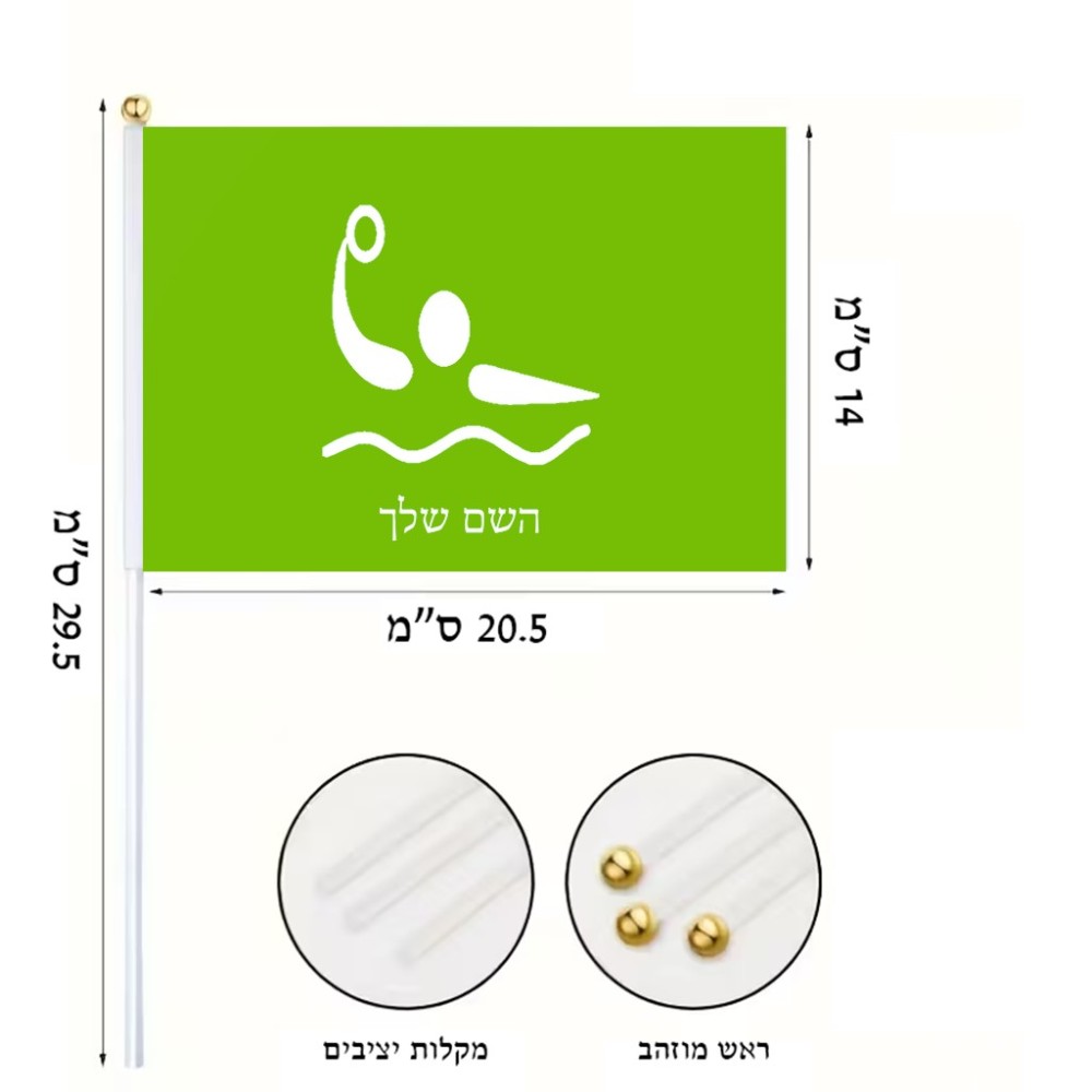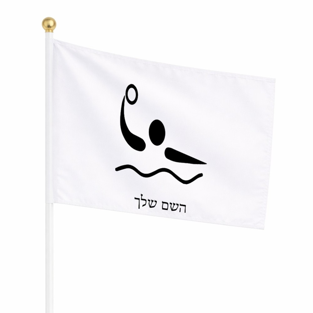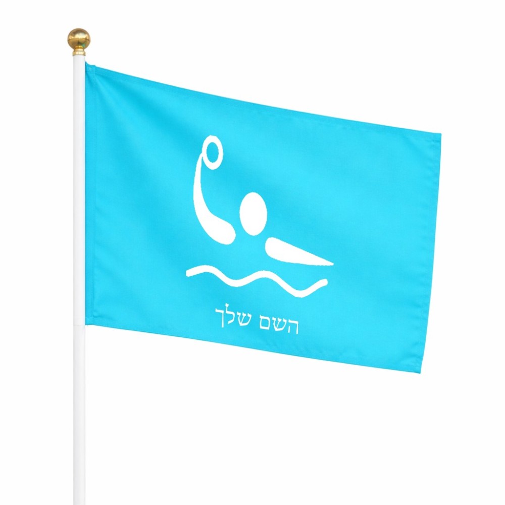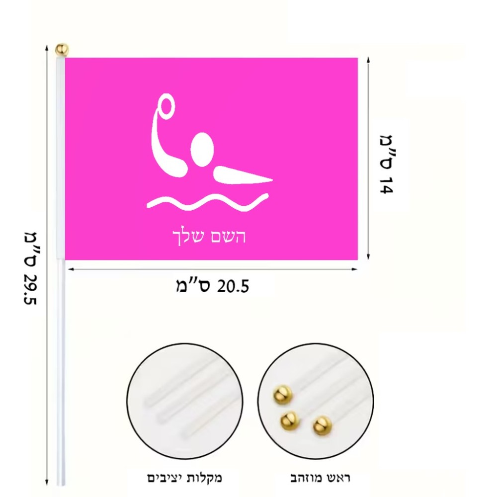 דיגלון בעיצוב אישי עם השם שלך בעיצוב כדור מים אולימפי גודל הדיגלון 20.5 × 14 ס"מ, ההדפסה מתבצעת בשני צידי הדגל, את השם המבוקש ניתן לציין בהזמנה, אם לא צויין אנחנו ניצור קשר לבירור.