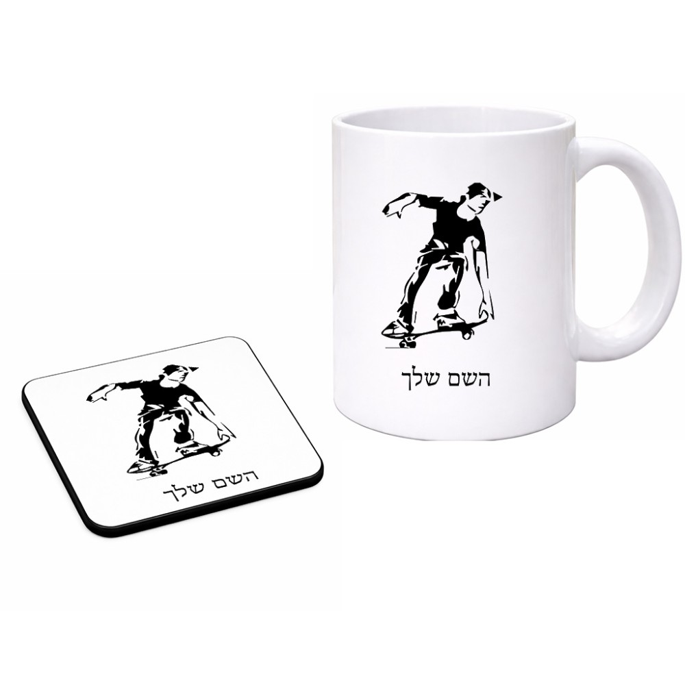 ספל תה \ קפה + תחתית מרובעת בעיצוב אישי עם השם שלך בעיצוב ילד סקייטבורד גודל הספל 325 מ"ל, הספל בעלת ידית לאחיזה יציבה, תחתית מעוצבת בגודל 9 × 9 ס"מ. את השם המבוקש ניתן לציין בהזמנה, אם לא צויין אנחנו ניצור קשר לבירור.
