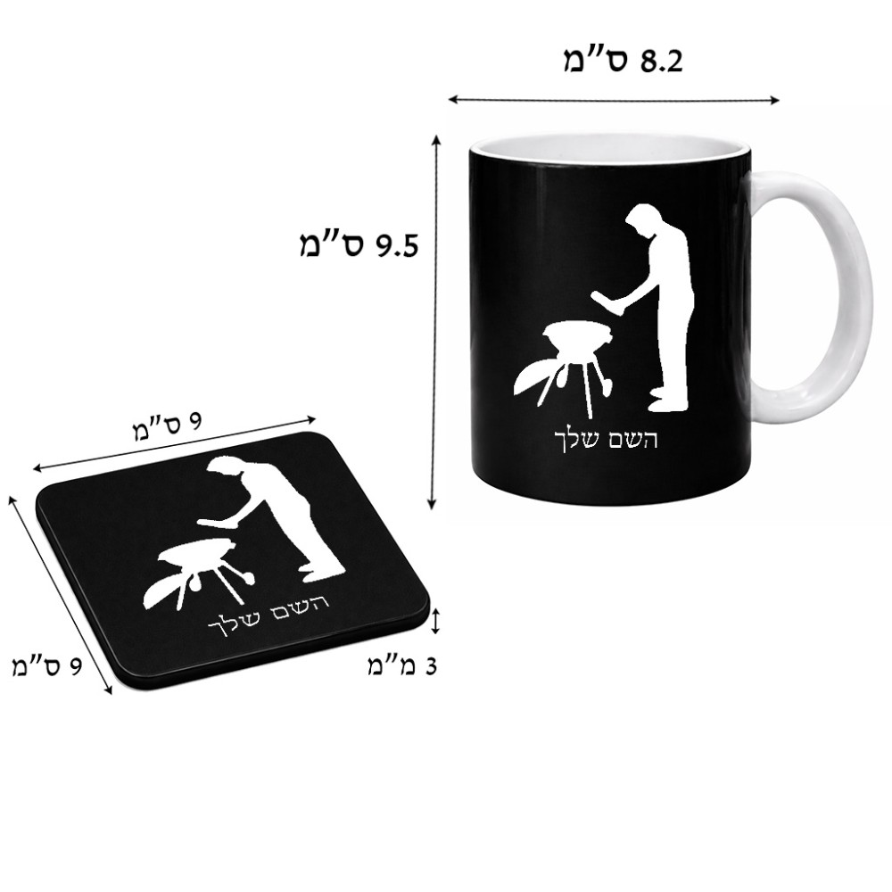 ספל תה \ קפה + תחתית מרובעת בעיצוב אישי עם השם שלך בעיצוב גריל ברביקיו גודל הספל 325 מ"ל, הספל בעלת ידית לאחיזה יציבה, תחתית מעוצבת בגודל 9 × 9 ס"מ. את השם המבוקש ניתן לציין בהזמנה, אם לא צויין אנחנו ניצור קשר לבירור.