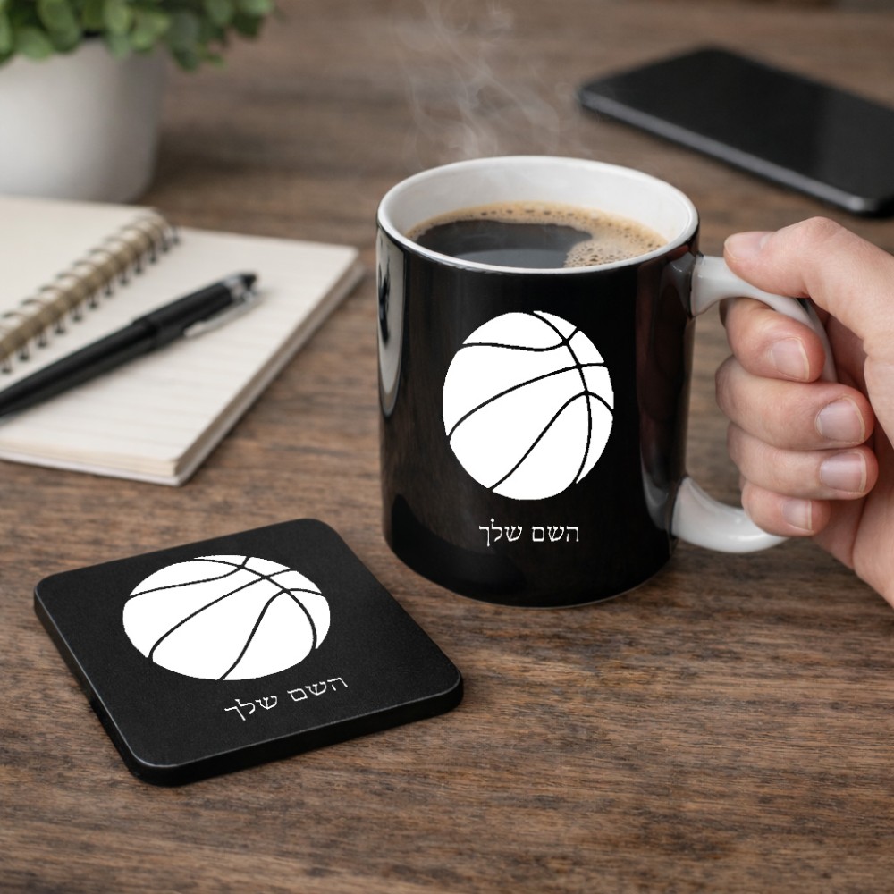 ספל תה \ קפה + תחתית מרובעת בעיצוב אישי עם השם שלך בעיצוב כדורסל גודל הספל 325 מ"ל, הספל בעלת ידית לאחיזה יציבה, תחתית מעוצבת בגודל 9 × 9 ס"מ. את השם המבוקש ניתן לציין בהזמנה, אם לא צויין אנחנו ניצור קשר לבירור.