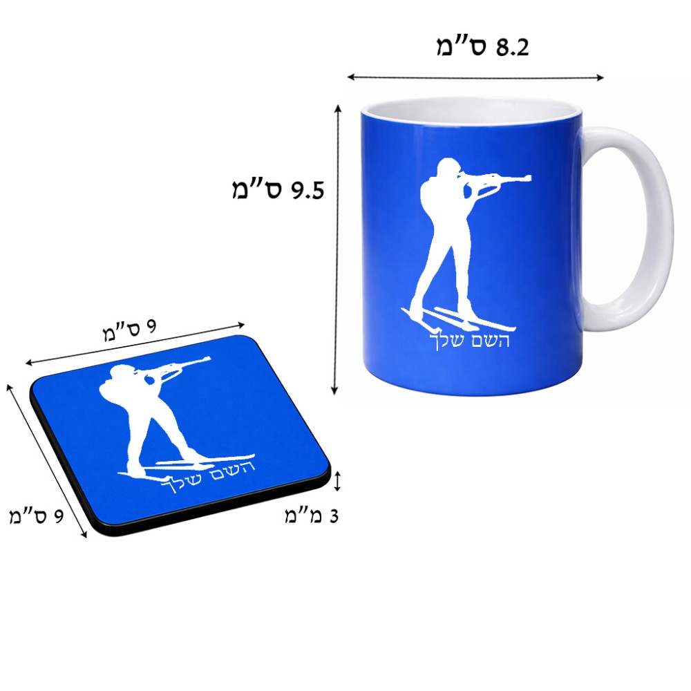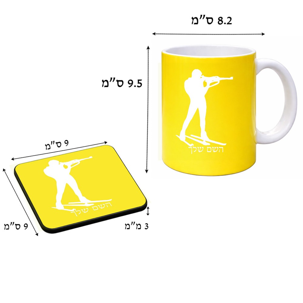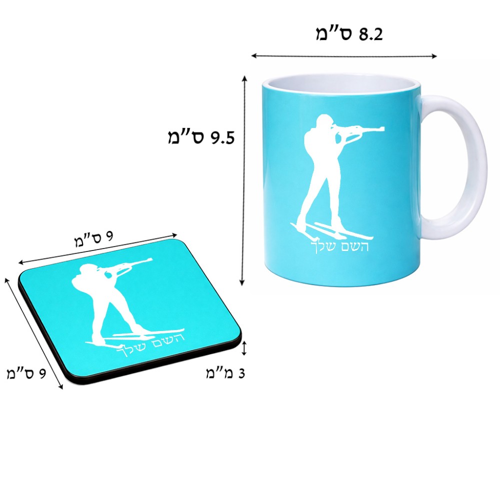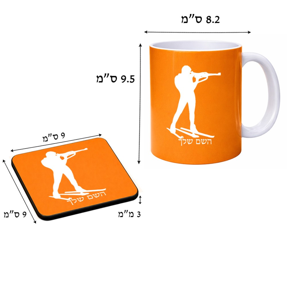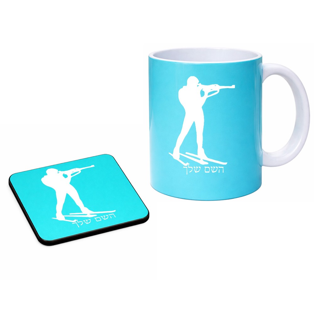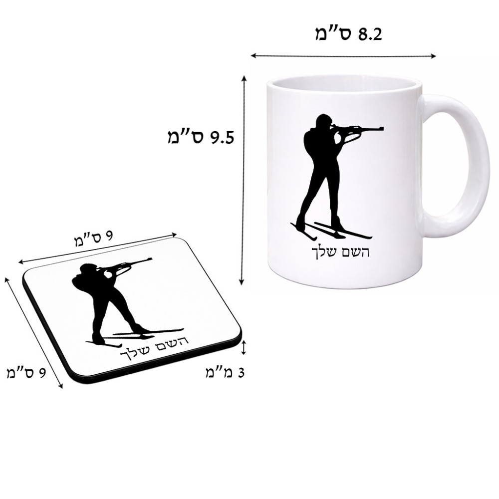 ספל תה \ קפה + תחתית מרובעת בעיצוב אישי עם השם שלך בעיצוב ביאתלון גודל הספל 325 מ"ל, הספל בעלת ידית לאחיזה יציבה, תחתית מעוצבת בגודל 9 × 9 ס"מ. את השם המבוקש ניתן לציין בהזמנה, אם לא צויין אנחנו ניצור קשר לבירור.