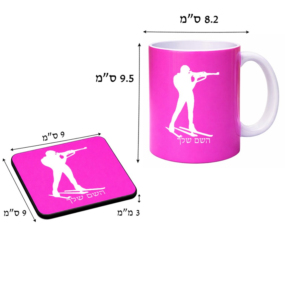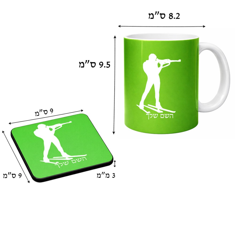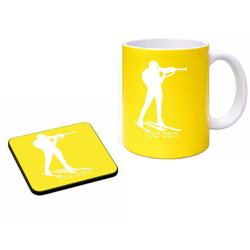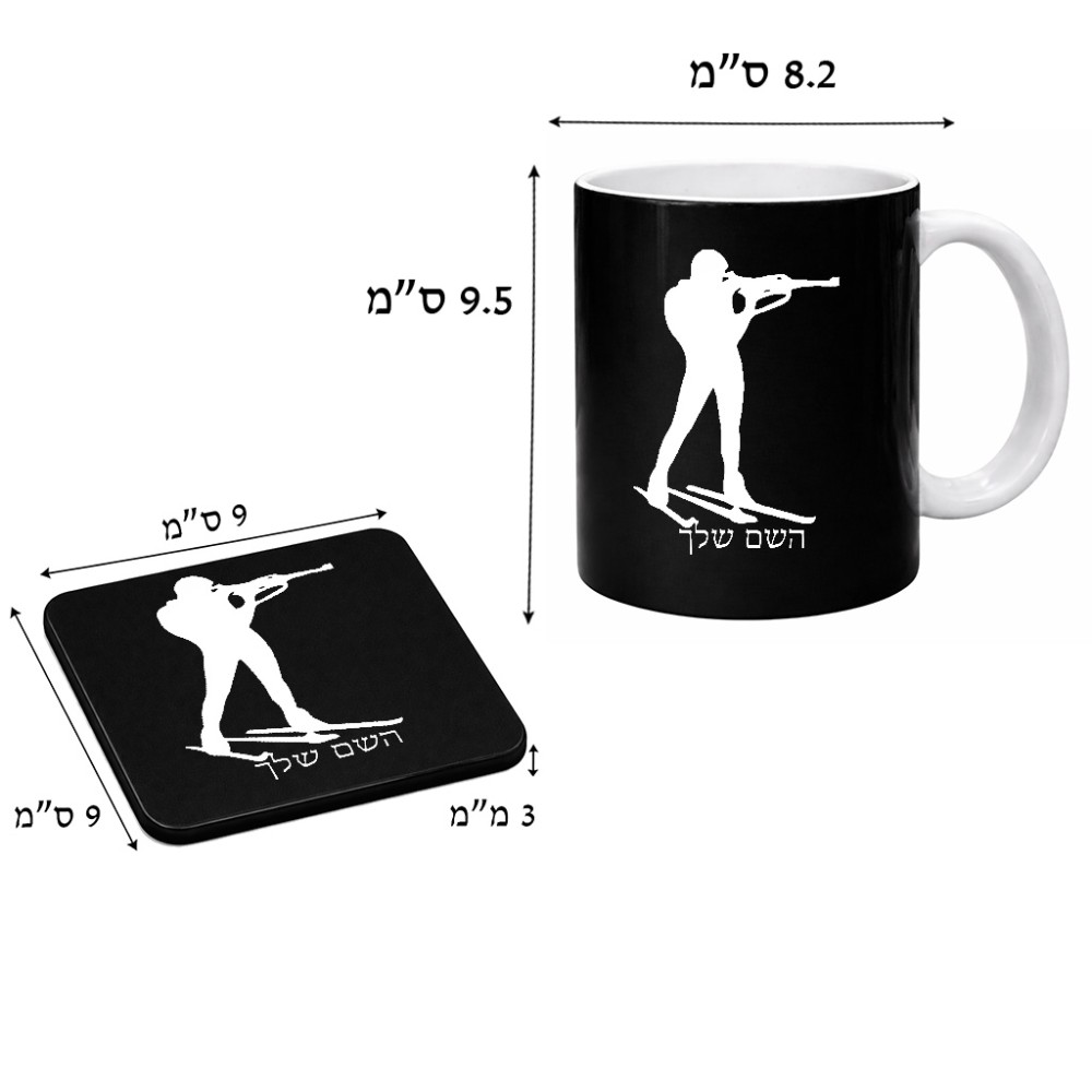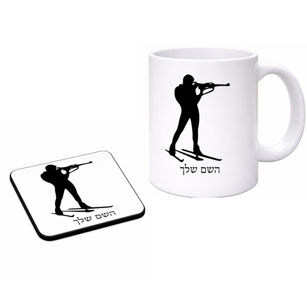 ספל תה \ קפה + תחתית מרובעת בעיצוב אישי עם השם שלך בעיצוב ביאתלון גודל הספל 325 מ"ל, הספל בעלת ידית לאחיזה יציבה, תחתית מעוצבת בגודל 9 × 9 ס"מ. את השם המבוקש ניתן לציין בהזמנה, אם לא צויין אנחנו ניצור קשר לבירור.