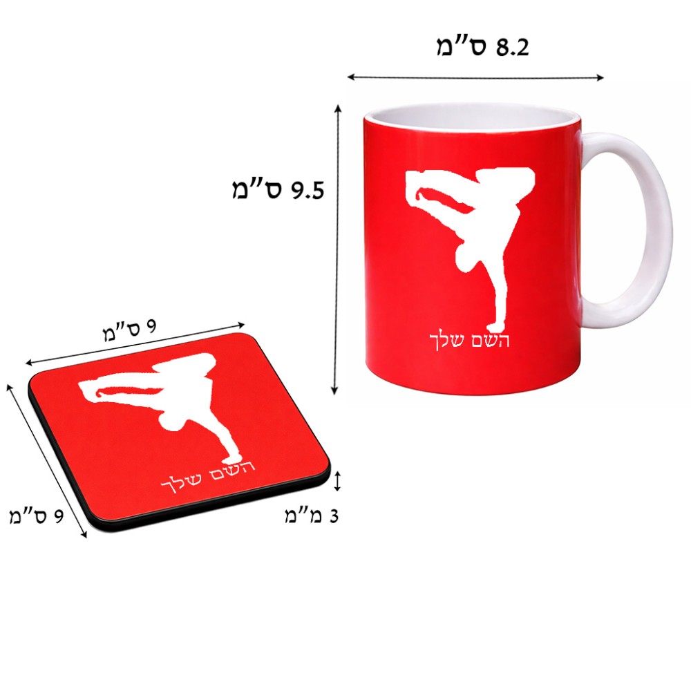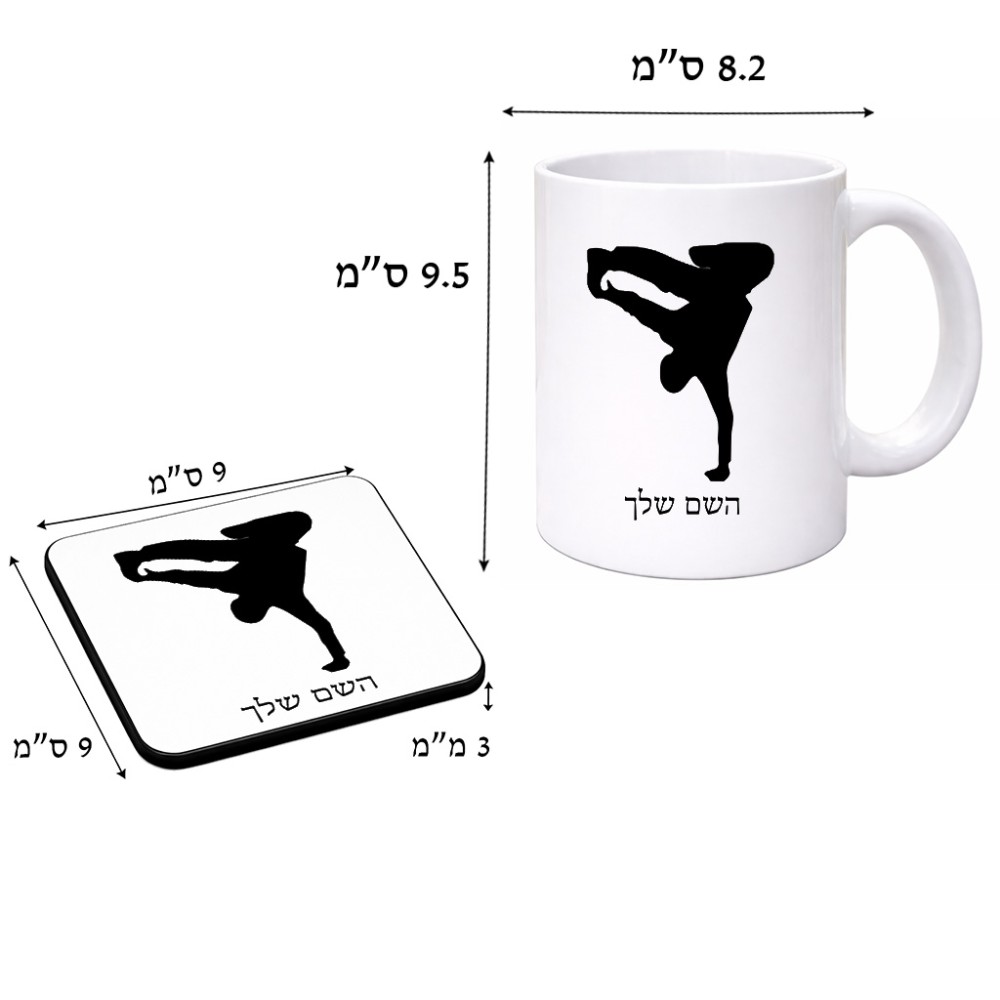 ספל תה \ קפה + תחתית מרובעת בעיצוב אישי עם השם שלך בעיצוב ברייקדאנס גודל הספל 325 מ"ל, הספל בעלת ידית לאחיזה יציבה, תחתית מעוצבת בגודל 9 × 9 ס"מ. את השם המבוקש ניתן לציין בהזמנה, אם לא צויין אנחנו ניצור קשר לבירור.