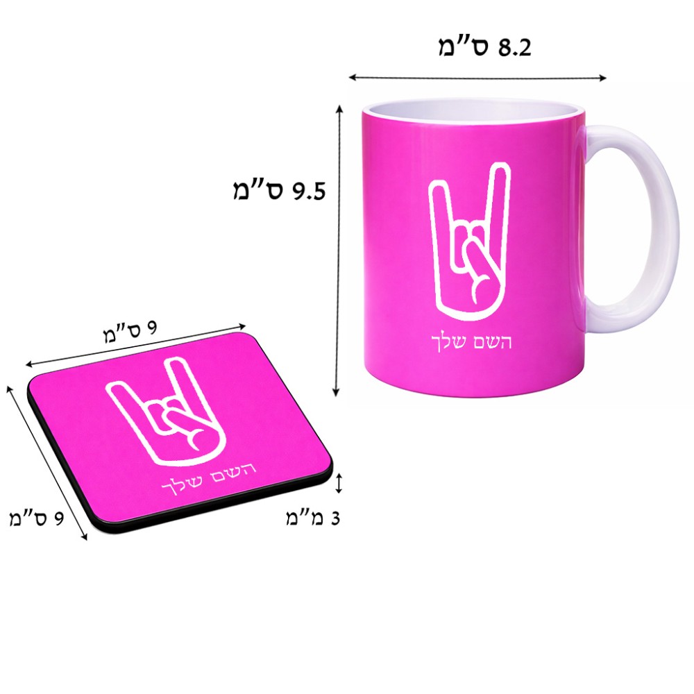 ספל תה \ קפה + תחתית מרובעת בעיצוב אישי עם השם שלך בעיצוב יד סלע גודל הספל 325 מ"ל, הספל בעלת ידית לאחיזה יציבה, תחתית מעוצבת בגודל 9 × 9 ס"מ. את השם המבוקש ניתן לציין בהזמנה, אם לא צויין אנחנו ניצור קשר לבירור.